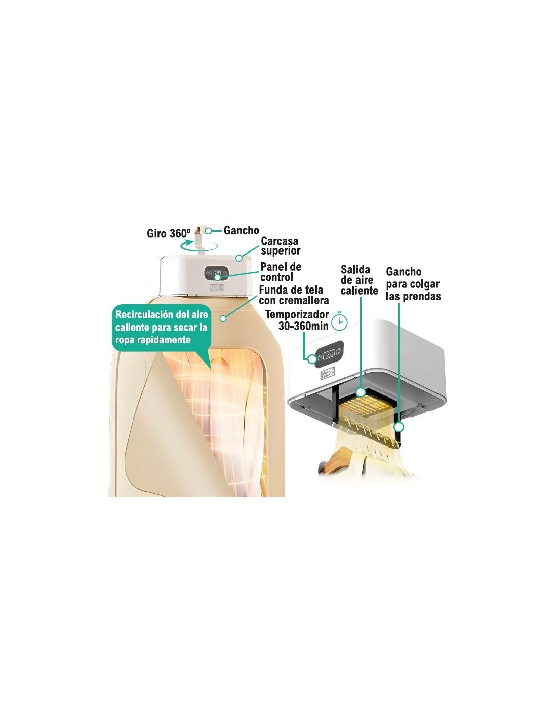 Su sistema de recirculación de aire caliente y el gancho giratorio 360° permiten un secado uniforme y eficaz. Con temporizador ajustable de 30 a 360 minutos, adapta el tiempo a cada tipo de prenda y olvídate de esperas interminables.