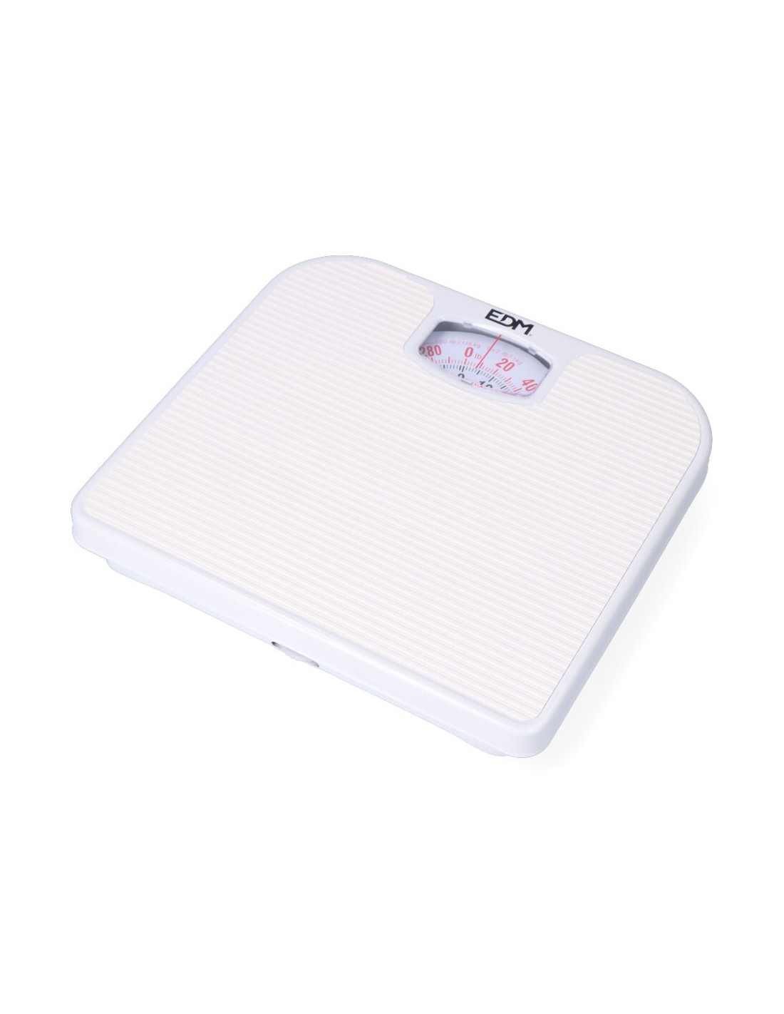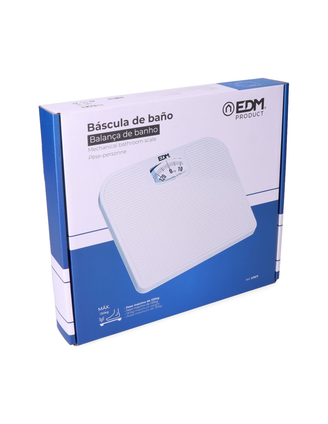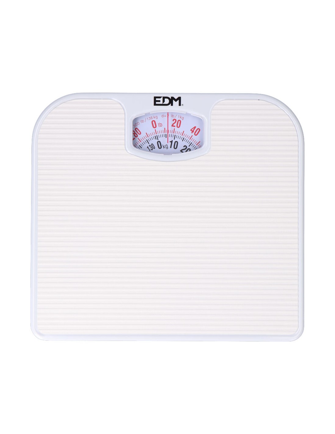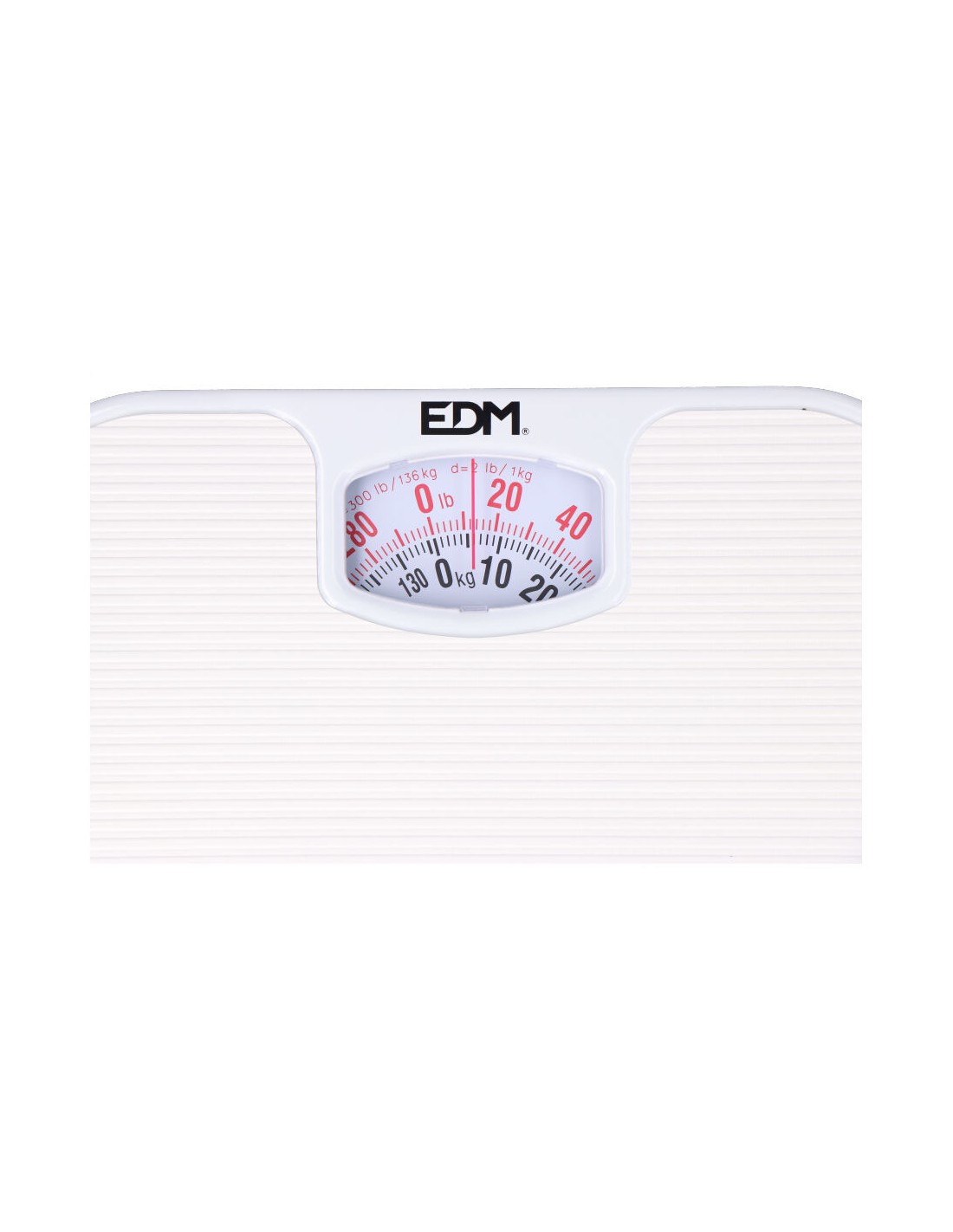 Bascula de baño mecanica max. 130kg edm superficie antideslizante. dimensiones 24,3x4x26,8 (ancho/fondo/alto). diseño resistente. peso máximo de lectura 130kg. división de lectura de 1kg.