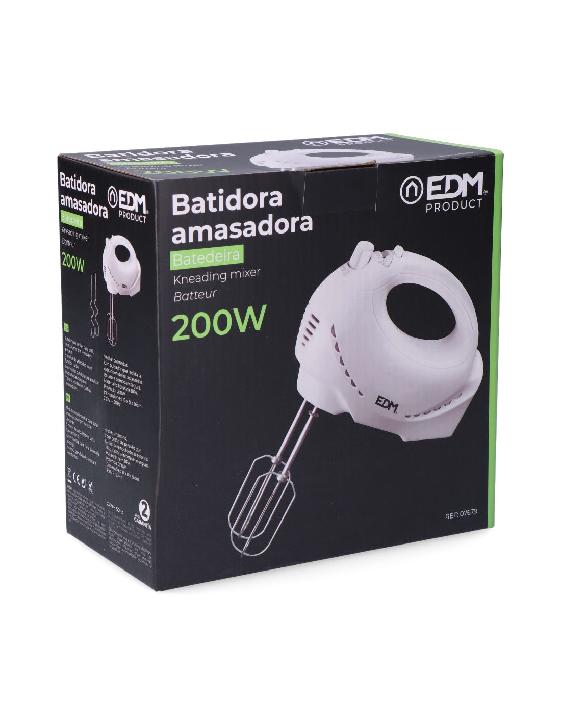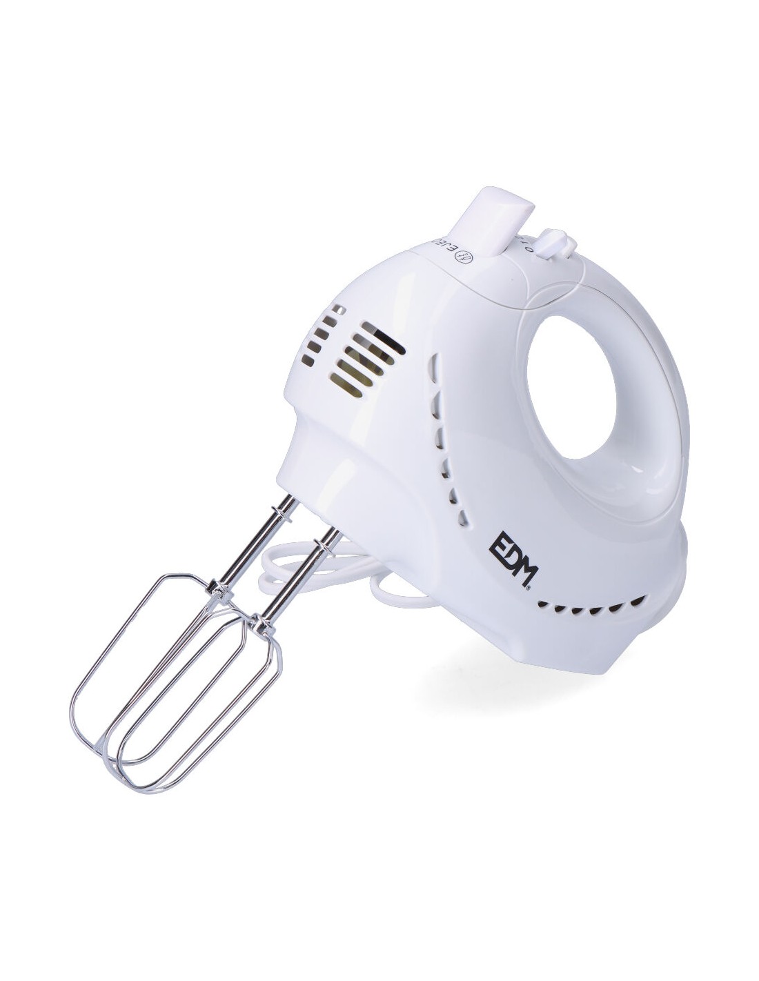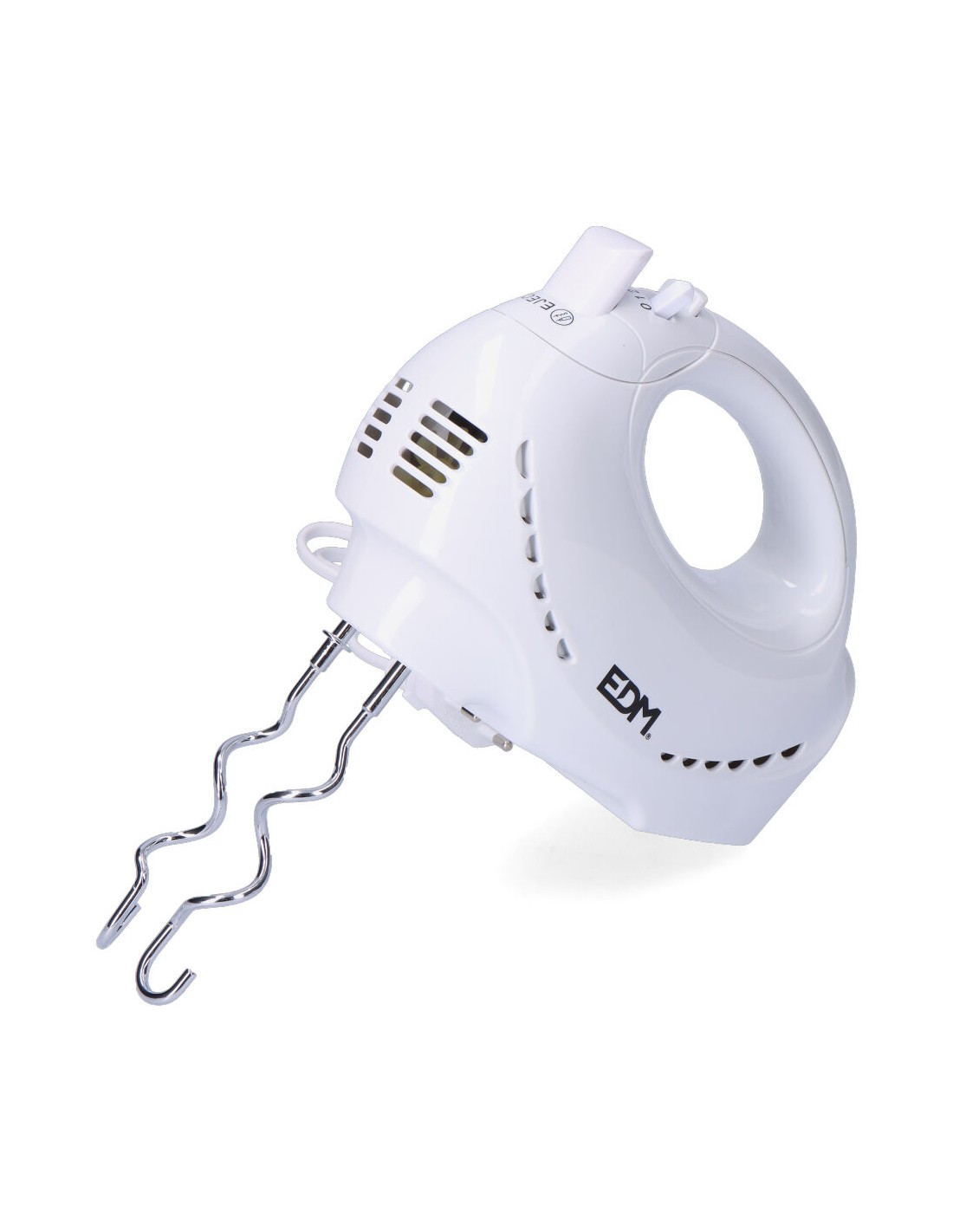 Batidora amasadora turbo. ideal para mezcla de fluidos y masas. potencia: 200w. 5 niveles de potencia + turbo. incluye: 1 juego de varillas batidoras y 1 juego de varillas amasadoras cromadas de 16,3cm. botón para expulsiar las varillas. mango ergonómico. dimensiones: 8x18x26cm (ancho/fondo/alto) 220-240v 50hz edm
