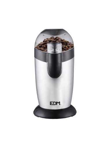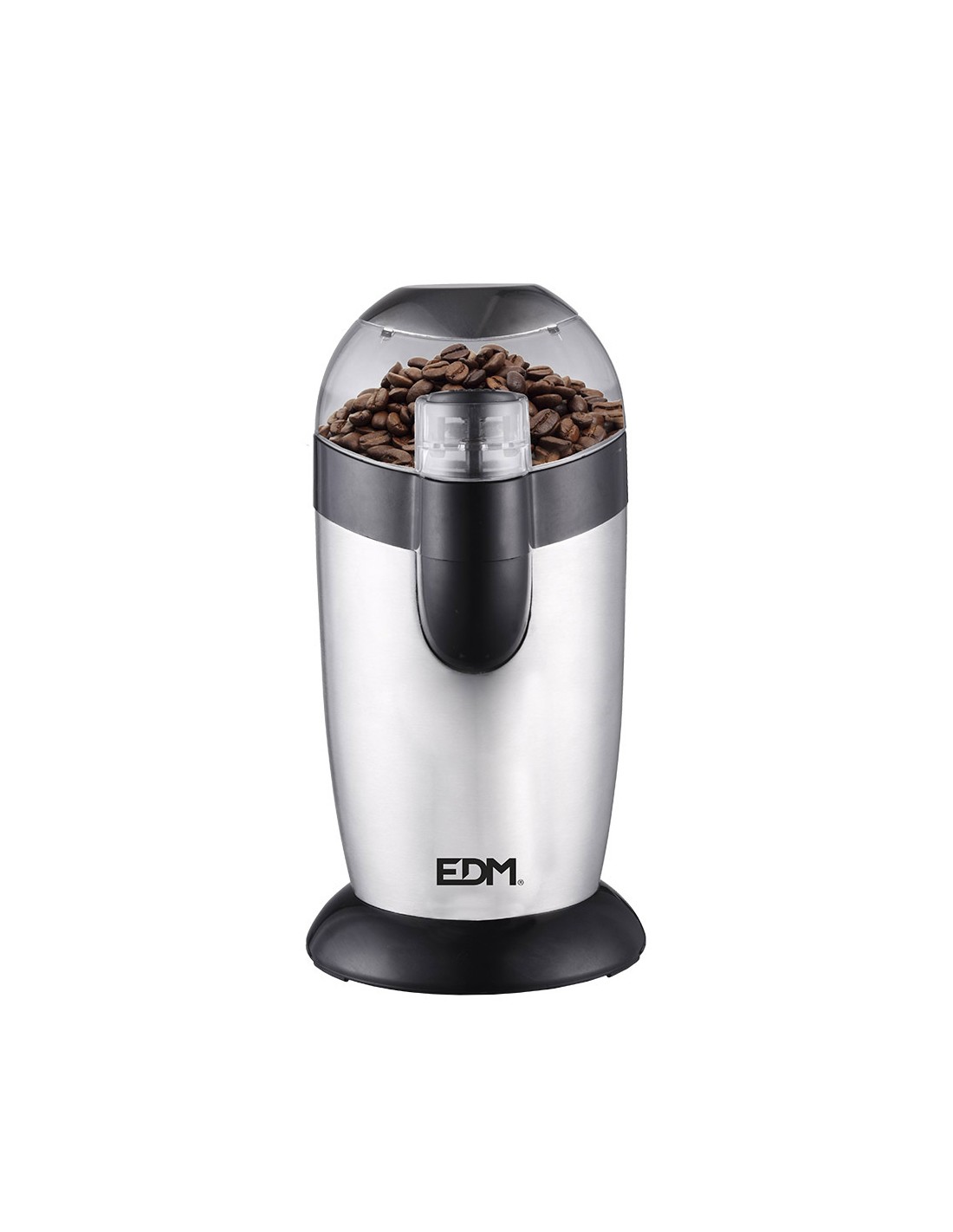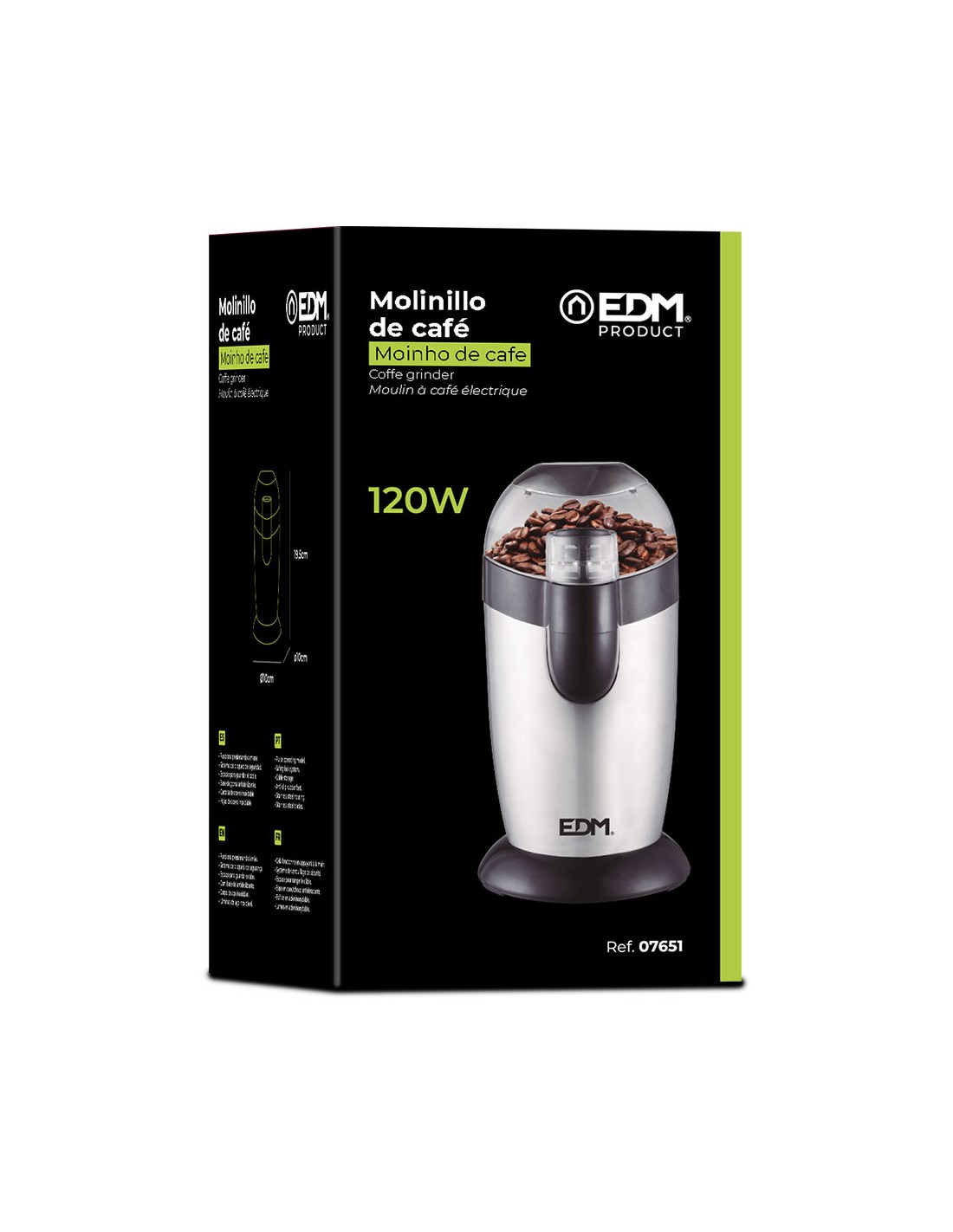 Molinillo de cafe. funcionamiento a presion. potencia: 120w. sistema de bloqueo de seguridad. espacio para guardar el cable. base antideslizante. carcasa de acero inoxidable. cuchillas de acero inoxidable. dimensiones: ø10x19,5cm (diámetro/alto) 220-240v 50hz edm