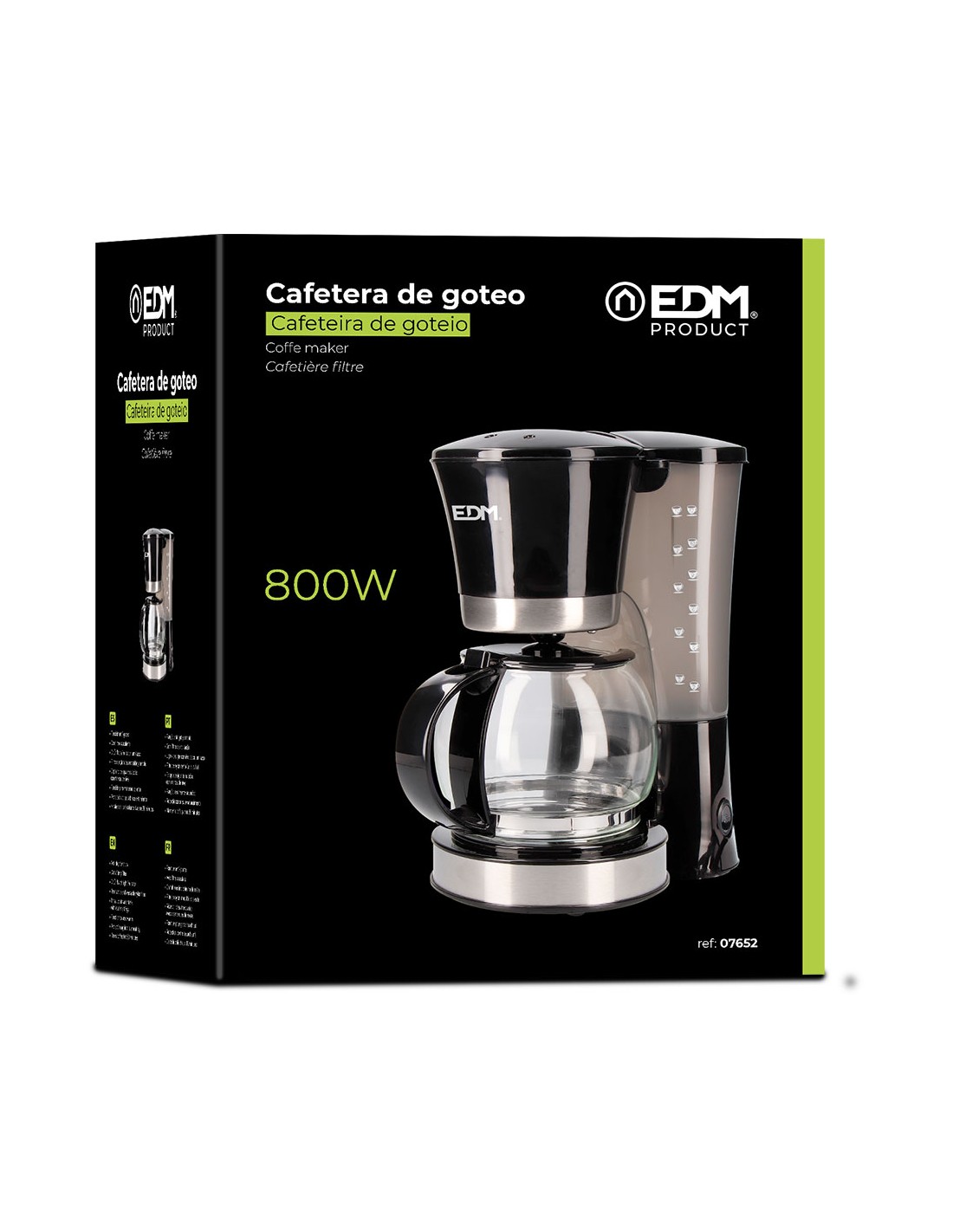 Cafetera de goteo 12 tazas 1,2l - potencia: 800w. funcion anti-goteo. filtro basculante de nylon desmontable y lavable. indicador luminoso on/off. deposito de agua traslucido con marcas de nivel. funcion de termoretencion. mantiene el cafe caliente durante 30 min. proteccion de sobrecalentamiento. dimensiones: 16,5 x 22 x 29 cm (ancho/fondo/alto) 220-240v 50hz edm