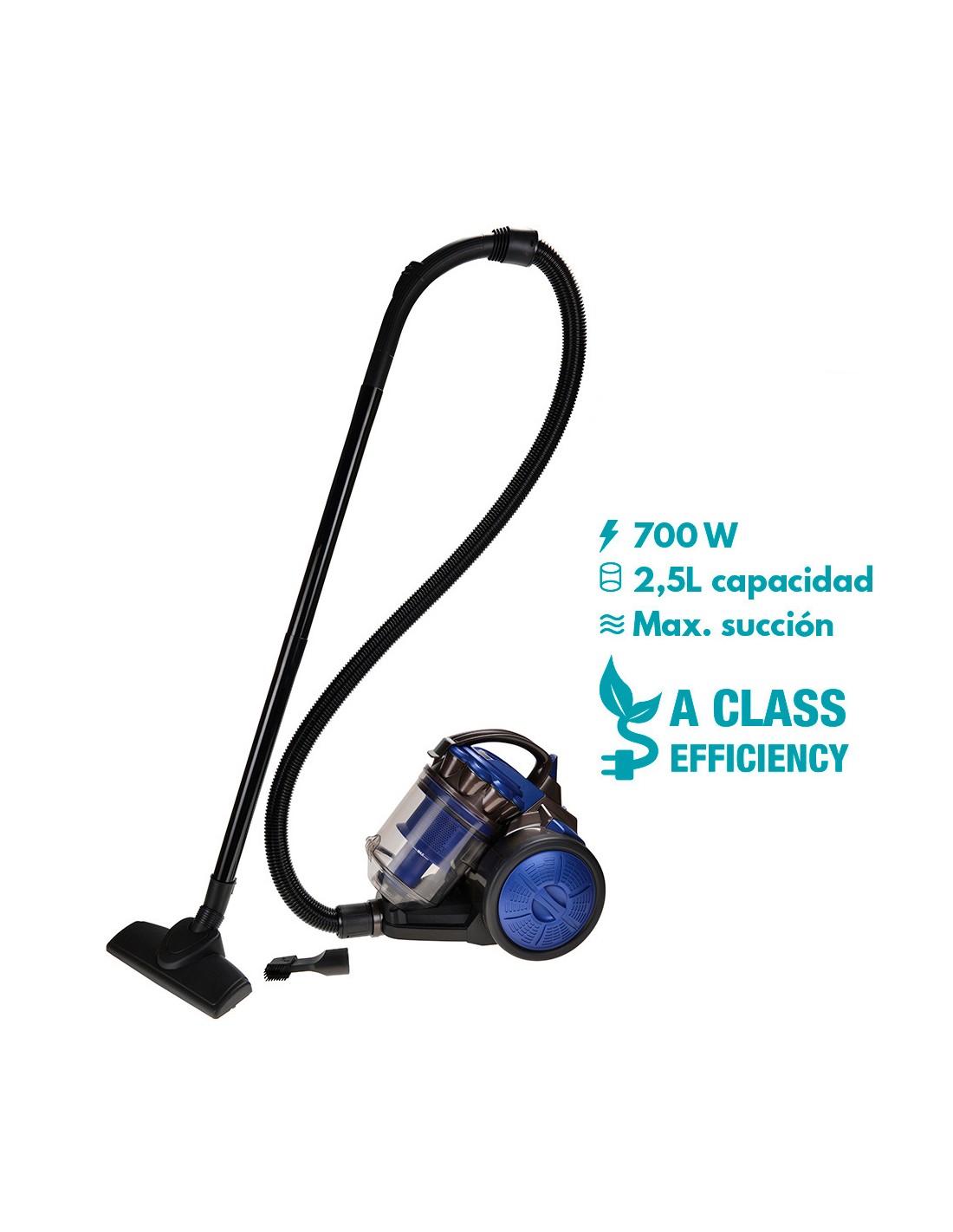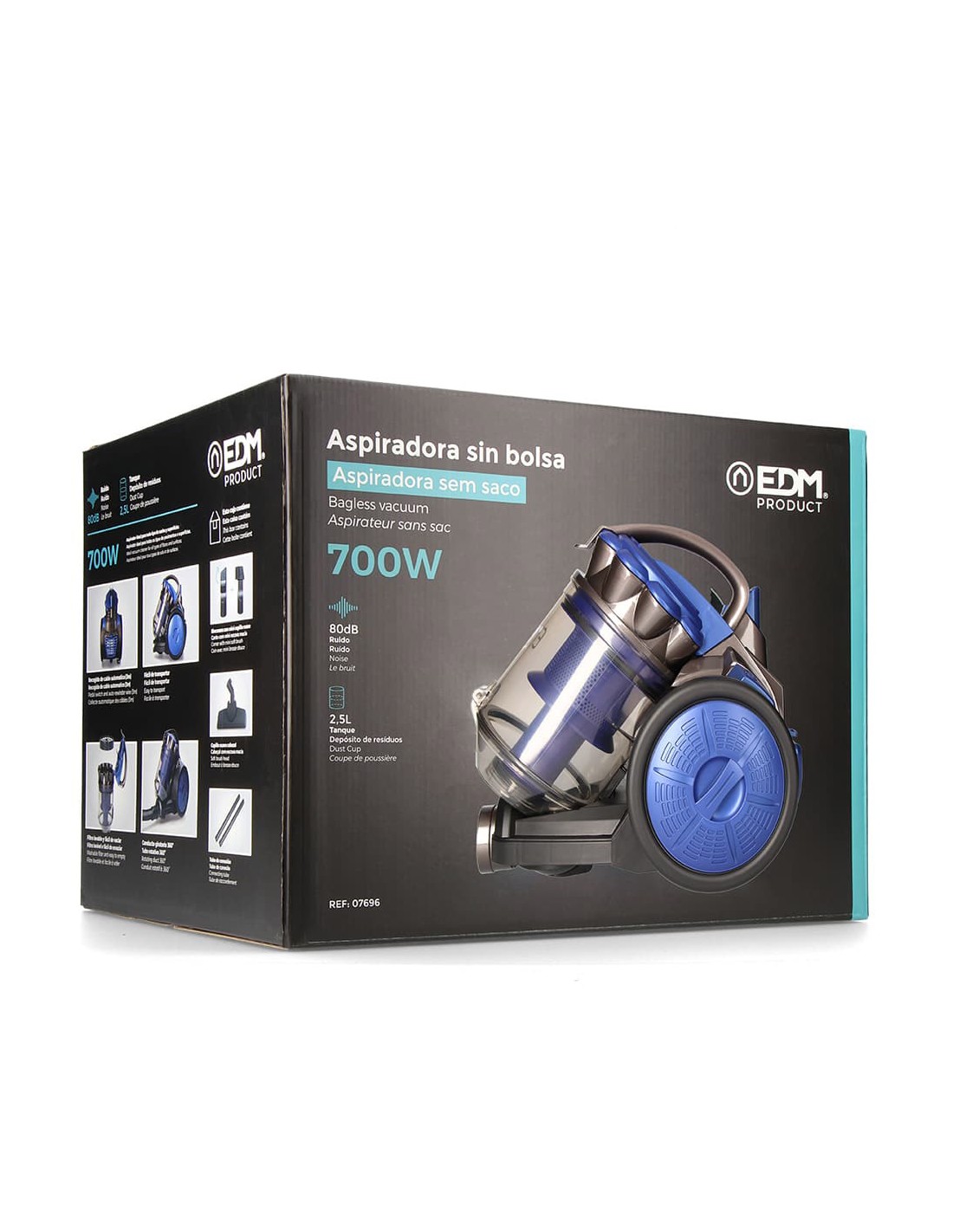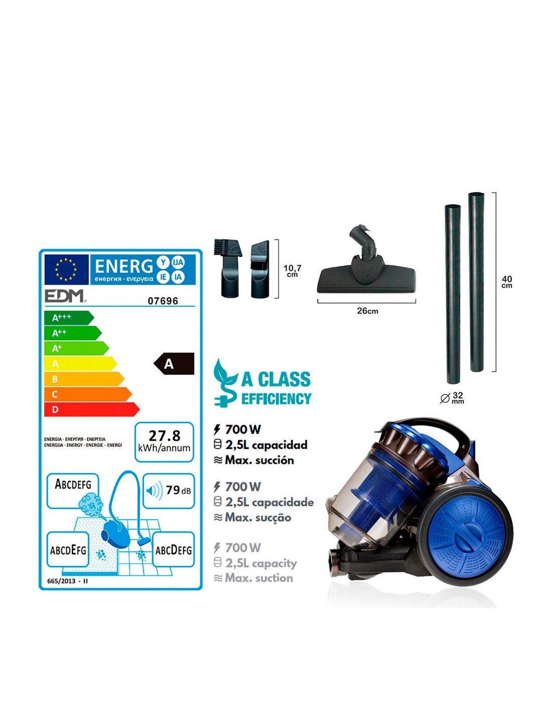 Aspiradora multiciclonico potencia: 700w. clase energetica "a". deposito: 2,5 l. 79db. 3m de cable. filtro lavable. sin bolsa. dimensiones: 24x33x29cm (ancho/fondo/alto) 220-240v 50hz edm