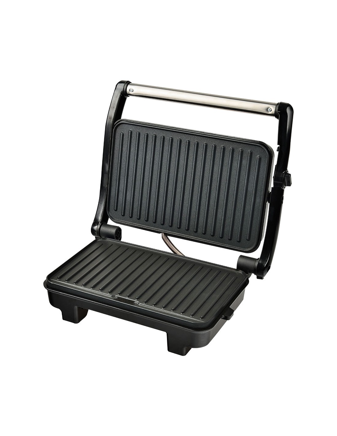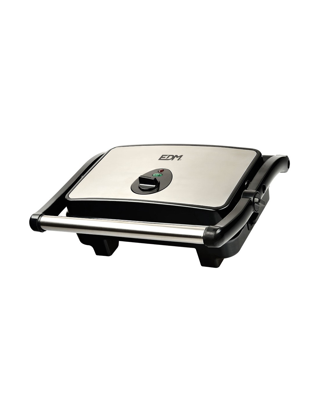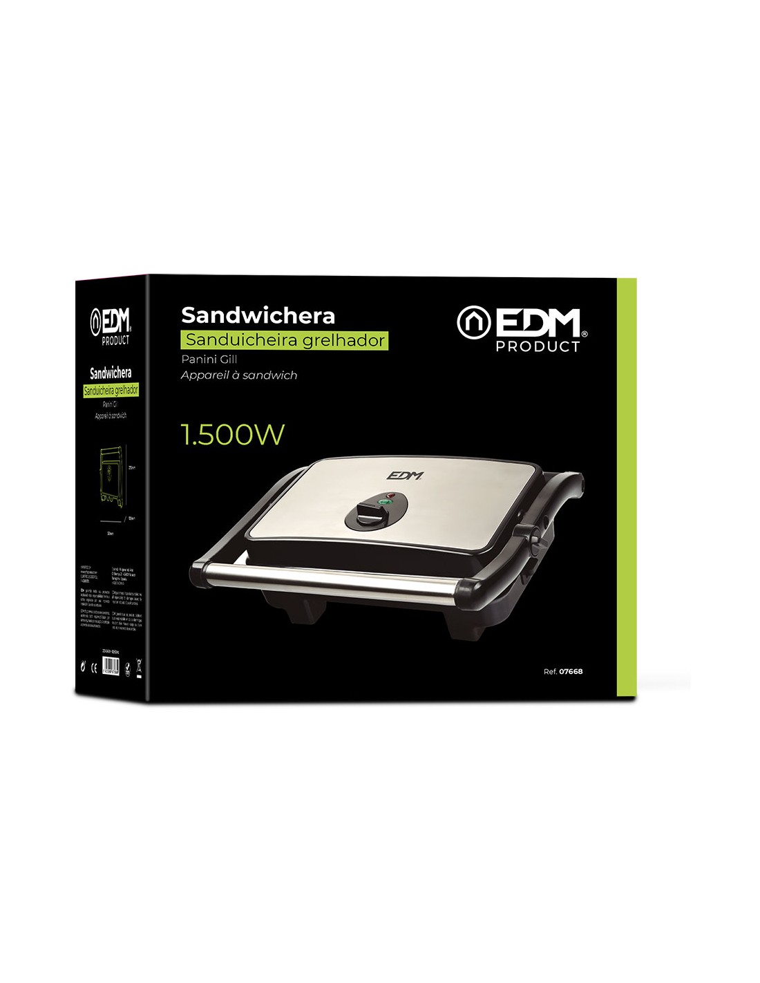 Sandwichera doble grill 1500 w. superficie y asa de toque frío. acabado en color cromado. superficie antiadherente. fácil limpieza. cierre de seguridad. control de sobrecalentamiento. medida abierta: 33 x 12,8 x 27,1cm superficie de cocción 27,2 x 17 cm. 220-240 v ~ 50 hz