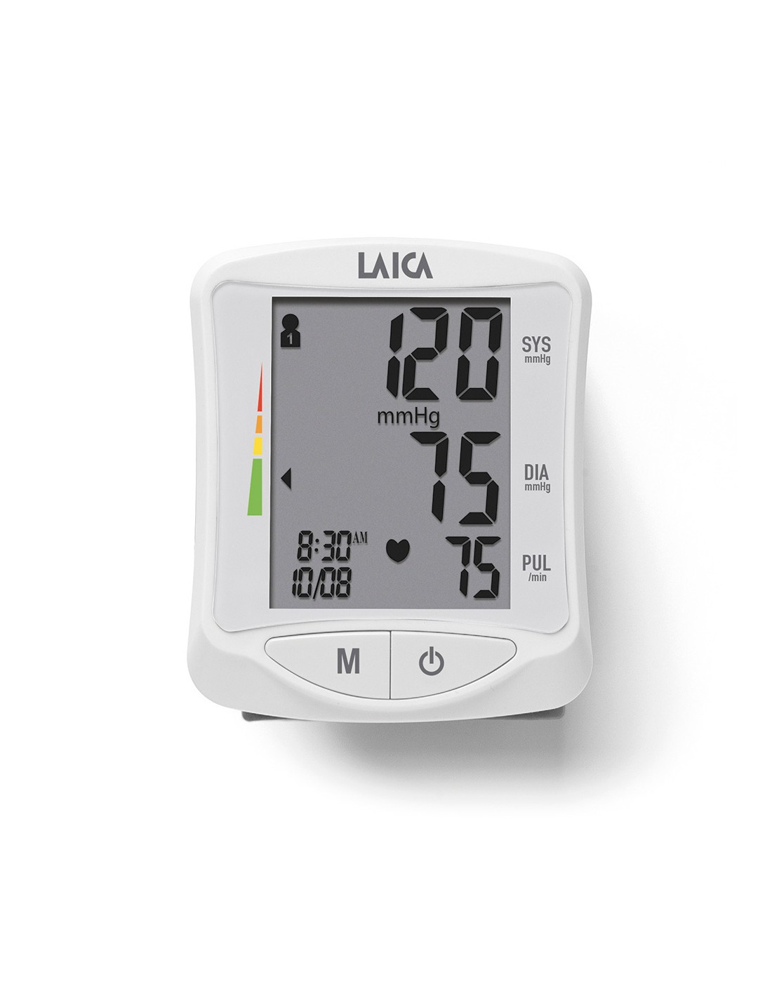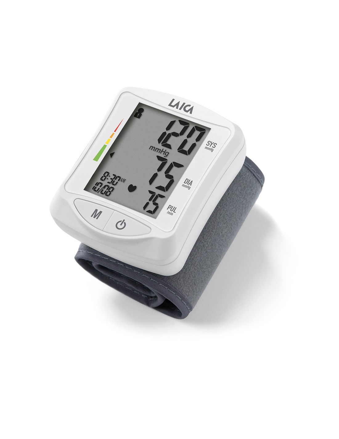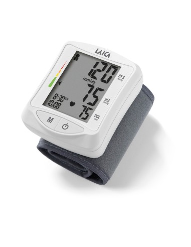 Tensiometro digital de muñeca laica bm1006 blanco este dispositivo le permite medir rapidament su presion arterial en el hogar. medicion rapida de la presion arterial sistolica y diastolica y la frecuencia cardiaca e indica cualquier arritmia 60 registros para 2 personas funda incluida gran pantalla lcd 7,7x6,2x6,5cm 180g funciona con 2xaaa incluidas