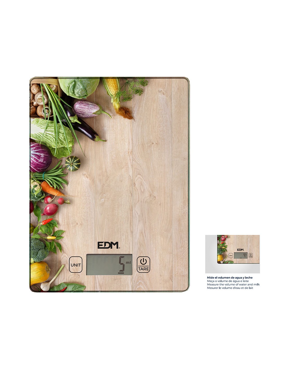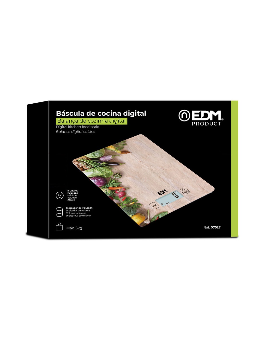 Báscula de cocina digital, mod 2, dimensiones: 19,5 x 14 cm acabado cristalizado para una mayor facilidad de limpieza, perfil ultrafino para ocupar el menor espacio posible (15 mm). división de lectura: 0,001 kg mide el volumen de agua y leche pantalla lcd con un tamaño de lectura de 4 x 1,8 cm se apagará la báscula automáticamente después de 2 min sin uso el peso máximo de lectura es de 5 kg. funciona con una sola pila cr2032 (incluida)