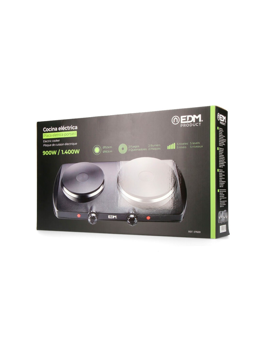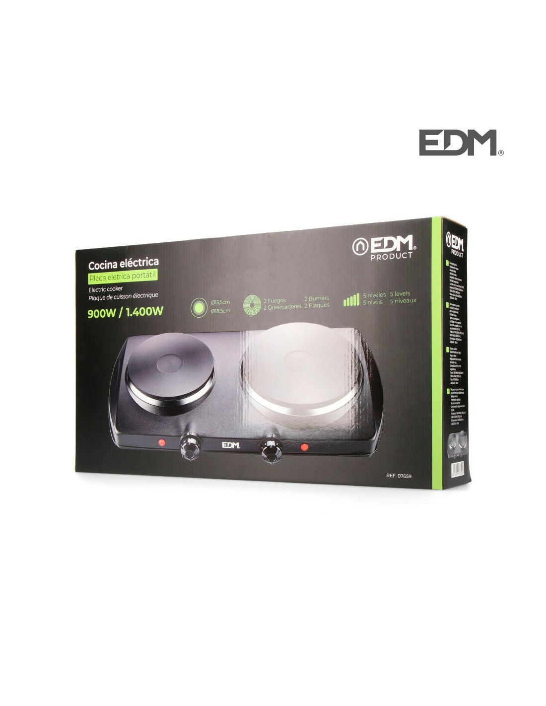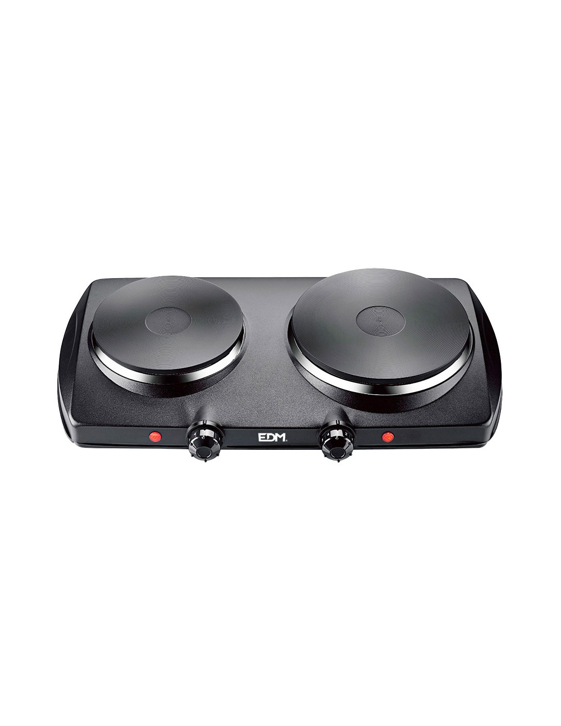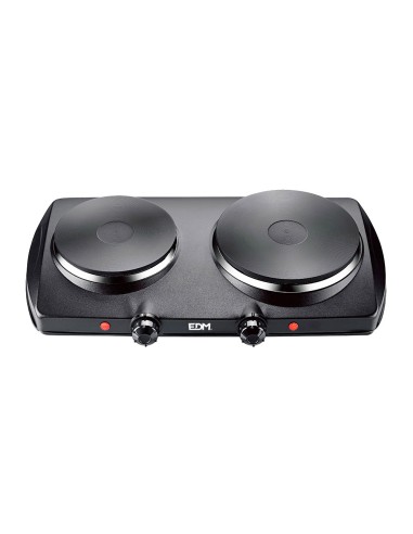 Cocina electrica negra 1400w 2 fuegos 900-1400w ce/a13. diametros de las placas: 15,5cm + 18,5cm. 5 potencias. indicador luminoso de encendido. facil de limpiar. medidas: 47x28x8,5cm (ancho/fonso/alto) 220-240v edm