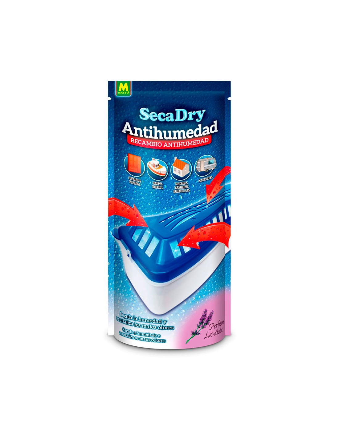Secadry antihumedad recambio 500 g. regula la humedad ambiental absorbiendo el exceso de la misma reduciéndola hasta un grado óptimo 40%-60% y destruye los malos olores. perfume lavanda