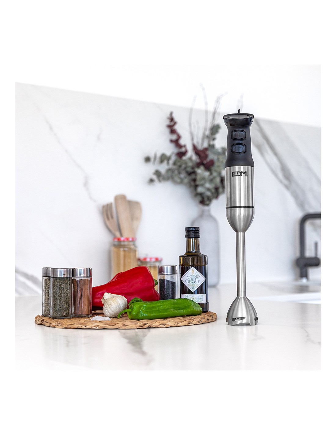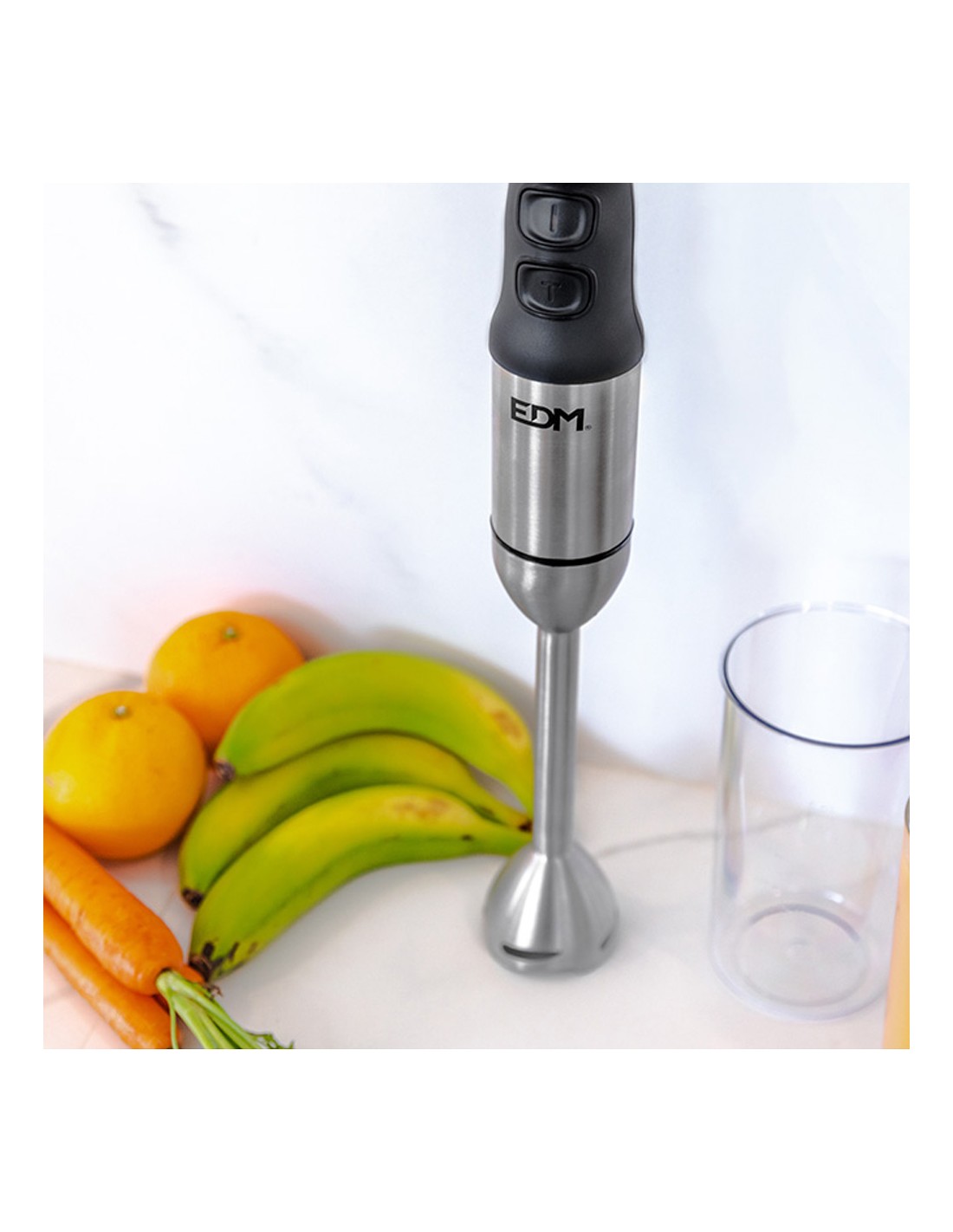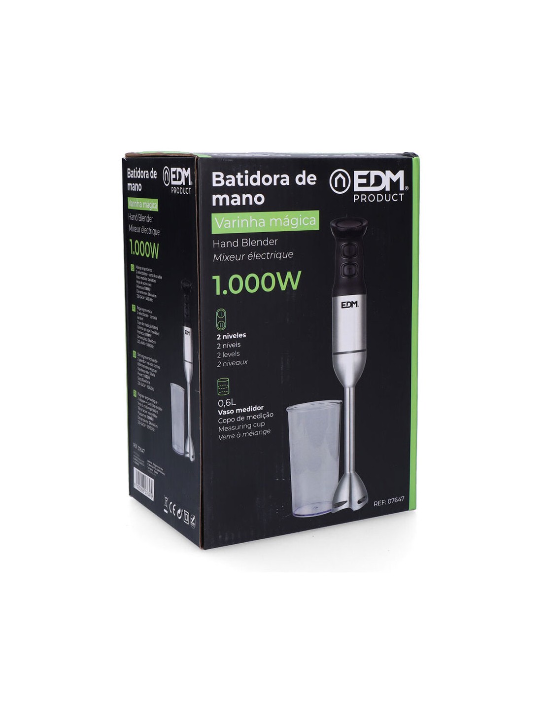 Batidora de mano. potencia: 1000w. mango ergonomico. 2 niveles de potencia + turbo. cuchillas de acero inoxidable. vaso mezclador de 600ml. dimensiones: ø5,8x41cm (diámetro/alto) 220-240v edm