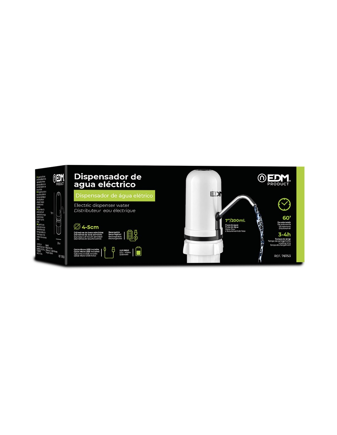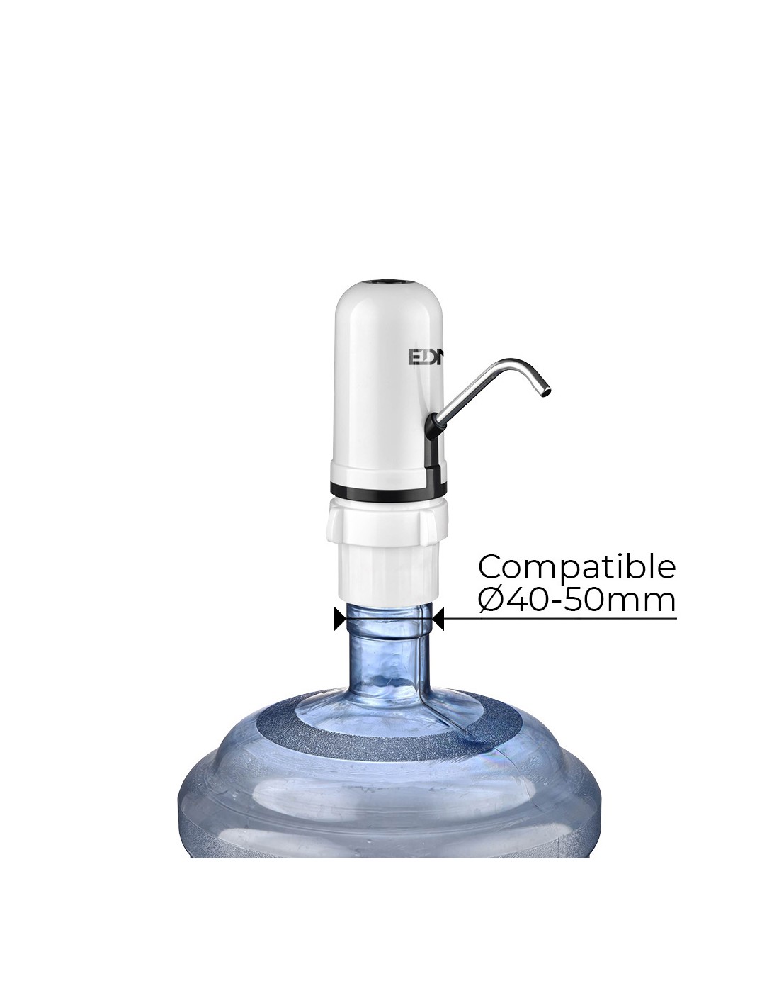 Dispensador electrónico para garrafas de agua con diámetros de boca admitidos ø4-5cm y garrafas de 20 litros. incluye: adaptador para garrafas. cable micro usb para su recarga. bateria 1.200 mah 4,4w 3,7v inr18650 (tiempo de carga: 3-4h) carga 5v1a, tiempo de funcionamiento 60 minutos despues de la carga completa. luz indicadora de carga (roja y verde). informacion de caudal: 200ml en 7 segundos. incluye tubo de 60cm. dimensiones: ø9x19cm (diametro/altura).