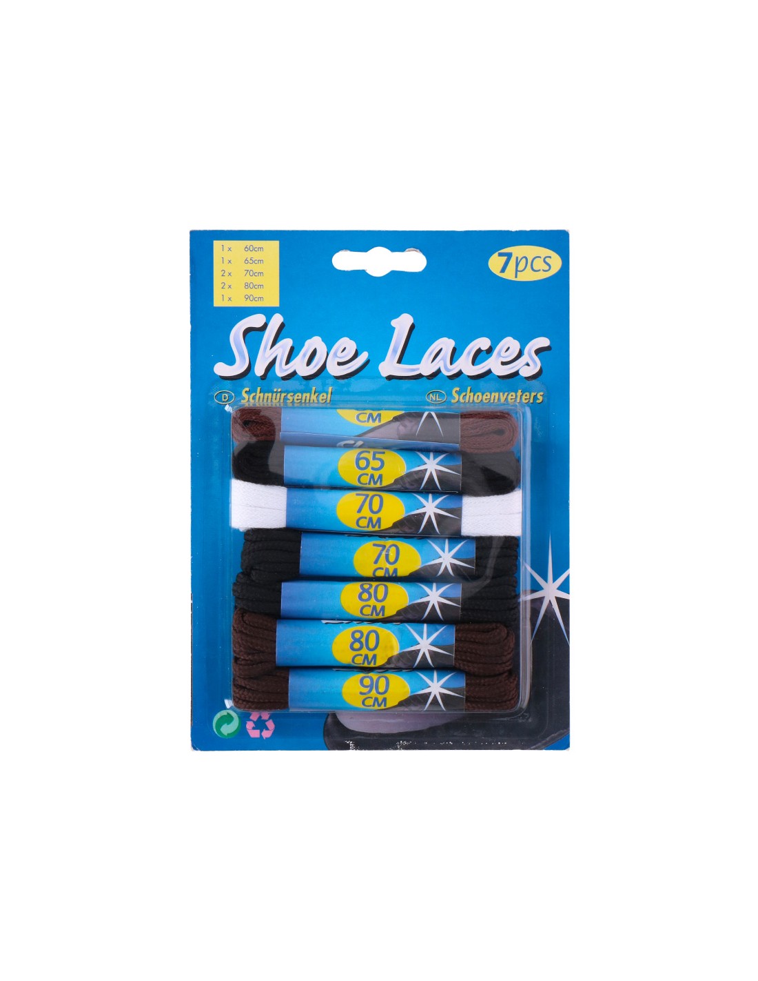 Kit cordones tallas y colores variados. 7 unidades: 1x60cm color marrón, 1x65cm color negro, 2x70cm color negro y color blanco, 2x80cm color negro y color marrón, 1x90cm color marrón