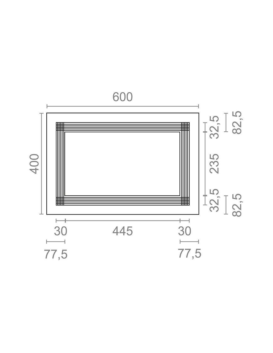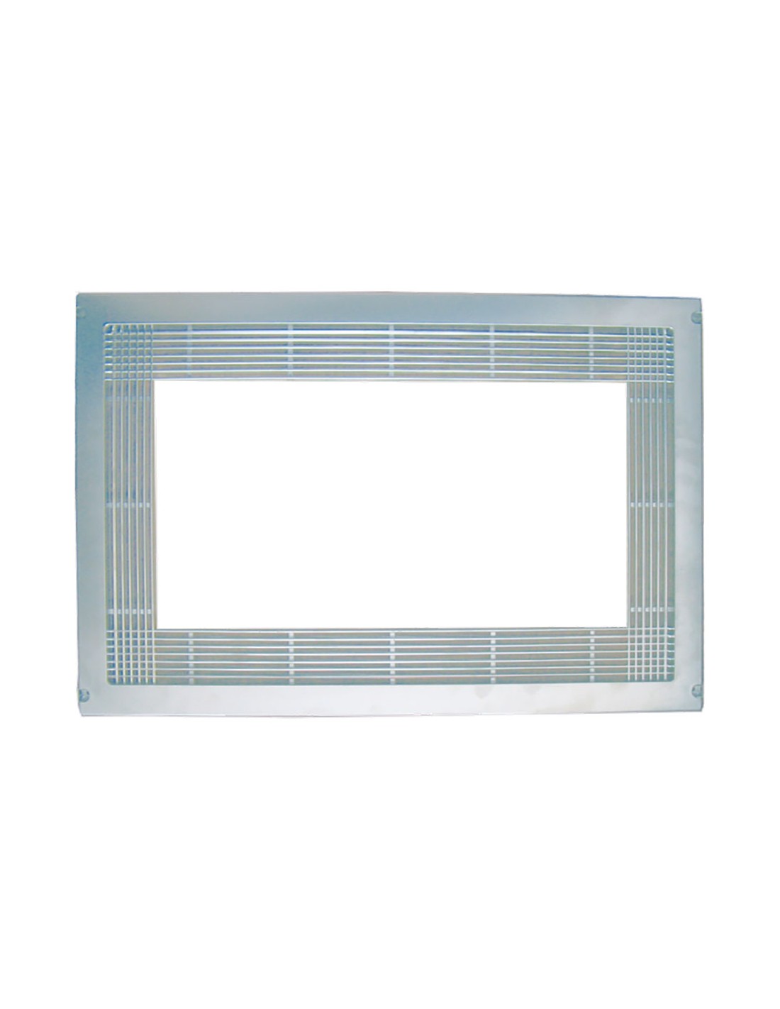 Marco microondas en abs. dimensiones: 60x3x40cm (ancho/fondo/alto). rectángulo interior de 44,5x23,5cm y de 54x33,5cm si se cortan todas las lamas. es autocortable. acabado efecto inox. micel