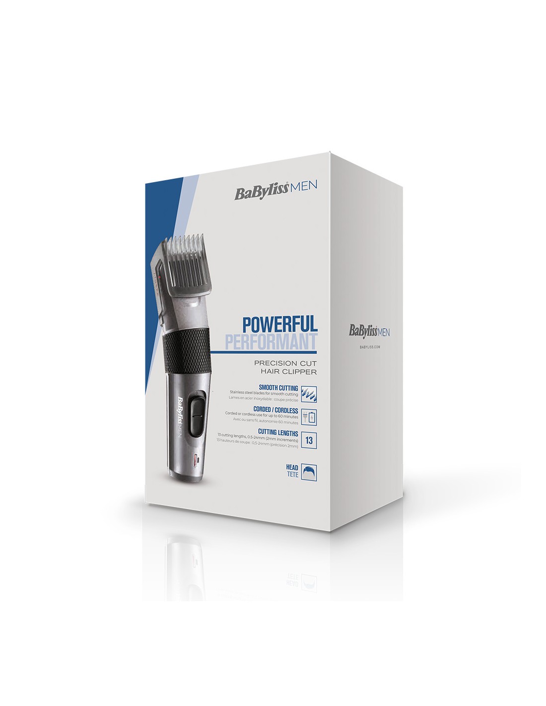Maquina corta cabellos precision cut e786e con y sin cable babyliss. cabeza 100% metálico con cuchillas de acero inoxidable. cuchillas de 40mm. uso con y sin cable. 60 minutos de autonomía, 8h de carga. 1 guia de corte de cabello. 13 longitudes de corte desde 0,5mm hasta 24mm, bolsa de almacenamiento, cepillo de limpieza, aceite lubricante. cuchillas lavables bajo el grifo. garantía de 3 años. servicio técnico propio http://www.presat.es/talleres/buscar-sat
