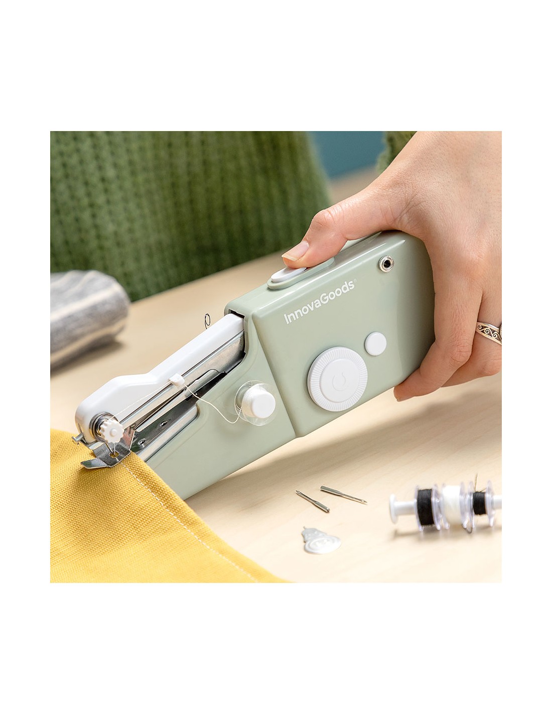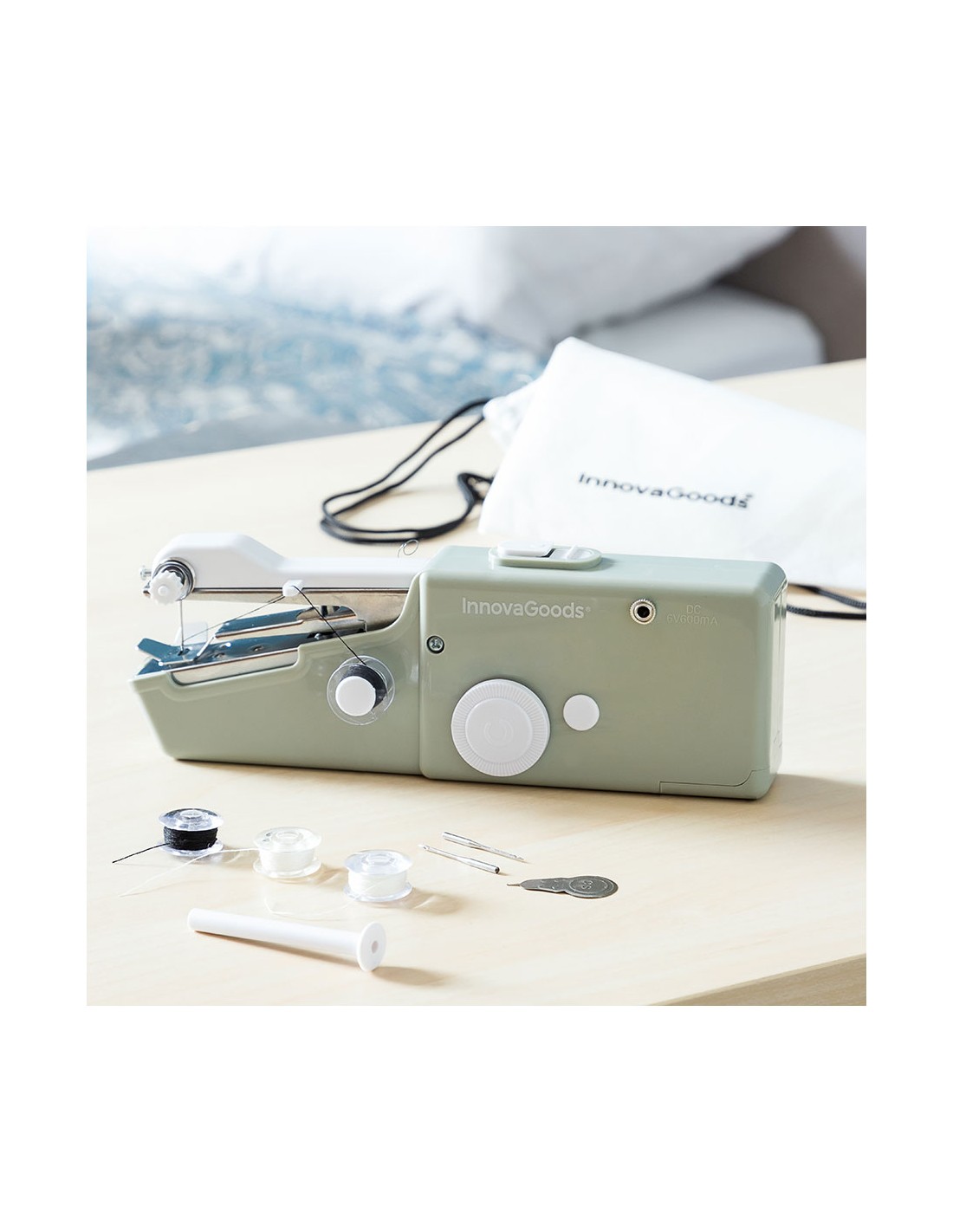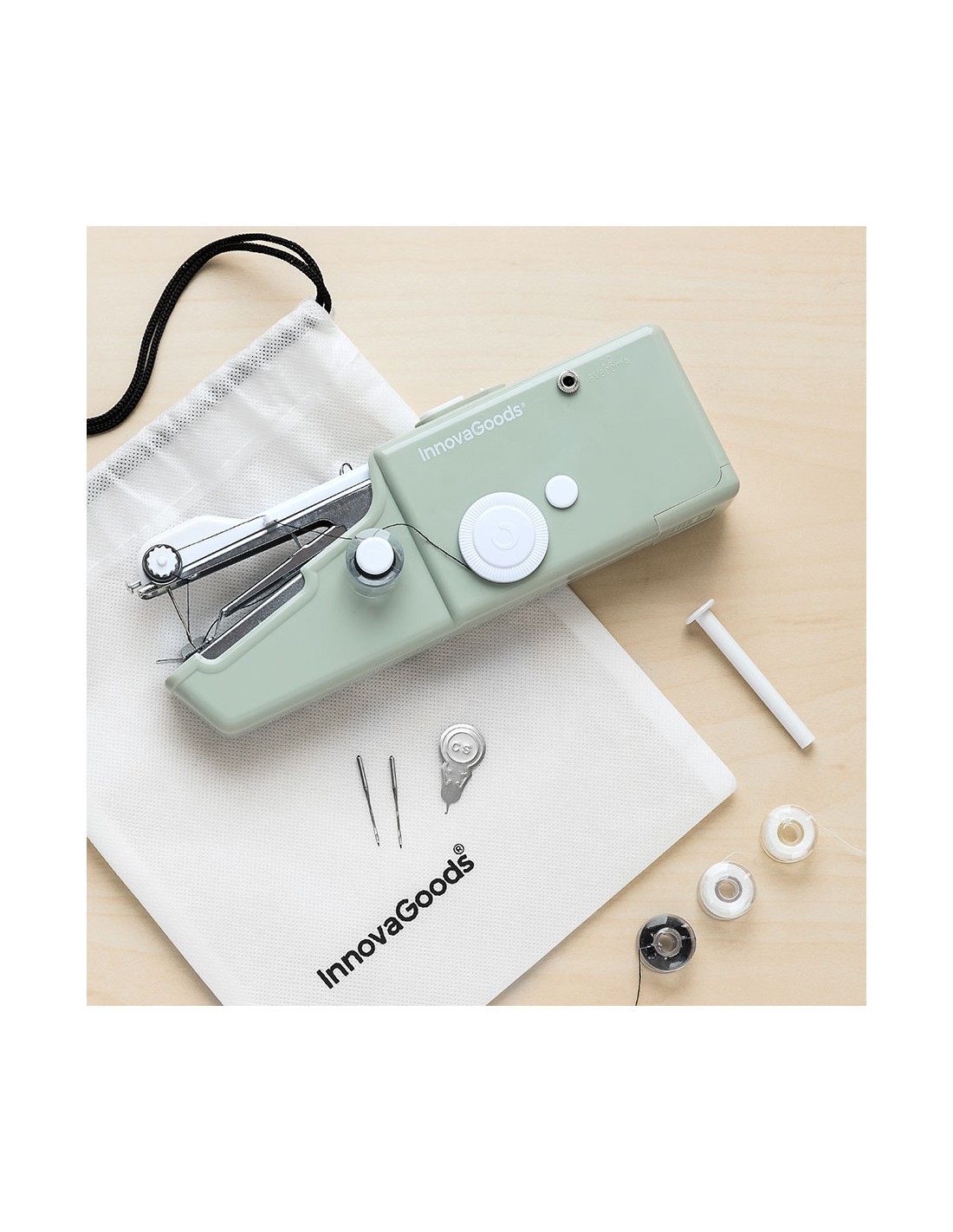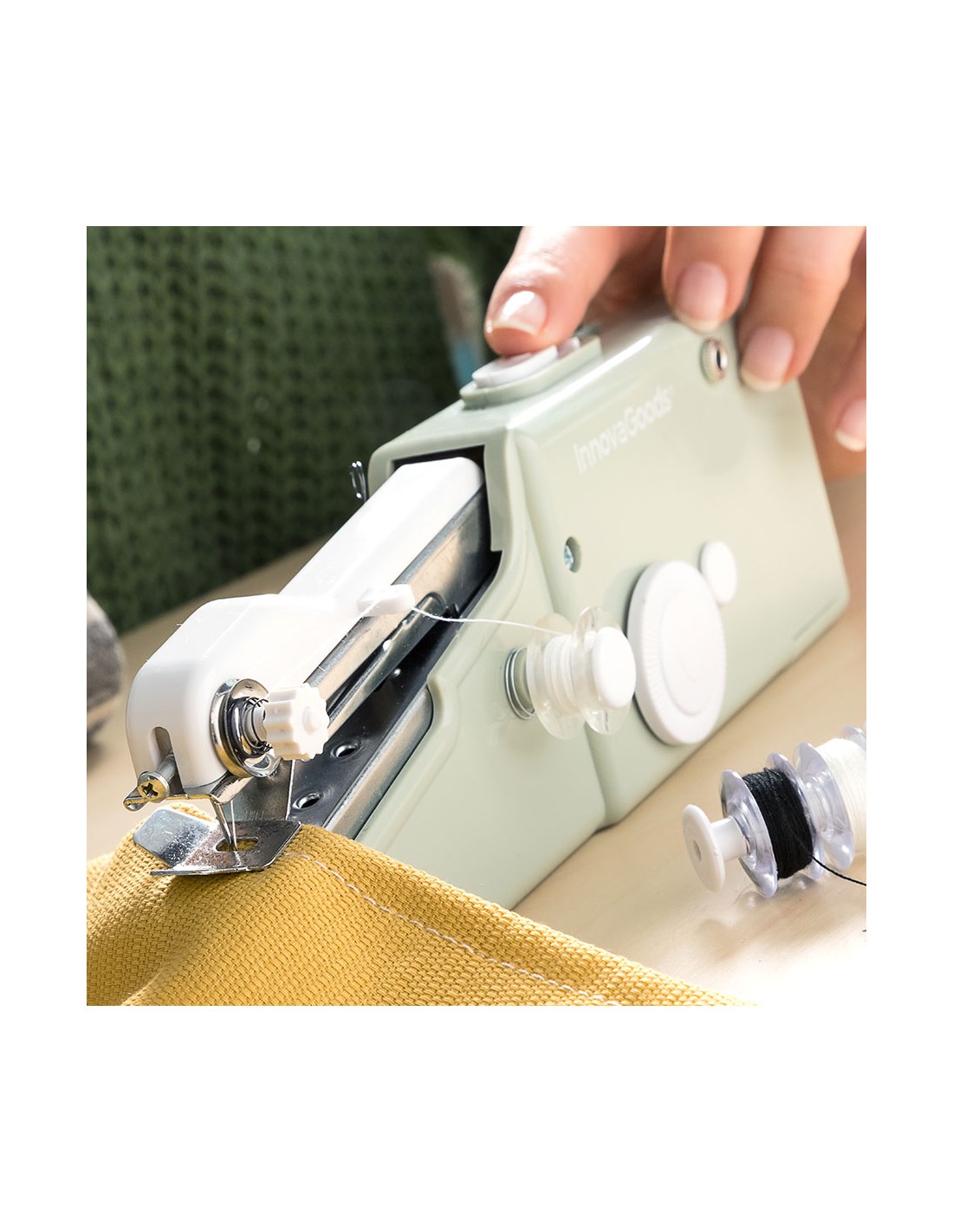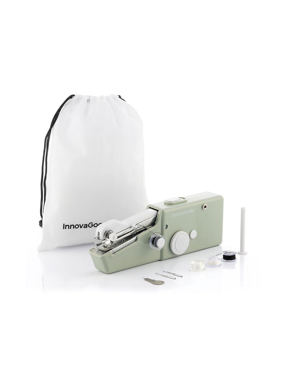 Máquina de coser de mano portátil v0103018 innovagoods. una mini máquina de coser muy cómoda práctica para efectuar costuras con rapidez y seguridad en casa, fuera o de viaje.material: abs. uso cómodo y sencillo ligero, manejable y compacto. apto para todo tipo de telas: grosor 1,8mm máx. incluye: huso, enhebrador, 3 agujas, 4 bobinas de hilo y bolsa de transporte. funcionamiento: pilas 4xaa adaptador dc 6v (no incluidos).