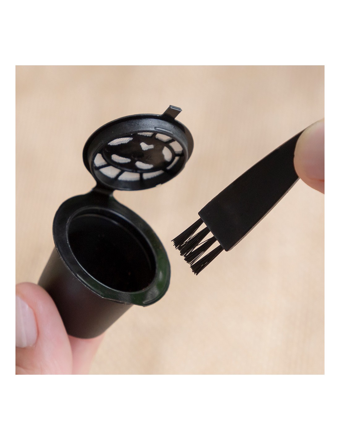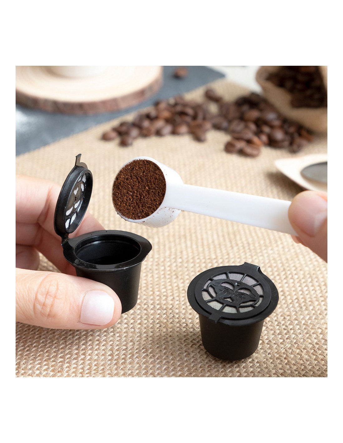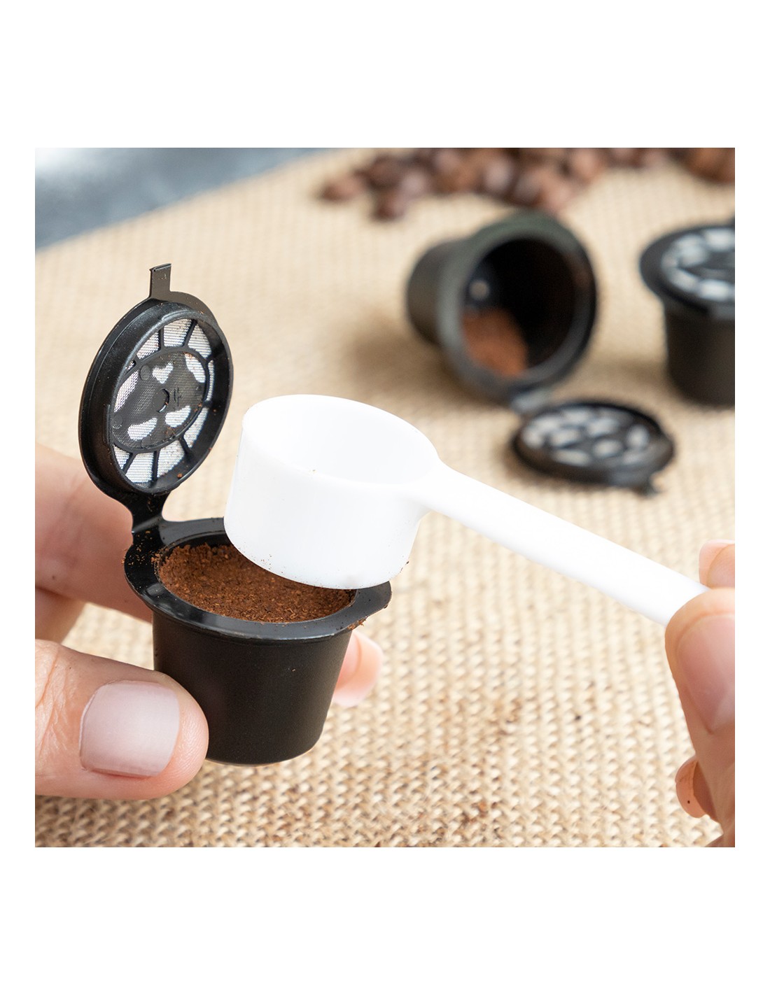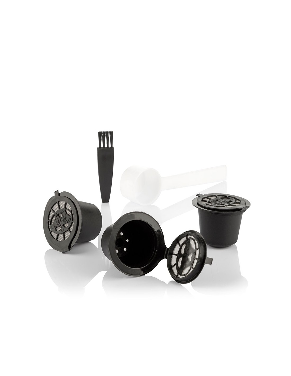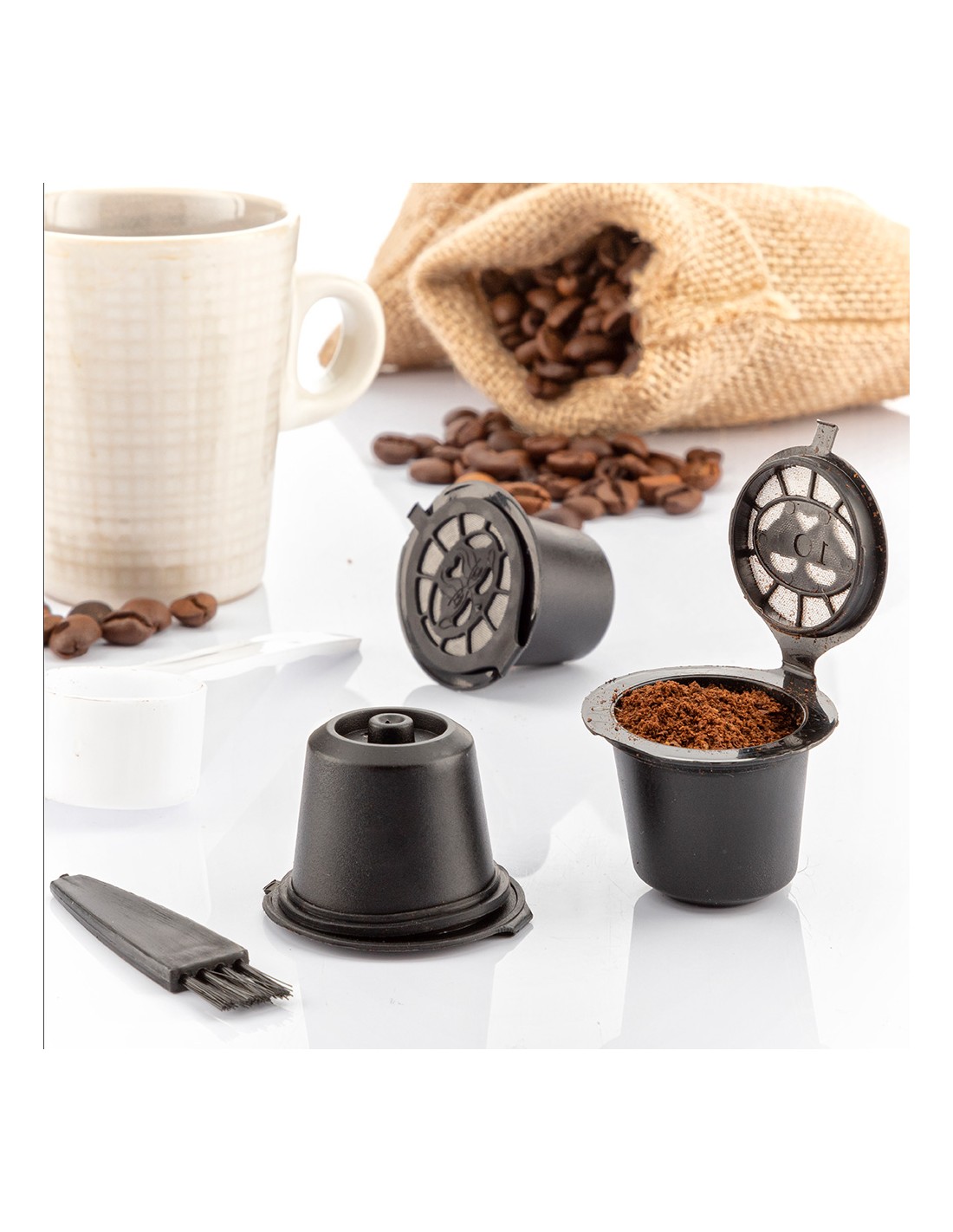 Set de 3 cápsulas de café reutilizables recoff innovagoods. perfecto para disfrutar del buen café sin agredir el medio ambiente, ya que su uso reduce considerablemente los residuos que originan las cápsulas convencionales desechables. el set incluye una pequeña cuchara para depositar el café dentro de la cápsula y prensarlo según la intensidad deseada. también incluye un pequeño cepillo para facilitar la limpieza de la cápsula. estas prácticas cápsulas de café son lavables y muy fáciles de usar, sólo hay que seguir las indicaciones del manual de instrucciones incluido. cada cápsula tiene una vida útil de 50 usos aproximadamente. además, son muy ligeras y apenas ocupan espacio, por lo que se llevan y se guardan con facilidad en cualquier parte (en la cocina, en la oficina, etc.). compatibles con cafeteras de cápsulas nespresso. material: pp, silicona, ss 304, color: negro. medidas aprox.: ø3,9x3cm.