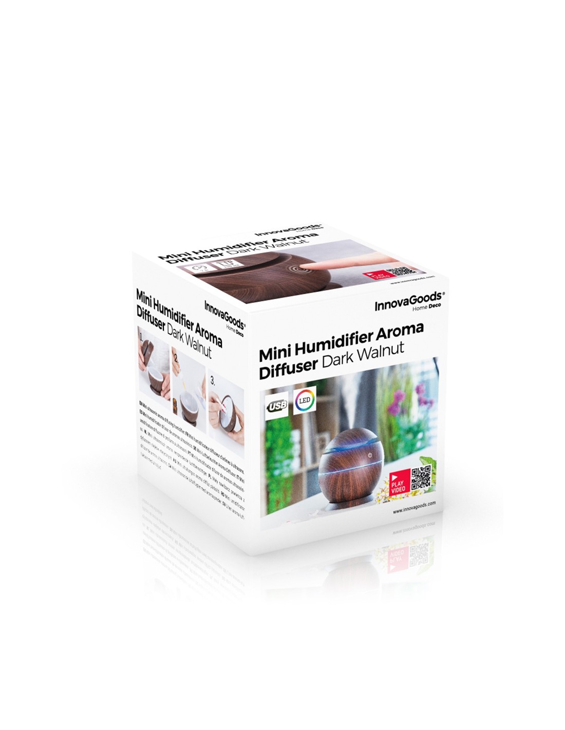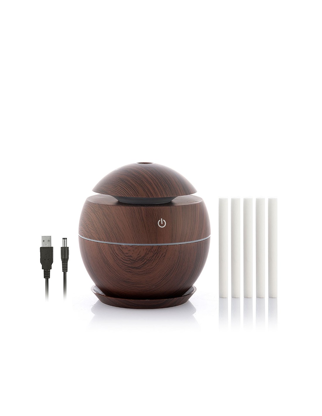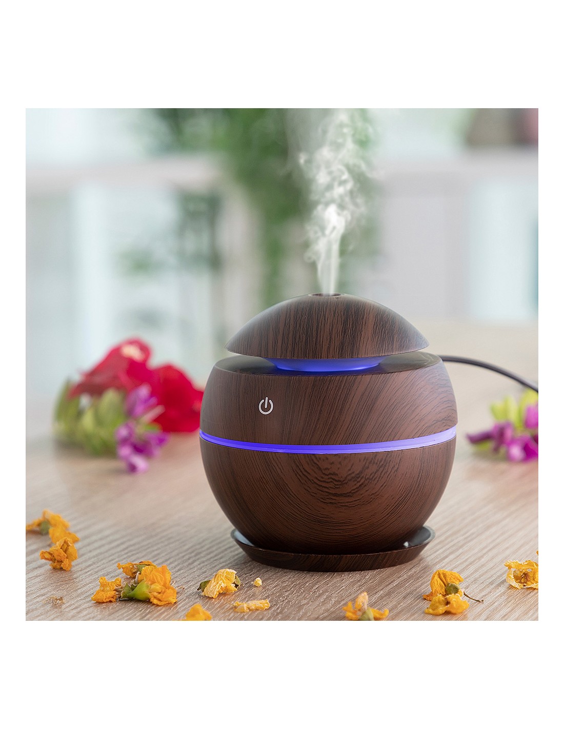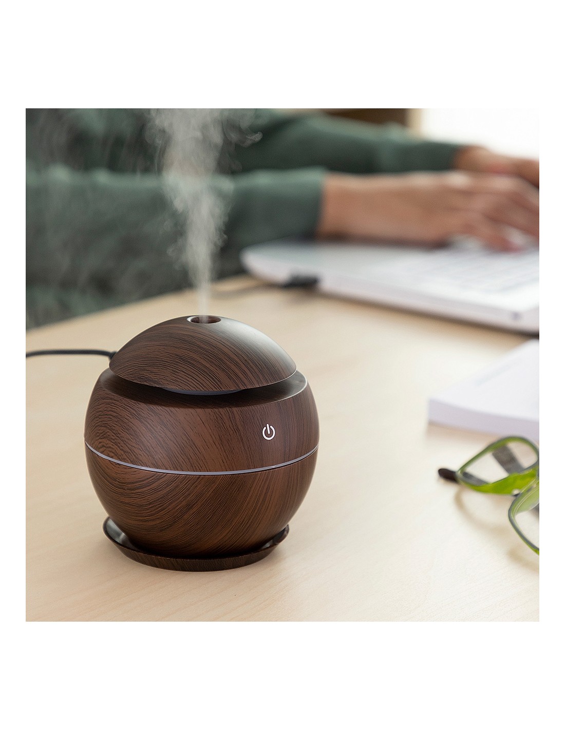 Mini humidificador difusor de aromas dark walnut innovagoods. mejora la calidad del aire y aromatiza el ambiente. material: abs, botón táctil: on/off, capacidad: 130ml, ultrasónico silencioso, secuencia led multicolor, larga duración: 7h, pulverización: 30ml/h 500ma/5v/2w, funciona con conexión usb (incluye cable dc-usb), apagado automático al agotarse el agua, no incluye aceites esenciales, medidas aprox.: ø10x10cm (diámetro/alto)