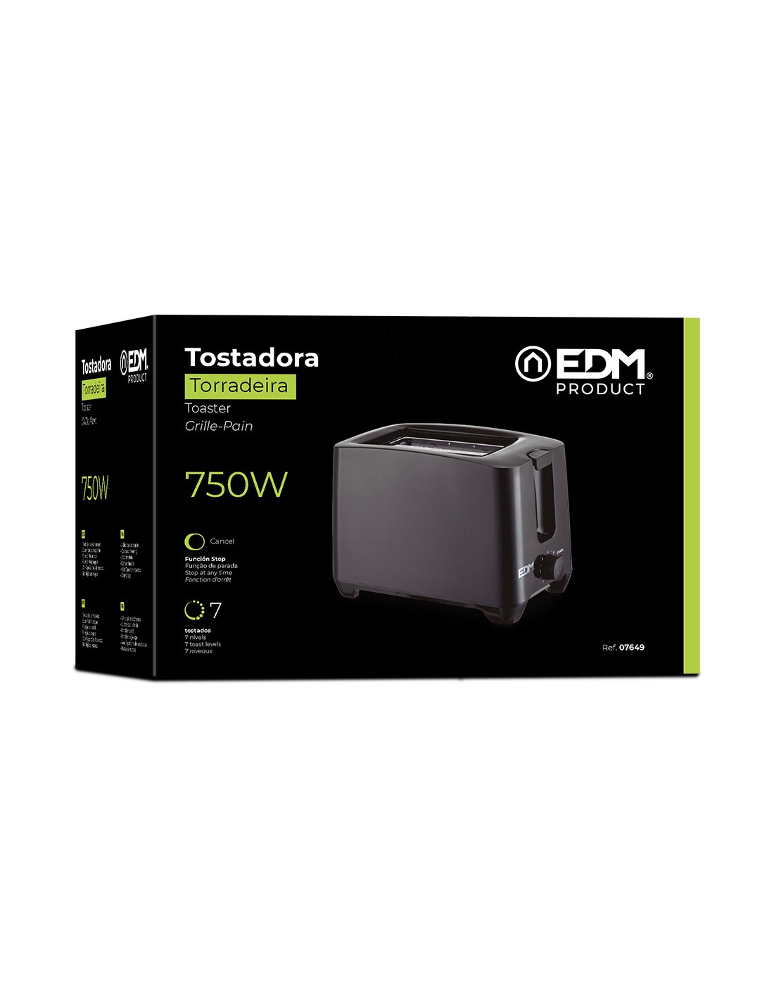 Tostadora doble ranura black design potencia: 750w color negro, superficie de toque frio función de parada 7 posiciones de tostado, función descongelar, bandeja recogemigas dimensiones: 25x14x17,2cm (ancho/fondo/alto)