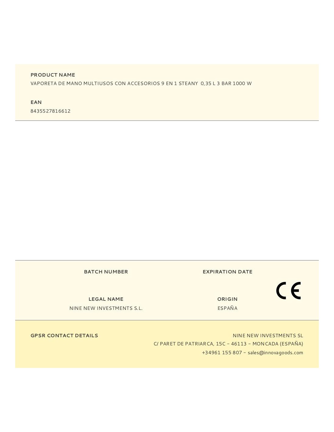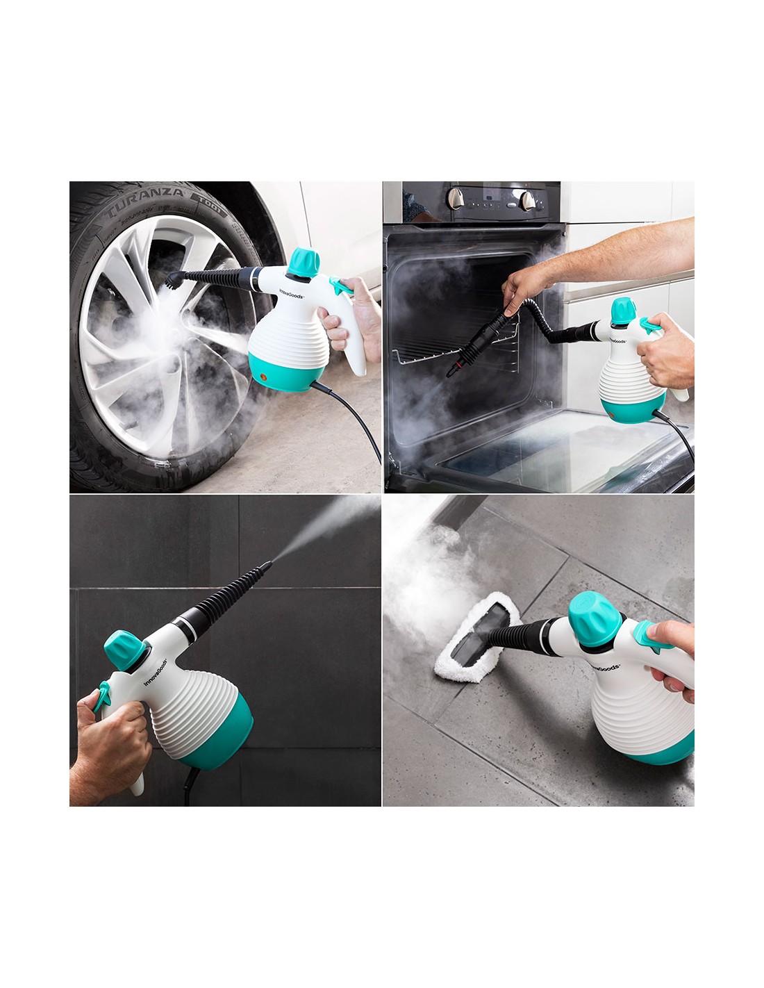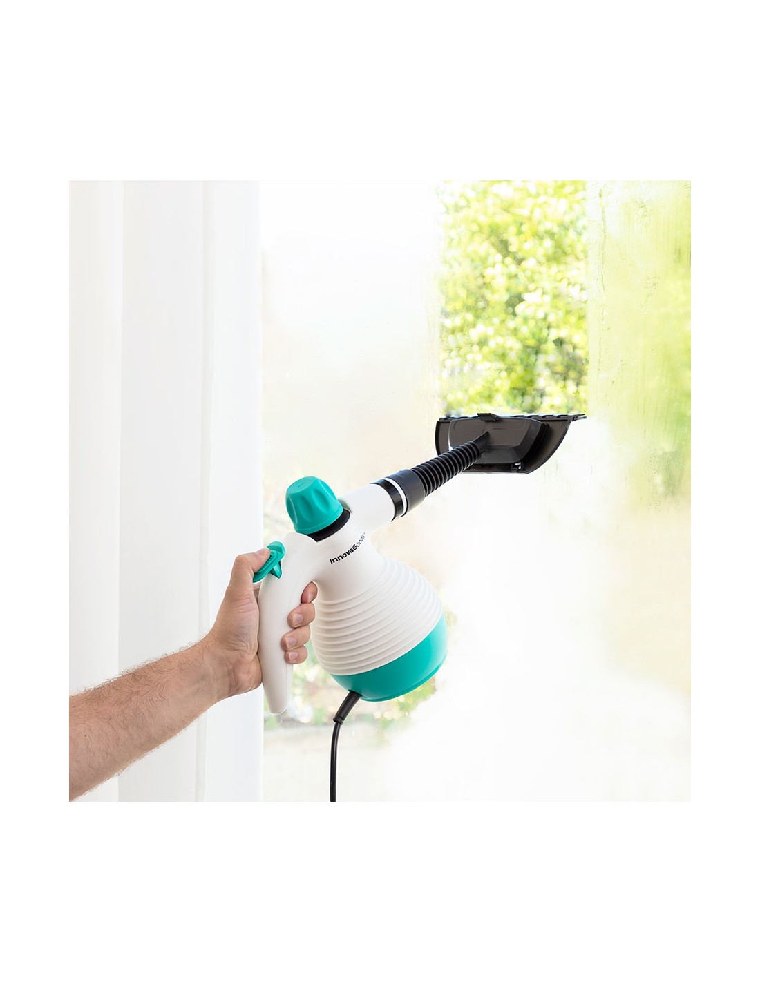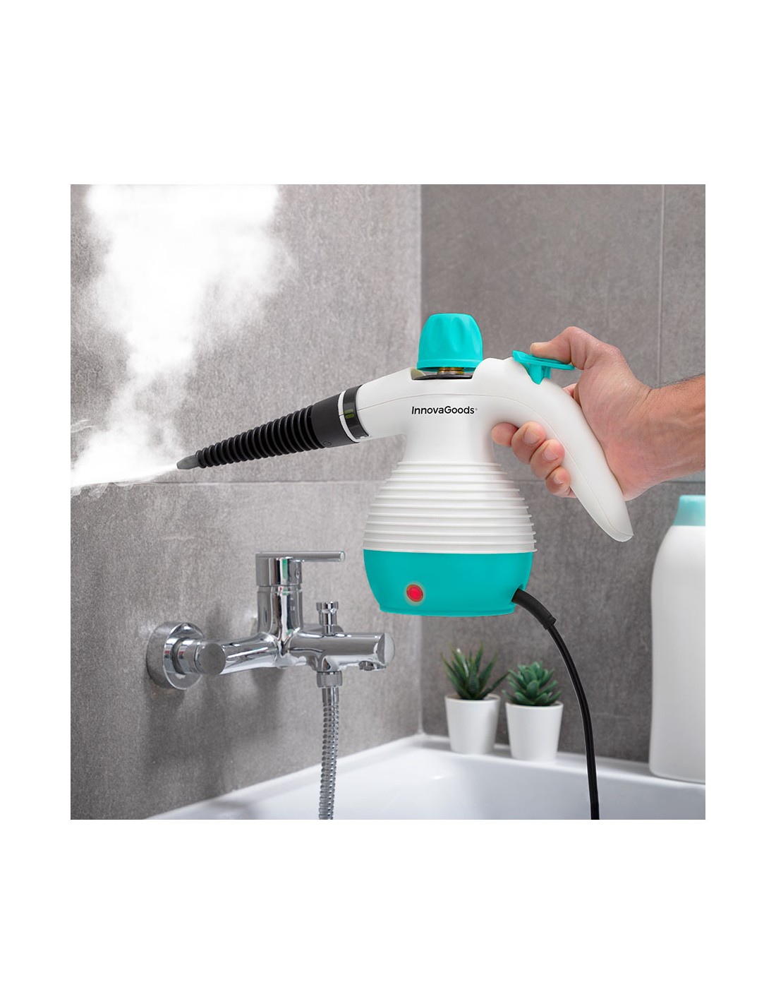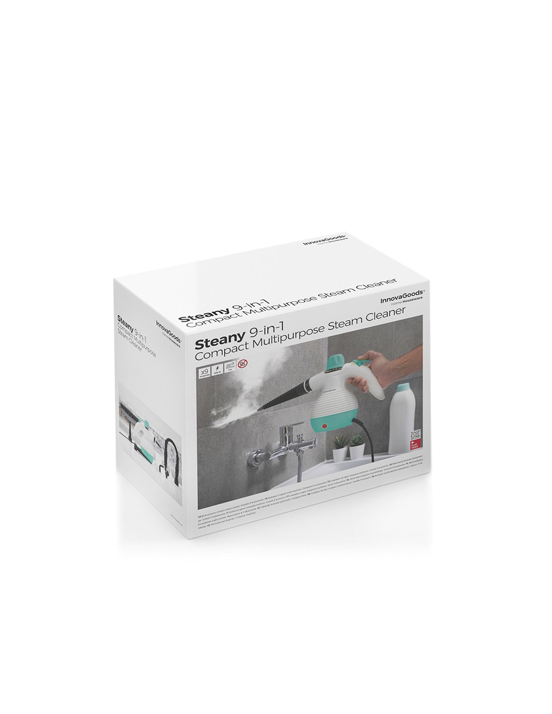 Vaporeta de mano multiusos con accesorios 9 en 1 steany 0,35l. 3 bar 1000w v0103132 innovagoods. un limpiador de vapor multiusos que incluye 9 accesorios para facilitar una limpieza completa y en profundidad. por su diseño compacto, es muy cómodo y fácil de usar. limpia y desinfecta mediante la presión del vapor caliente, totalmente libre de productos químicos, eliminando con eficacia grasa, moho y manchas. ideal para utilizar en baños, cocinas, coches, etc. permite la limpieza en superficies duras (azulejos, suelos, fregaderos, encimeras, puertas, ventanas, etc.) y en superficies blandas.
