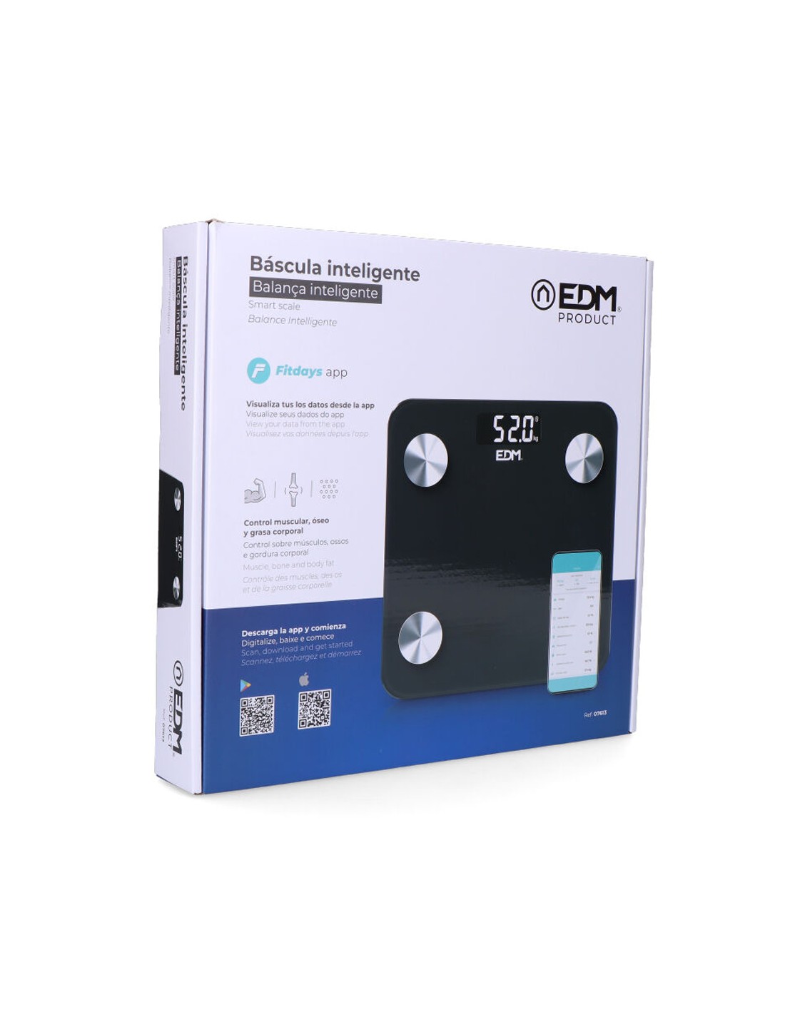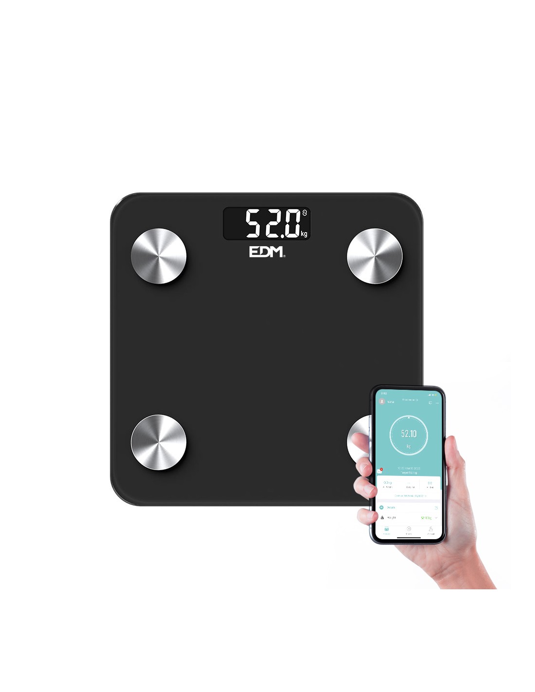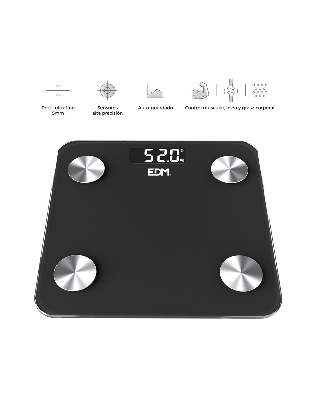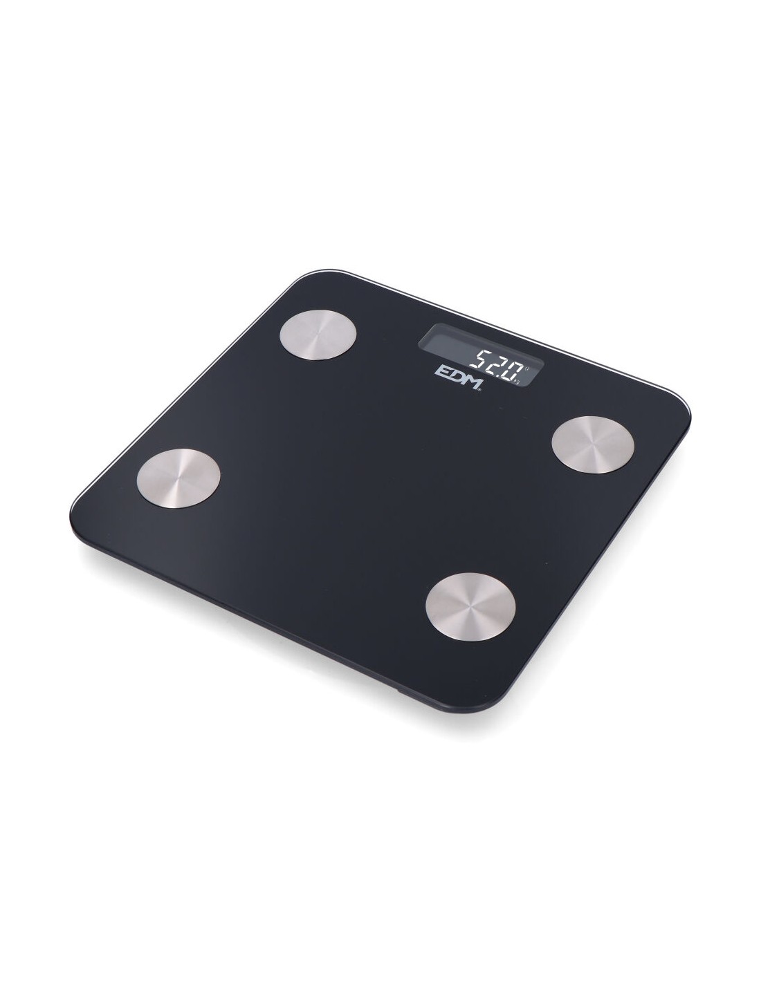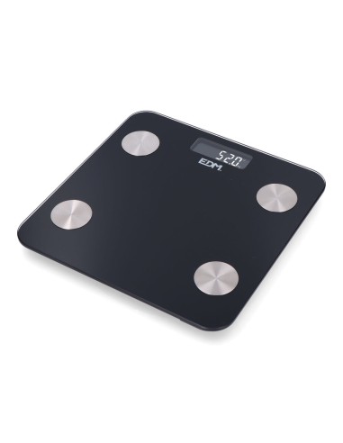 Báscula de baño digital inteligente con bluetooth edm. funciona con aplicación compatible con ios y android. máximo 180kg. mide grasa corporal, nivel de hidratación, masa muscular y otros factores disponibles en la app. pantalla lcd. funciona con dos pilas aaa no incluidas.dimensiones 26x2,2x26cm (ancho/fondo/alto).