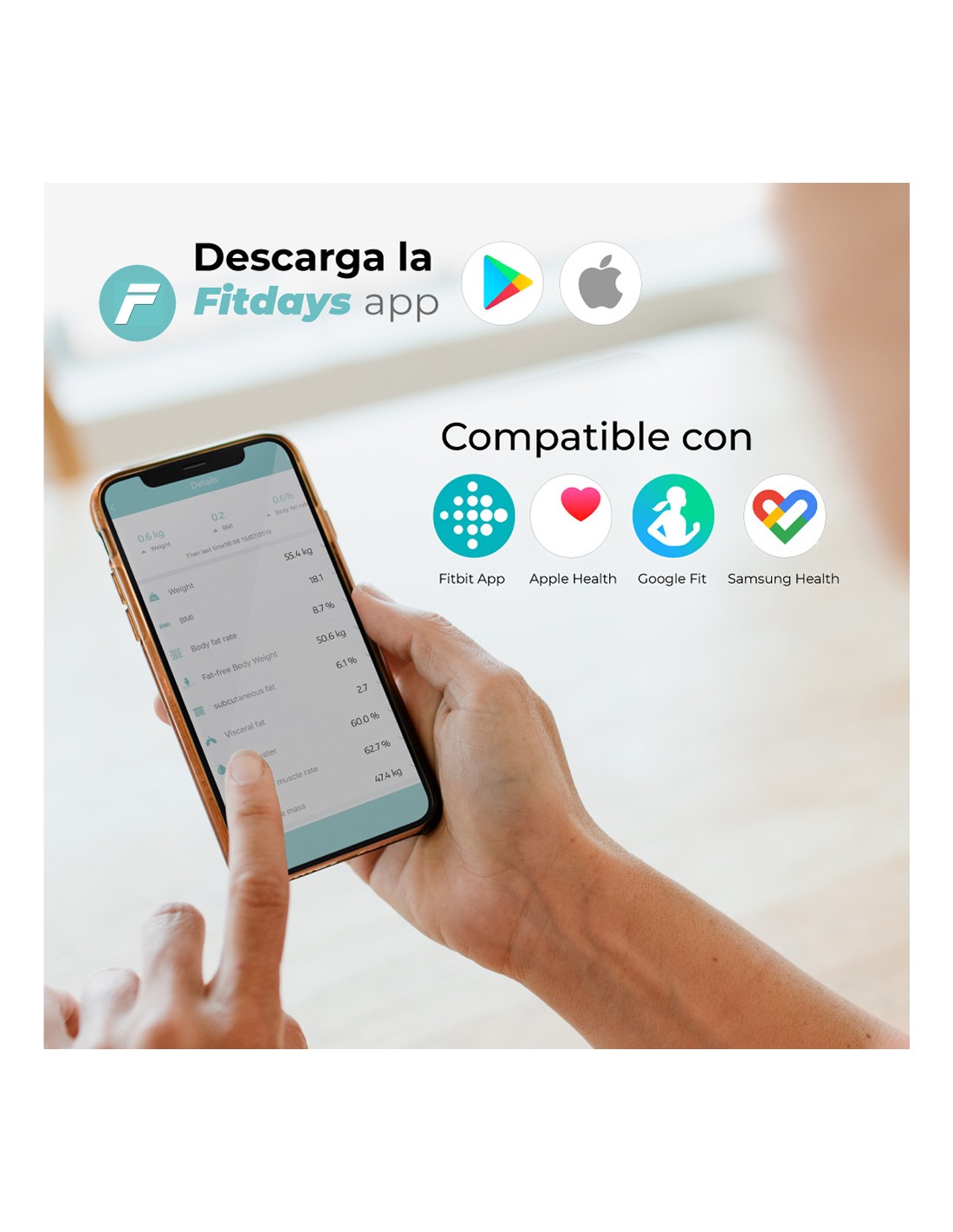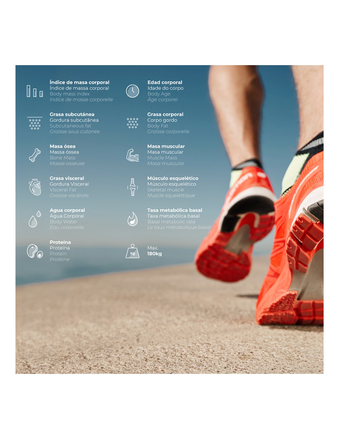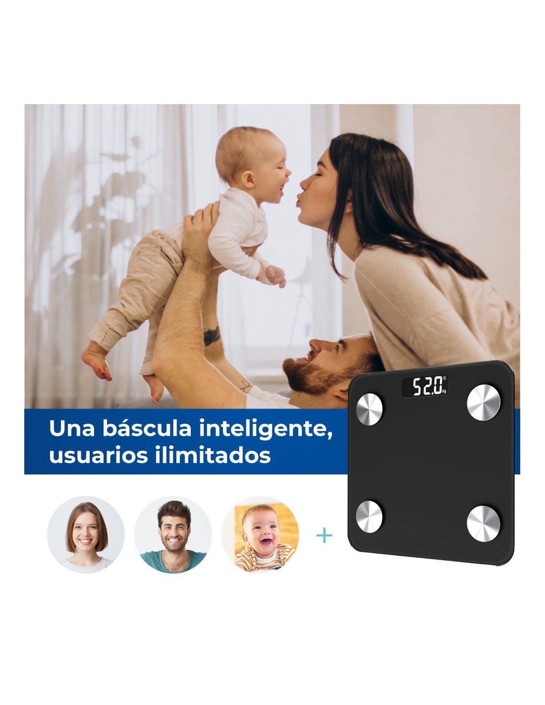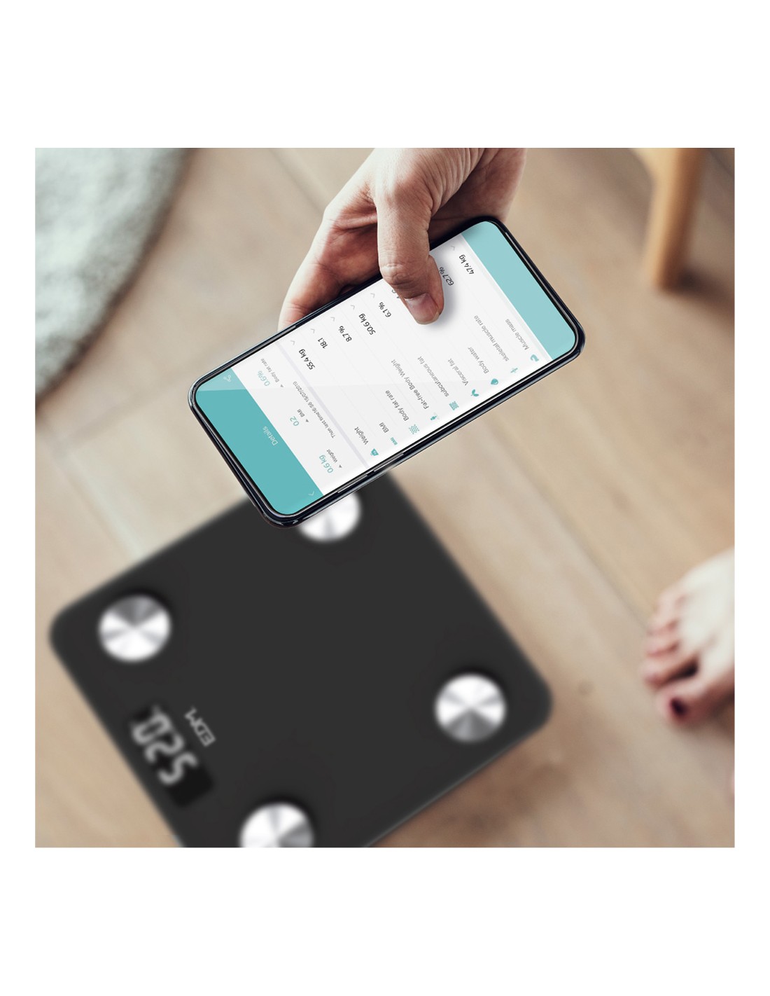 Báscula de baño digital inteligente con bluetooth edm. funciona con aplicación compatible con ios y android. máximo 180kg. mide grasa corporal, nivel de hidratación, masa muscular y otros factores disponibles en la app. pantalla lcd. funciona con dos pilas aaa no incluidas.dimensiones 26x2,2x26cm (ancho/fondo/alto).