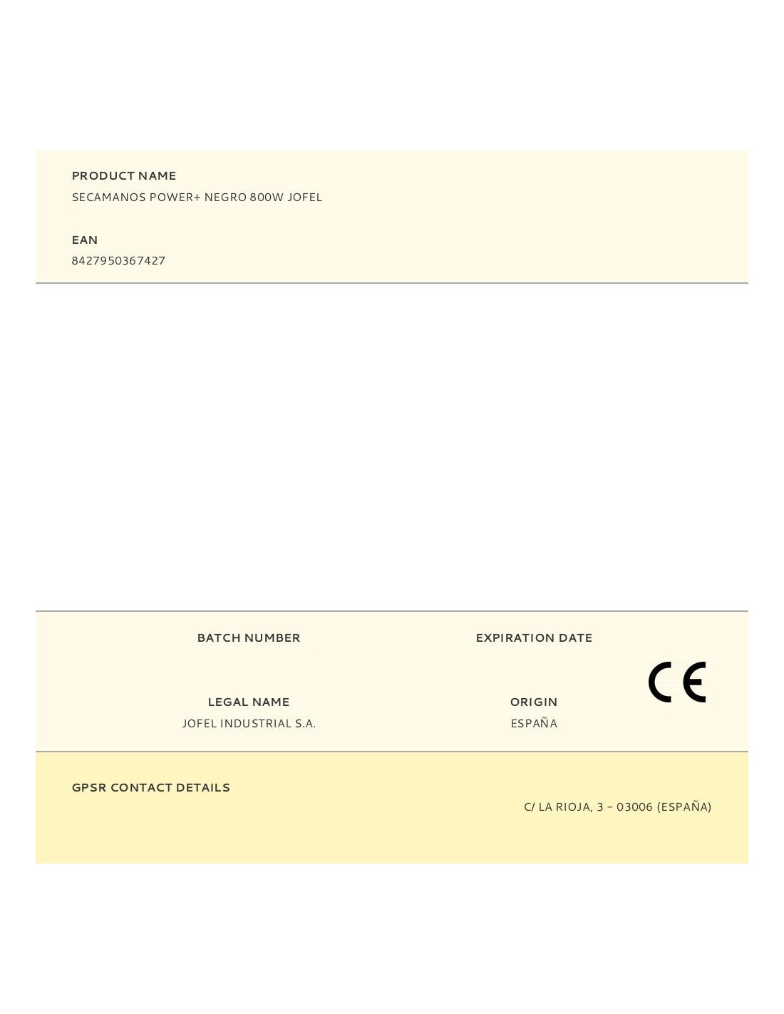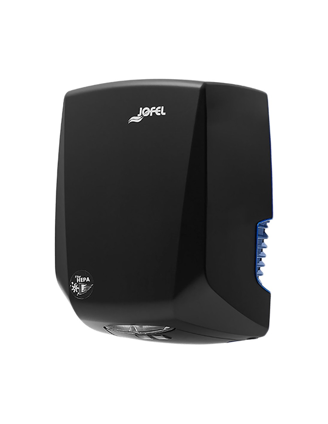 Secamanos power+ negro jofel. secamanos óptico de altas prestaciones, fabricado en abs de alta calidad y resistencia, compacto y de reducidas dimensiones, secado en aproximadamente 10", secado por cortina de aire, secado rápido e higiénico. antivibración. filtro hepa, motor universal de bajo consumo: 800w. velocidad de salida del aire: 505km/h, incorpora aislante acústico, protección con doble aislamiento eléctrico (ip23), puede instalarse a 0,60m de toma de agua, certificado en clase ii, parada automática por tiempo. sistema de seguridad con parada. módulo electrónico en su base de fácil extracción, conexión a corriente por su base, aspiración a través de lamas laterales, filtro antipolvo, filtro hepa, baja rumorosidad (69 db), recomendable para espacios reducidos.