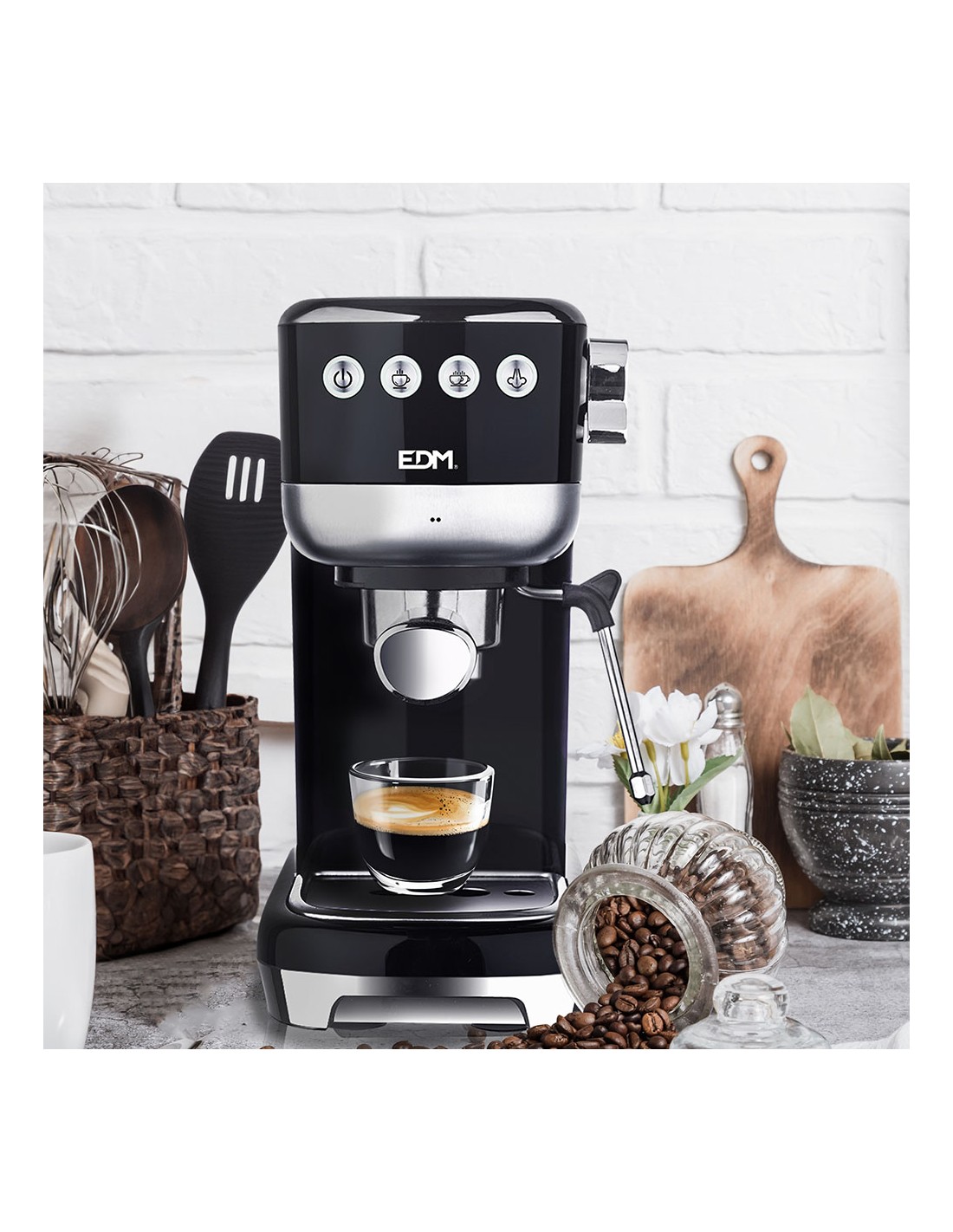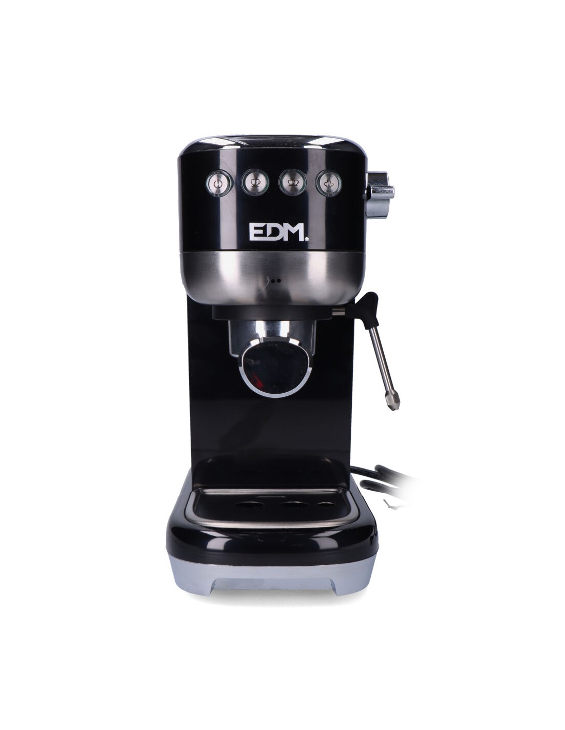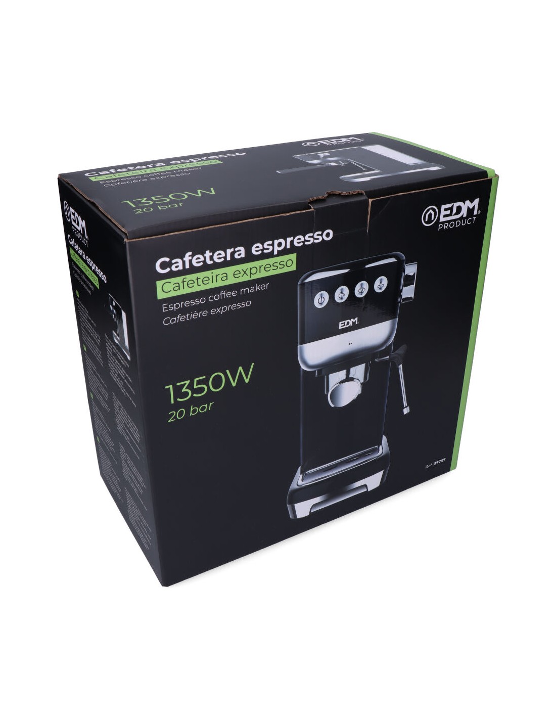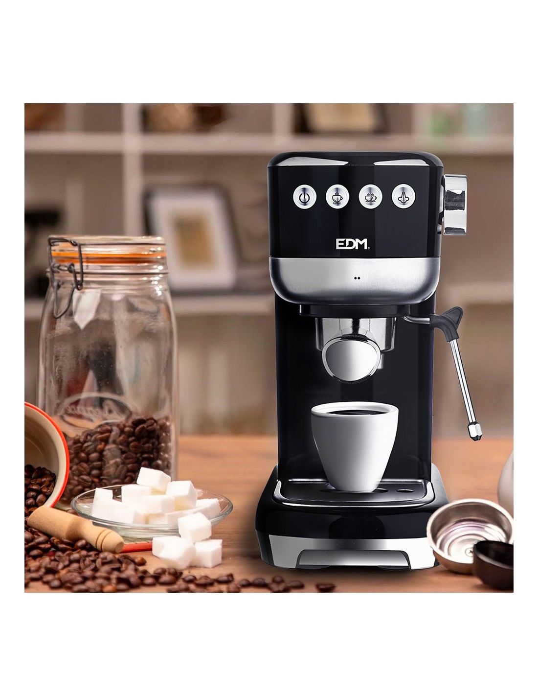Cafetera espresso de 20 bares edm. depósito de agua de 1,3l. modo para una y dos tazas. incluye función de parada automática para preparar un espresso perfecto, infusionando la cantidad exacta de café sin que el usuario deba detenerla manualmente. vaporizador para espumar leche y calentar agua. bandeja recoge gotas desmontable. protección contra sobrecalentamiento y sobrepresión. botones con luz led. caldera de aleación con tubo de acero inoxidable. incluye filtro para una taza. no incluye molino de café.14,1 x 40,6 x 28,6 cm