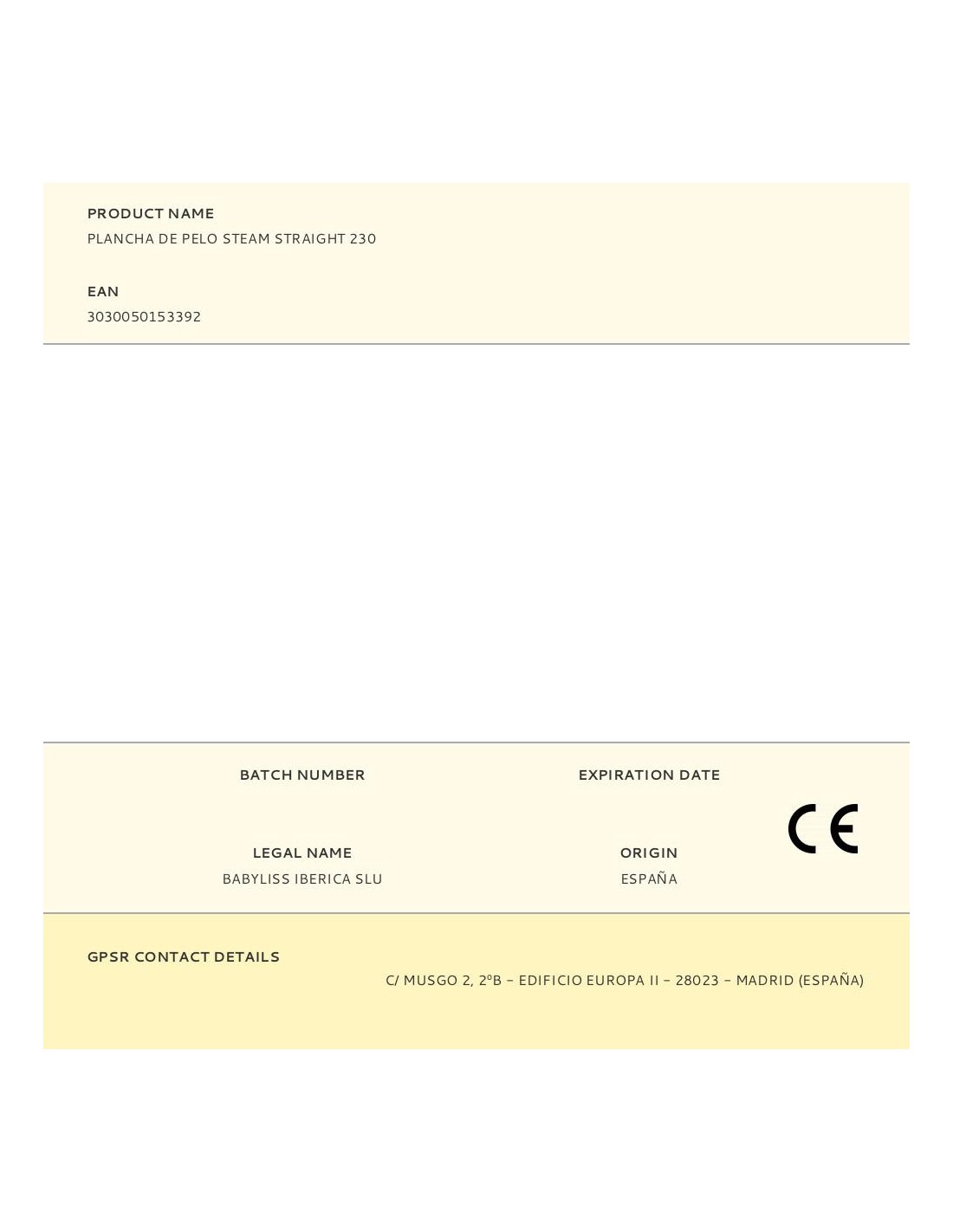 Plancha de cabello steam straight babyliss. recubrimiento de cerámica. depósito de 12ml. sistema de calentamiento advanced ceramic technology. calentamiento instantáneo. apagado automático. puntas de silicona. peines extraibles. alfombrilla térmica. sistema de bloqueo de placas. cable giratorio 2,5m. placas flotantes: 39x100mm. 5 ajustes de temperatura de 150°c a 230°c