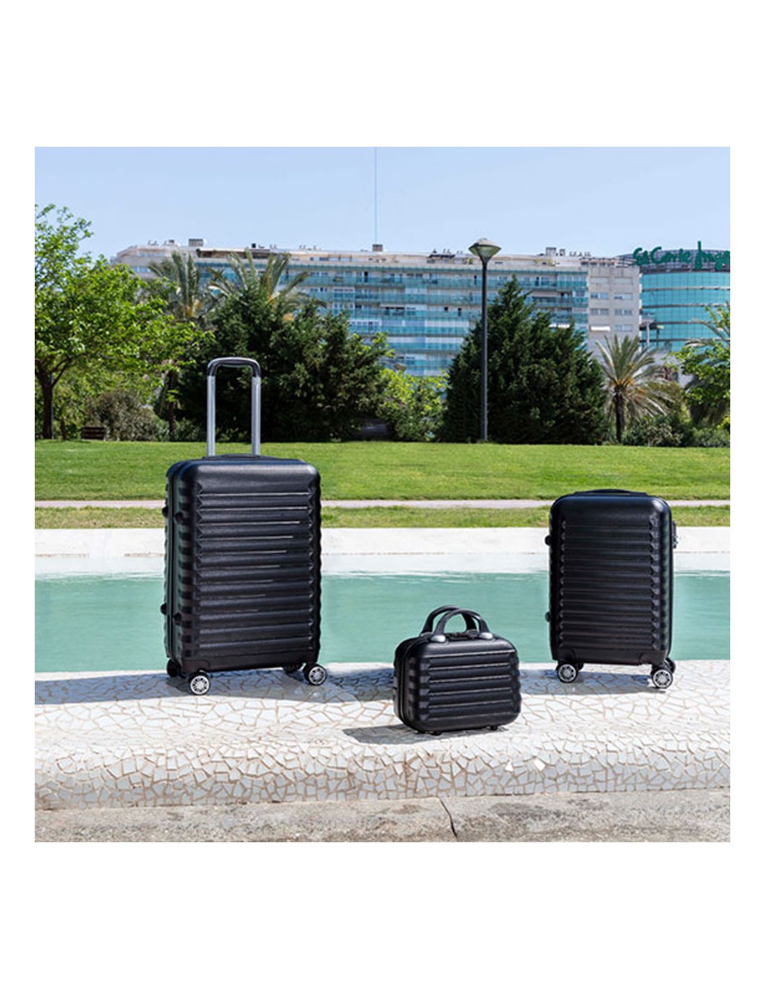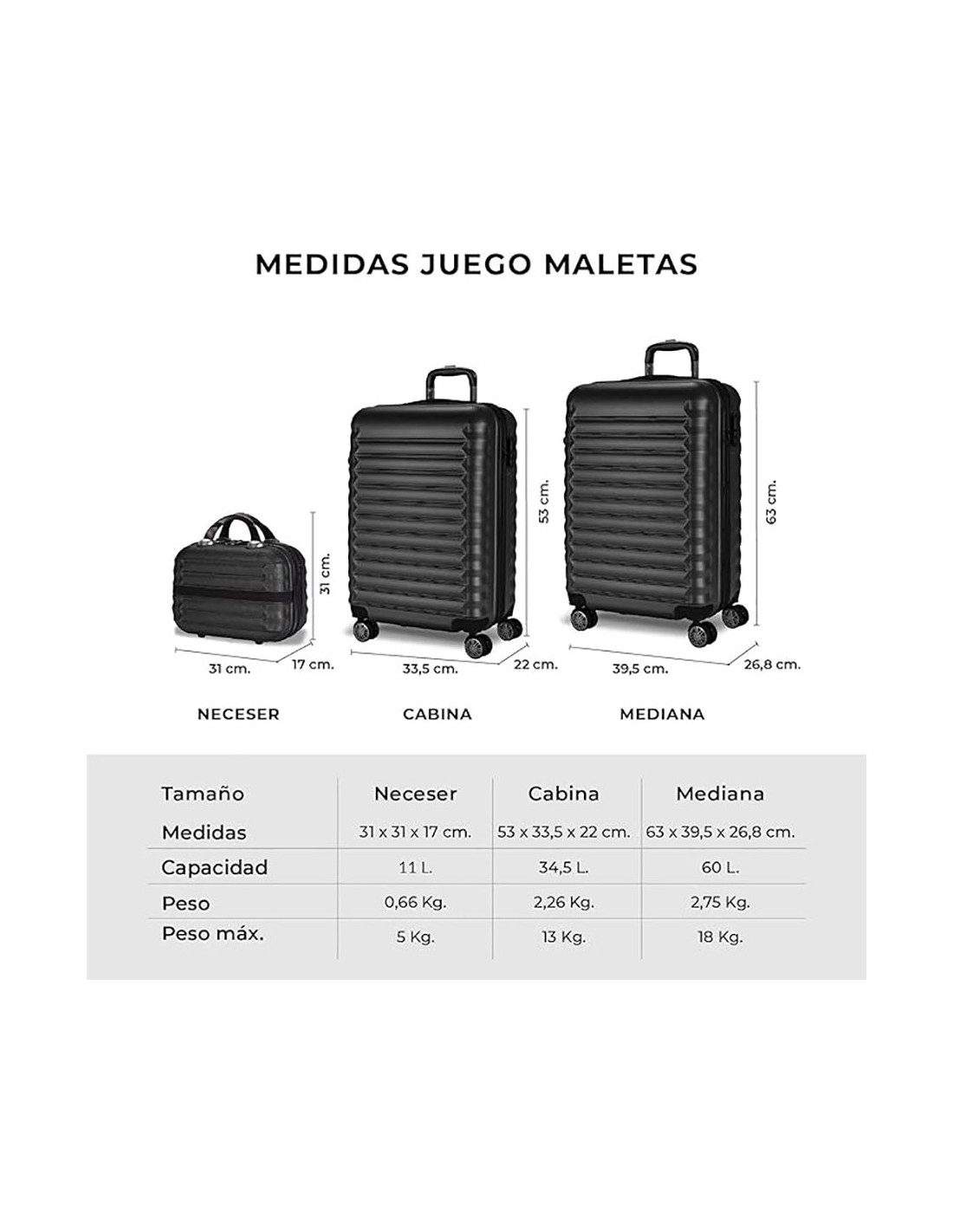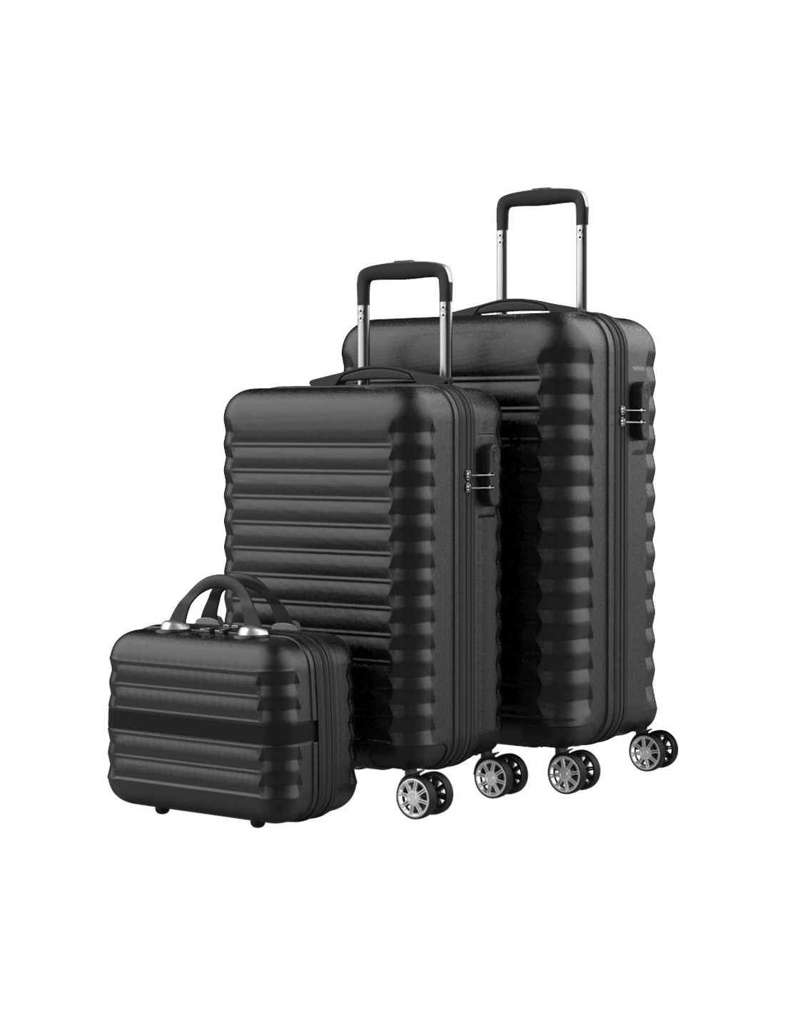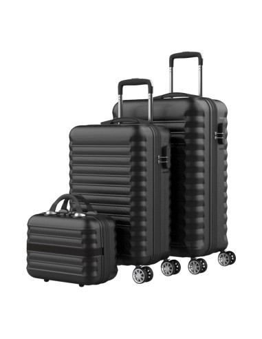 Set 3 piezas: 53, 63 y 31 cm material abs texturizado impermeable protectores laterales 4 ruedas dobles 360° candado combinacion lateral interior compartimentado incluye neceser 11l.