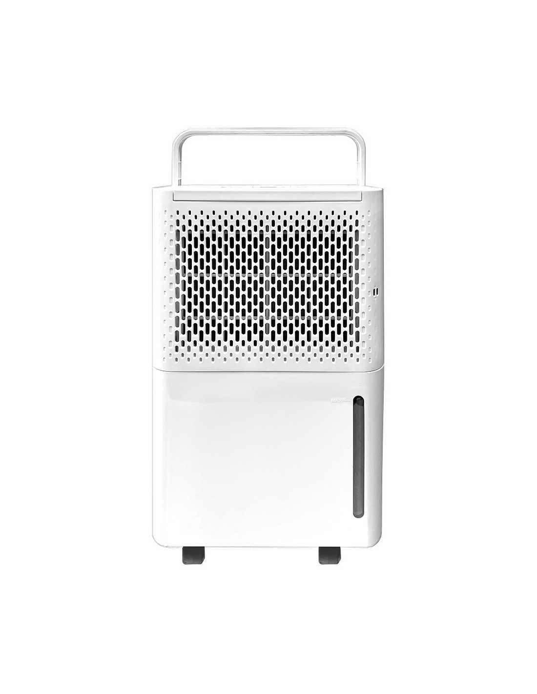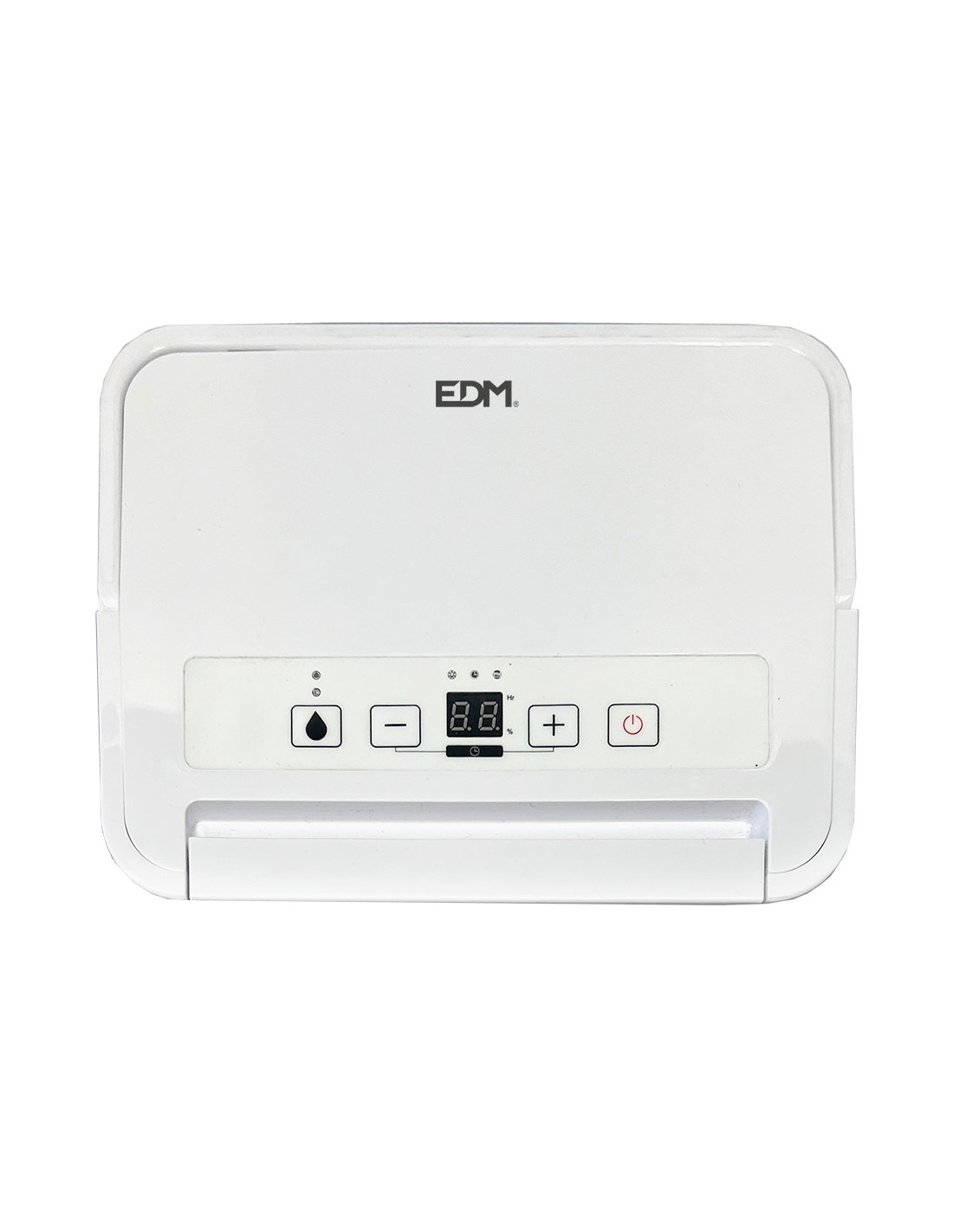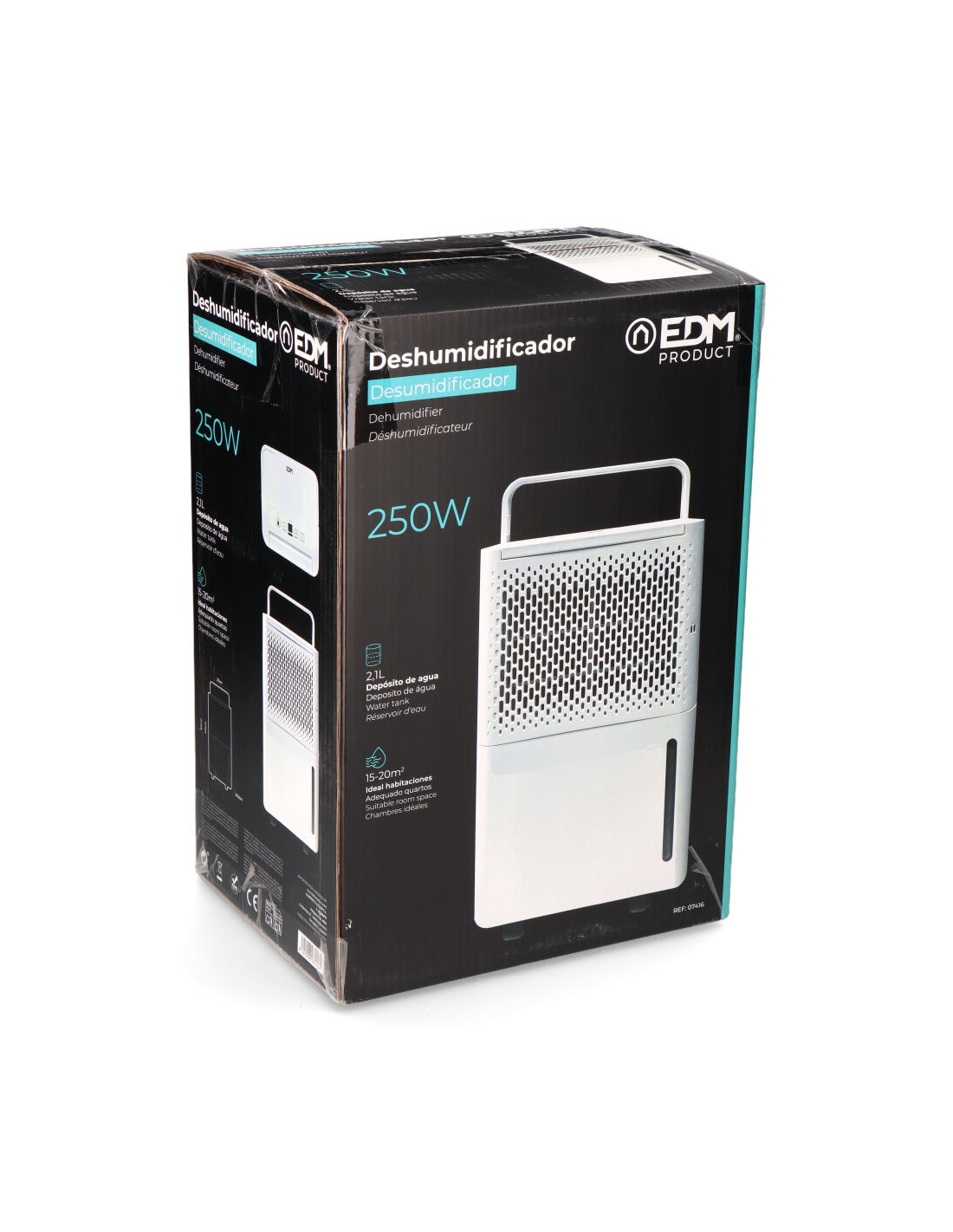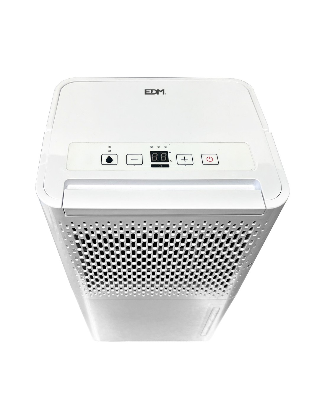 Deshumidificador blanco 250w,1,45 a, 12l día a 30°c y humedad relativa de 80% / 6l día (27c - 60%). depósito 2,1l. 42db. volumen de aire por hora: 100m. adecuado para un area de 15- 20m. carga de refrigerante r290/40g. peso 9 kg. 27 x 20,5 x 50 cm. incluye ruedas. edm