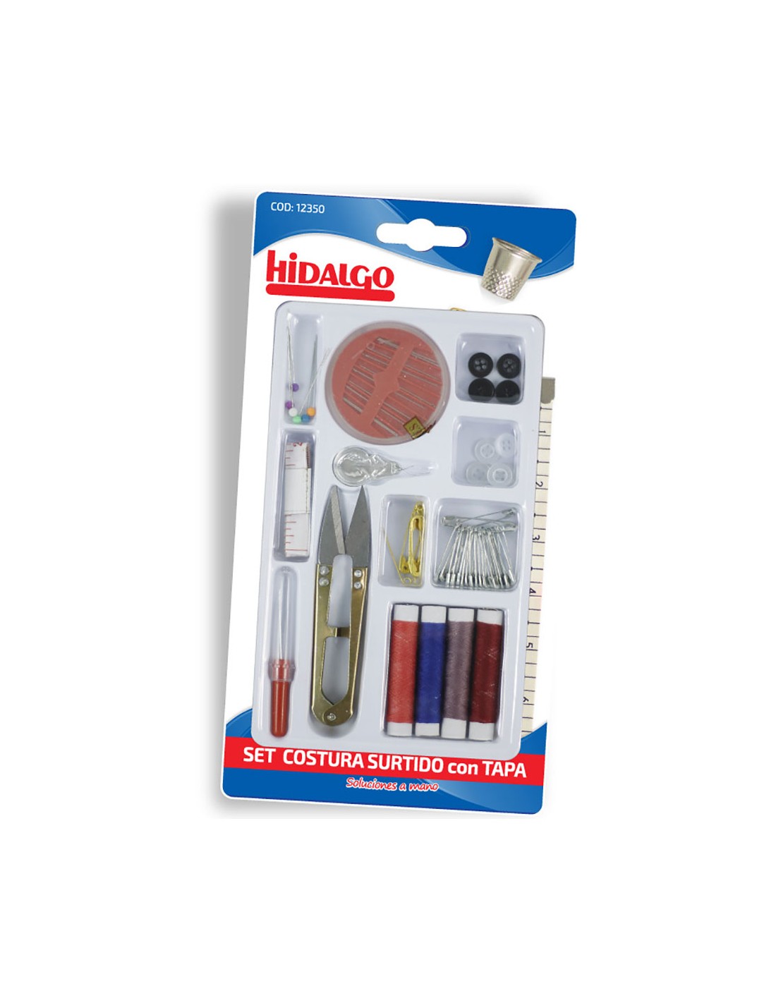 Contiene tijeras de costura, agujas e hilo de coser (4 colores), cintra métrica de costura, botones en 2 colores, alfileres , imperdibles en 2 colores , descosedor y enhebrador.