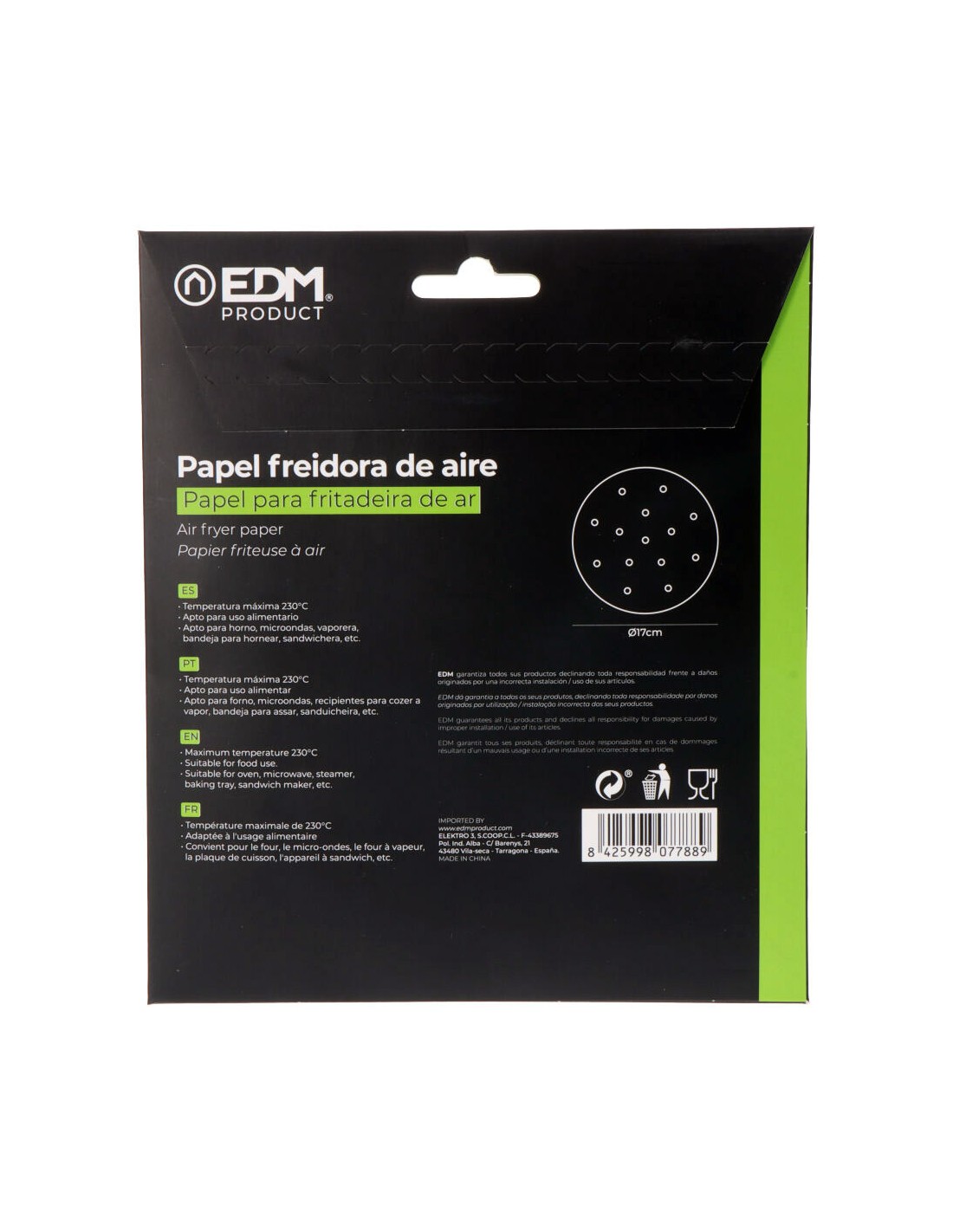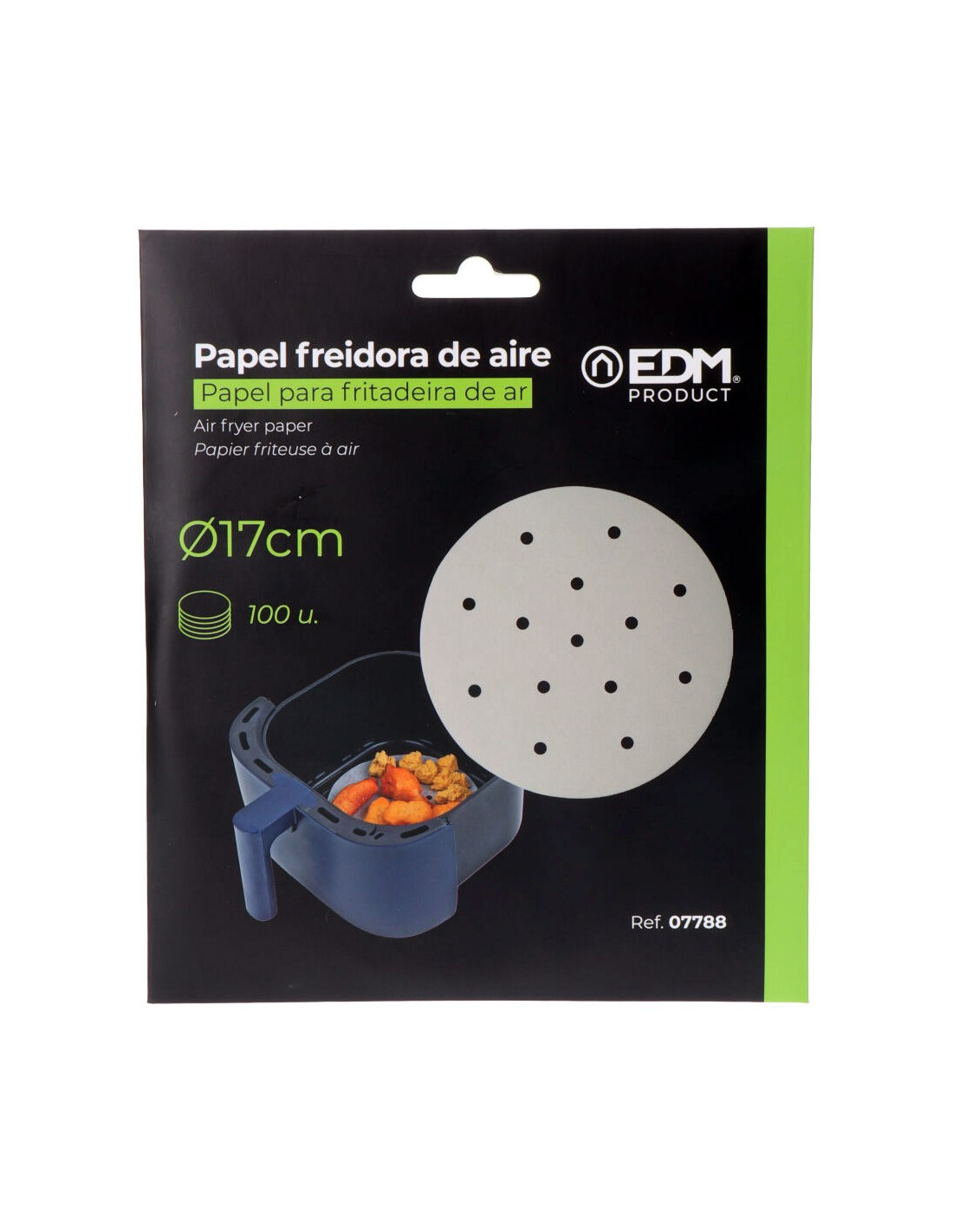 Papel freidora de aire ø17cm edm pack 100 uni. ideal para freidora de aire, horno, microondas, vaporera, bandeja para hornear, sandwichera, etc. el diseño con agujeros, facilita la buena cocción de los alimentos, gracias a su tratamiento antiadherente.