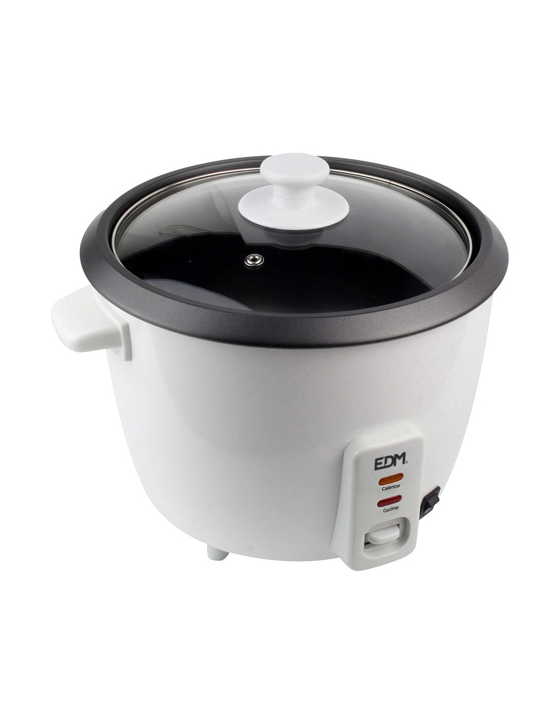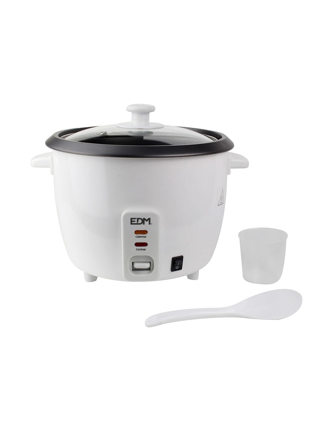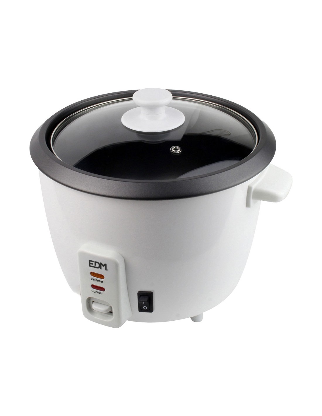 Olla arrocera 400w 1l edm con revestimiento antiadherente y tapa de vidrio. interruptor de encendido/apagado. dos funciones, cocer y mantener caliente. indicador de luz led. con base de goma antideslizantes. accesorios incluidos: vaso medidor de plástico y espátula.