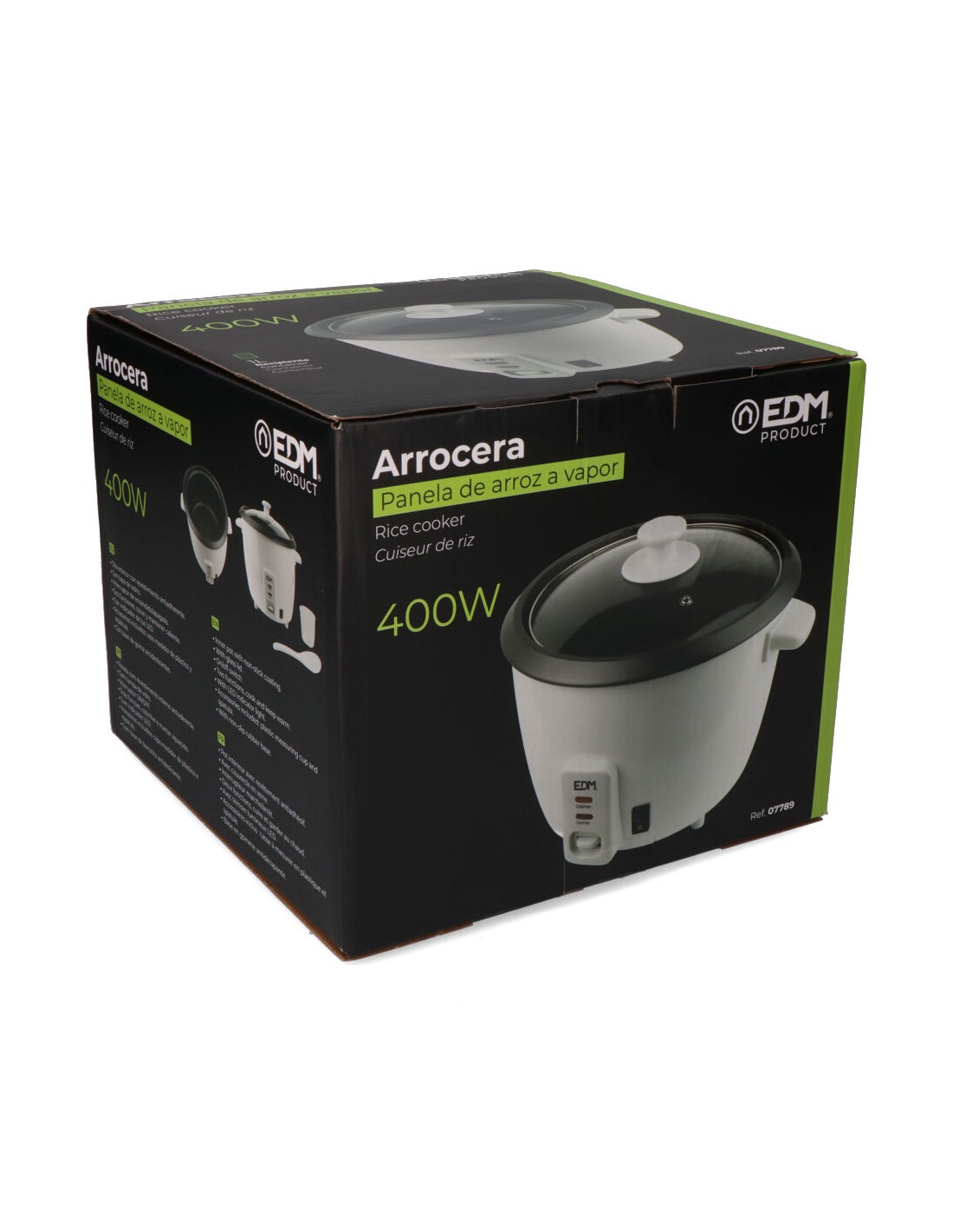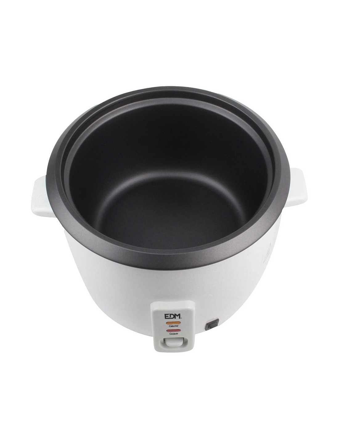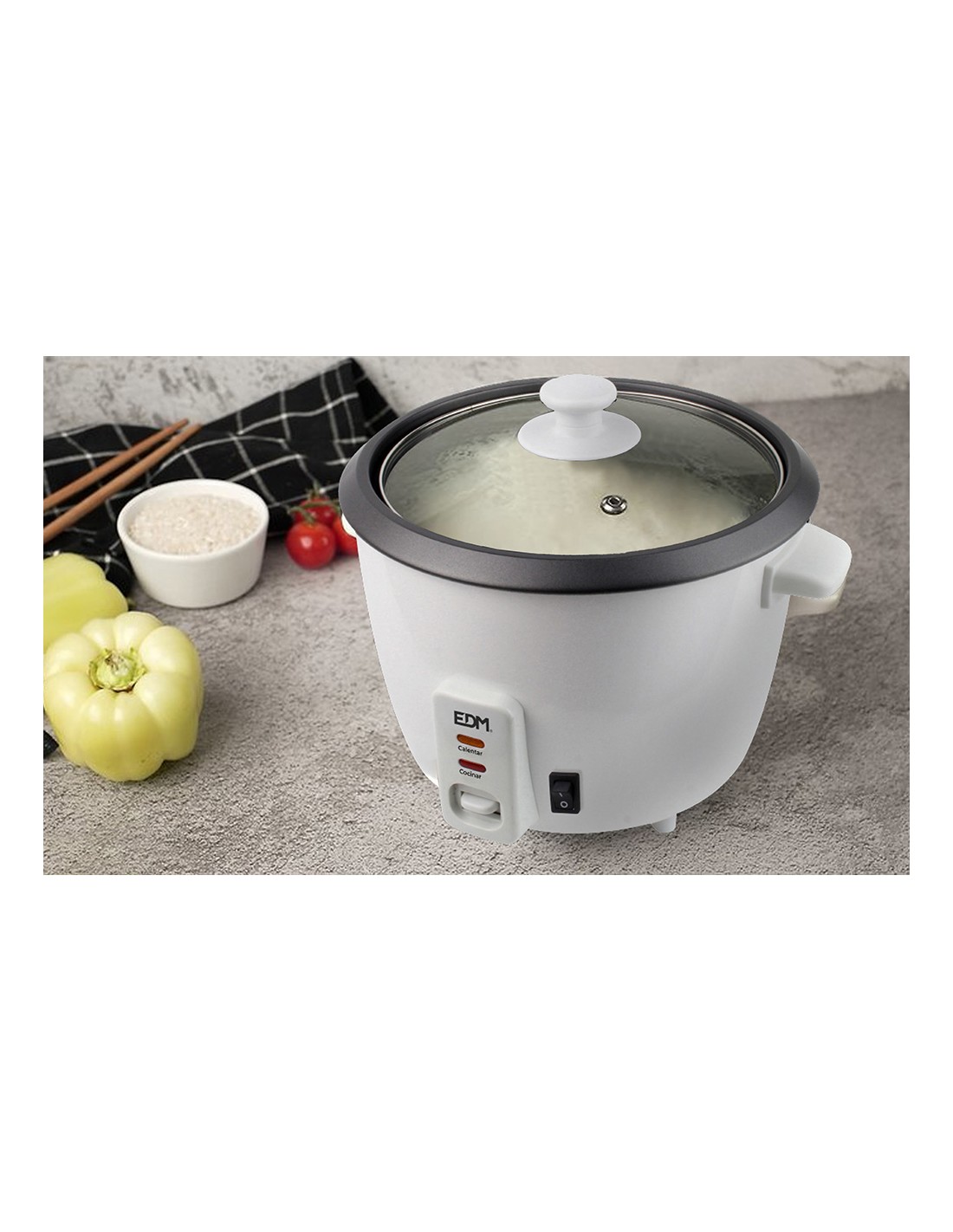 Olla arrocera 400w 1l edm con revestimiento antiadherente y tapa de vidrio. interruptor de encendido/apagado. dos funciones, cocer y mantener caliente. indicador de luz led. con base de goma antideslizantes. accesorios incluidos: vaso medidor de plástico y espátula.