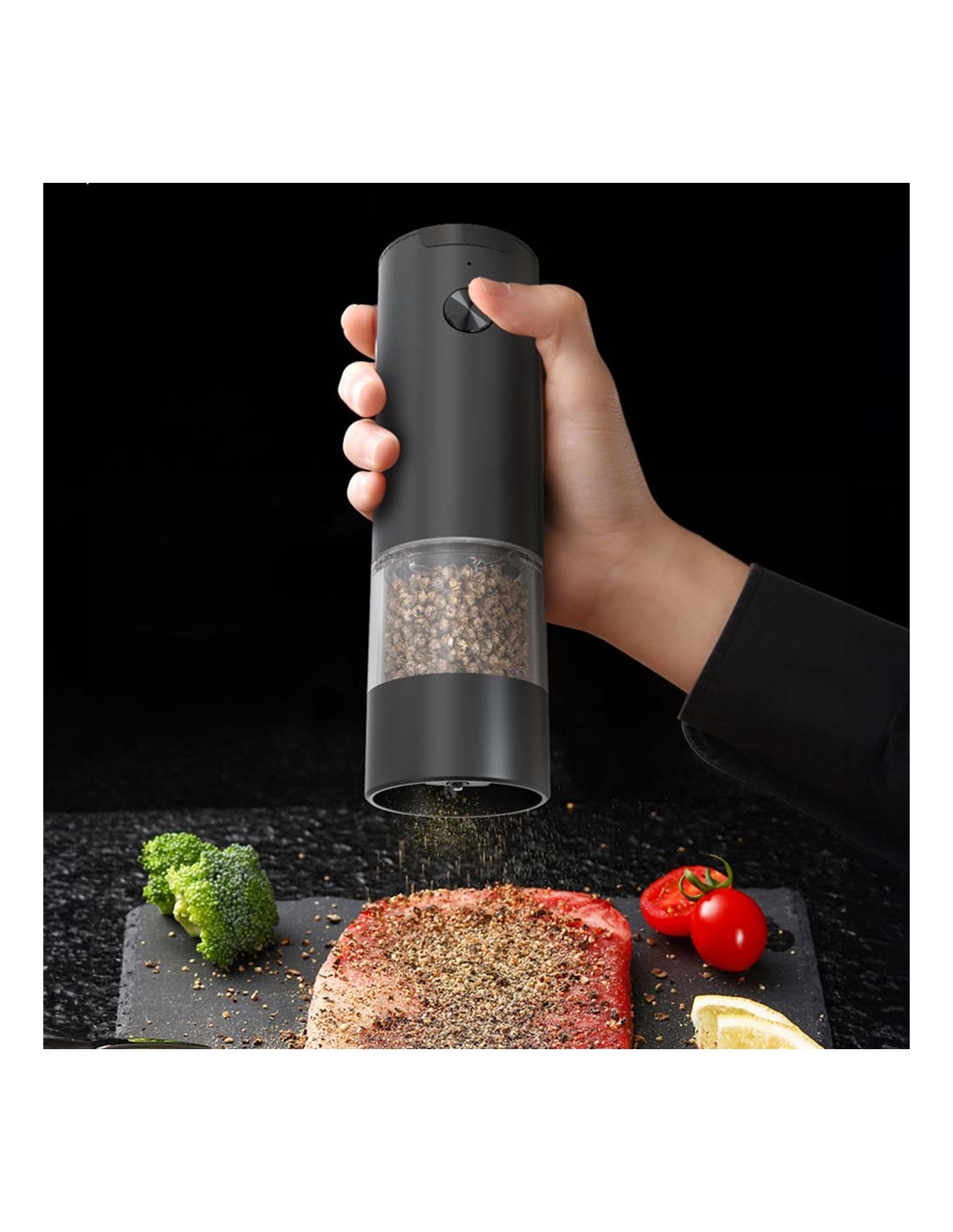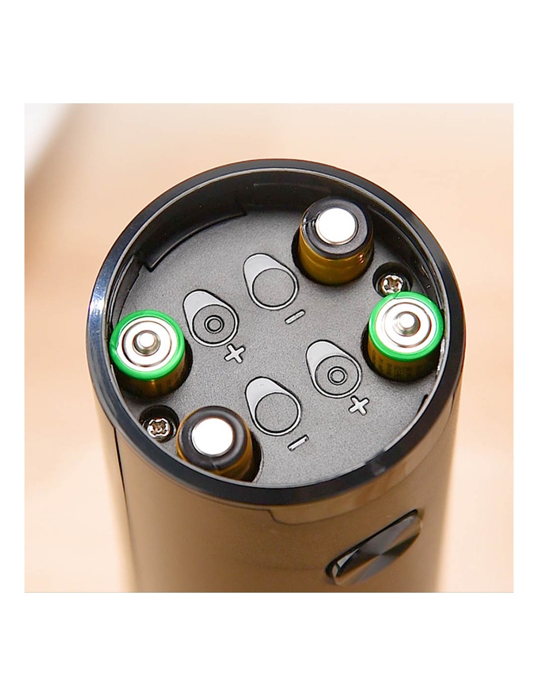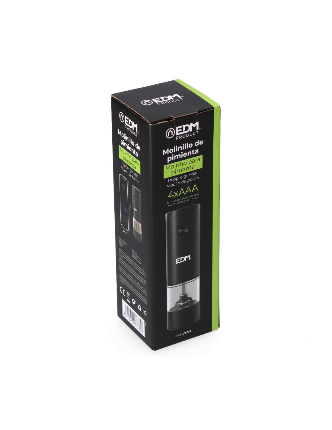 Molinillo de pimienta eléctrico 70 ml, 4 pilas aaa - 1,5v (no incluidas). botón on/off, (para moler mantener presionado el botón), depósito transparente y desmontable, molinillo de cerámica. la luz led se encenderá automáticamente durante su uso. puede ajustar manualmente el grosor del grano molido. solo para pimienta y sal. ø5,5 x 17,6 cm