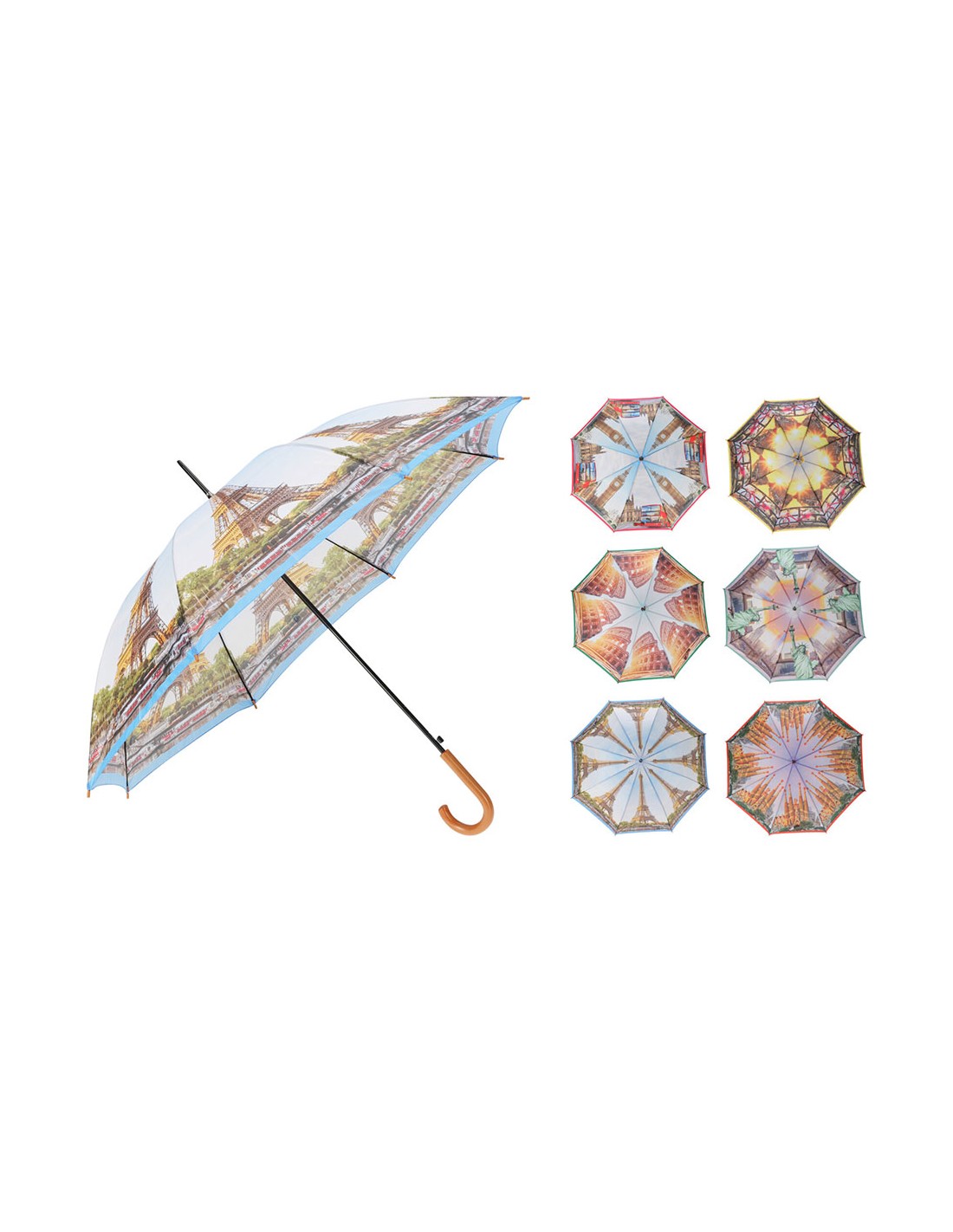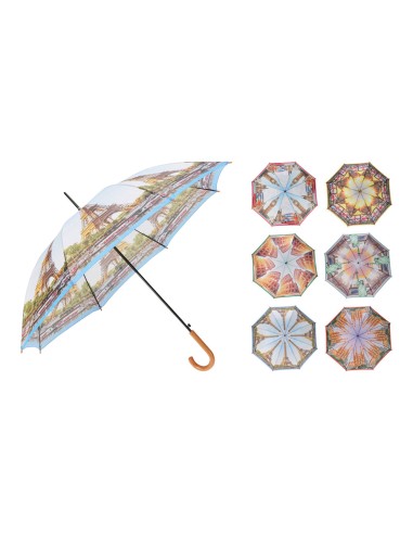 Paraguas con impresiones de ciudades 58,42 cm, bastón automático de acero con ocho varillas de perfil en u, puño curvado de madera, poliéster 170t con impresiones de ciudades a todo color: amsterdam, barcelona, londres, nueva york, parís y roma