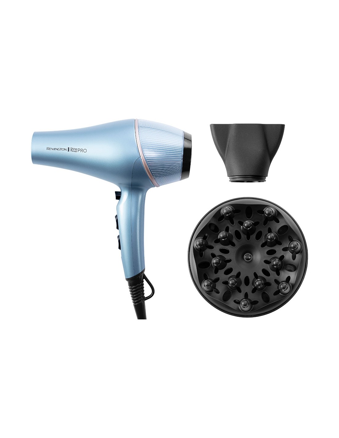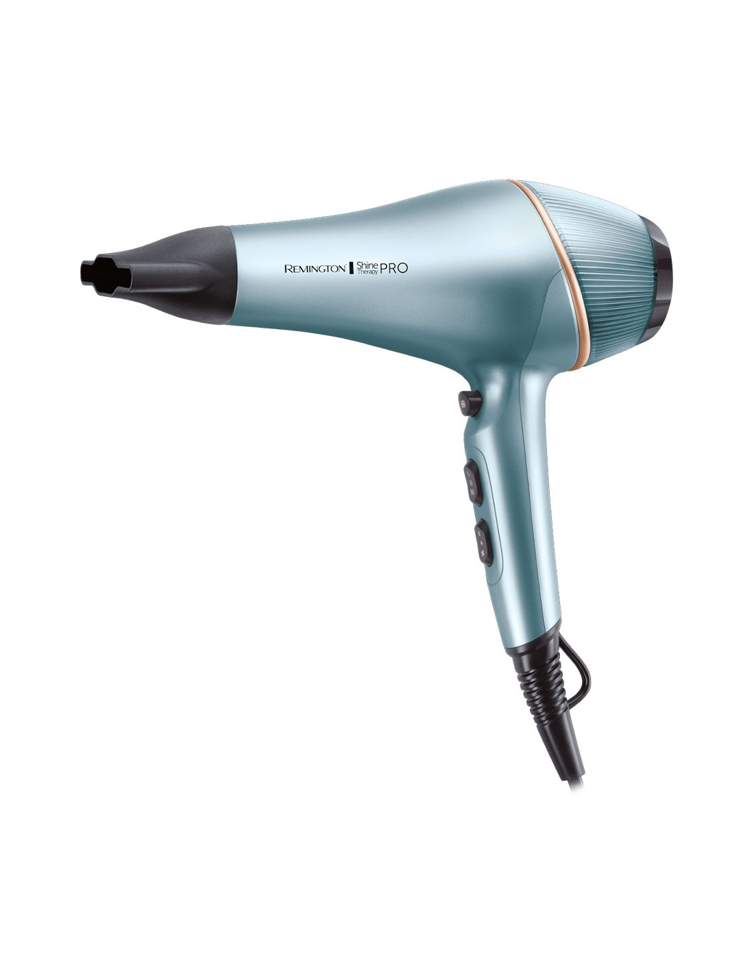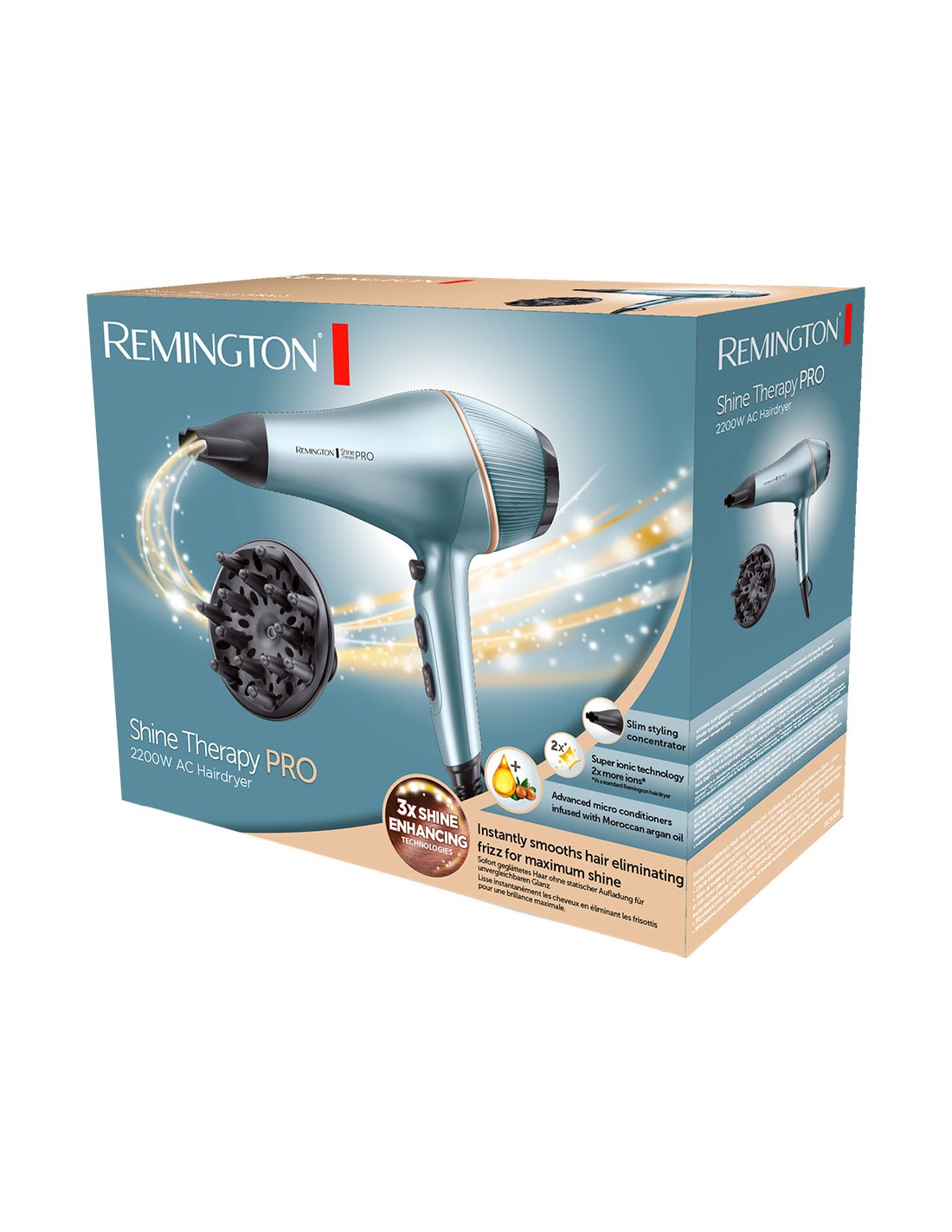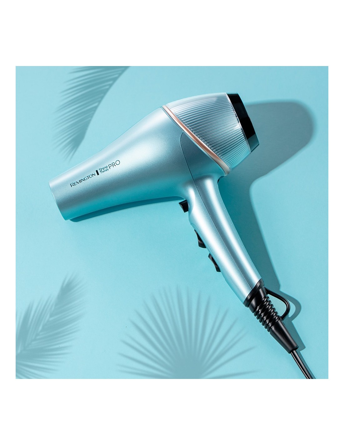 Secador de pelo shine therapy modelo: ac 9300. potencia: 2200 w / 120 km/h, motor de corriente alterna (ac). triple tecnología potenciadora del brillo. alisa al instante el cabello, elimina el encrespamiento y maximiza el brillo: tecnología superiónica (2 veces más iones). microacondicionadores avanzados con aceite de argán marroquí que se liberan en el caudal del aire. concentrador de boquilla estrecha que proyecta calor constante y uniforme. 3 temperaturas. 2 velocidades. ráfaga de aire frío. gancho para colgar. rejilla trasera desmontable fácil de limpiar. cable de 3 m. incluye difusor y concentrador. dimensiones: 21 x 7,5 x 25cm color azuld