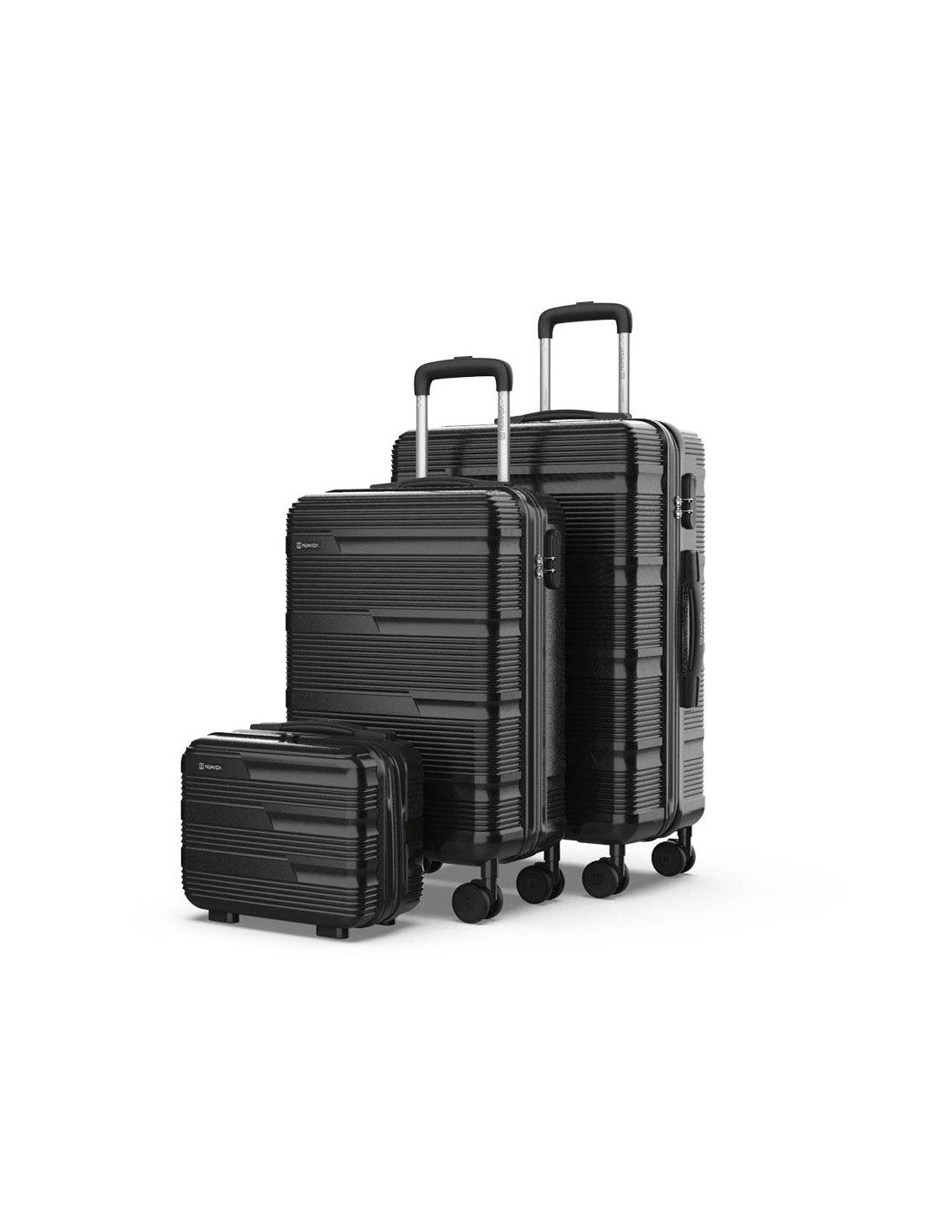 Set 3 piezas: 12", 20" y 24". maleta cabina apta para compañías de bajo coste. material abs texturizado. características: impermeable, con protectores laterales, 4 ruedas dobles 360°, candado comb. lateral y interior compartimentado. incluye neceser compartimentado