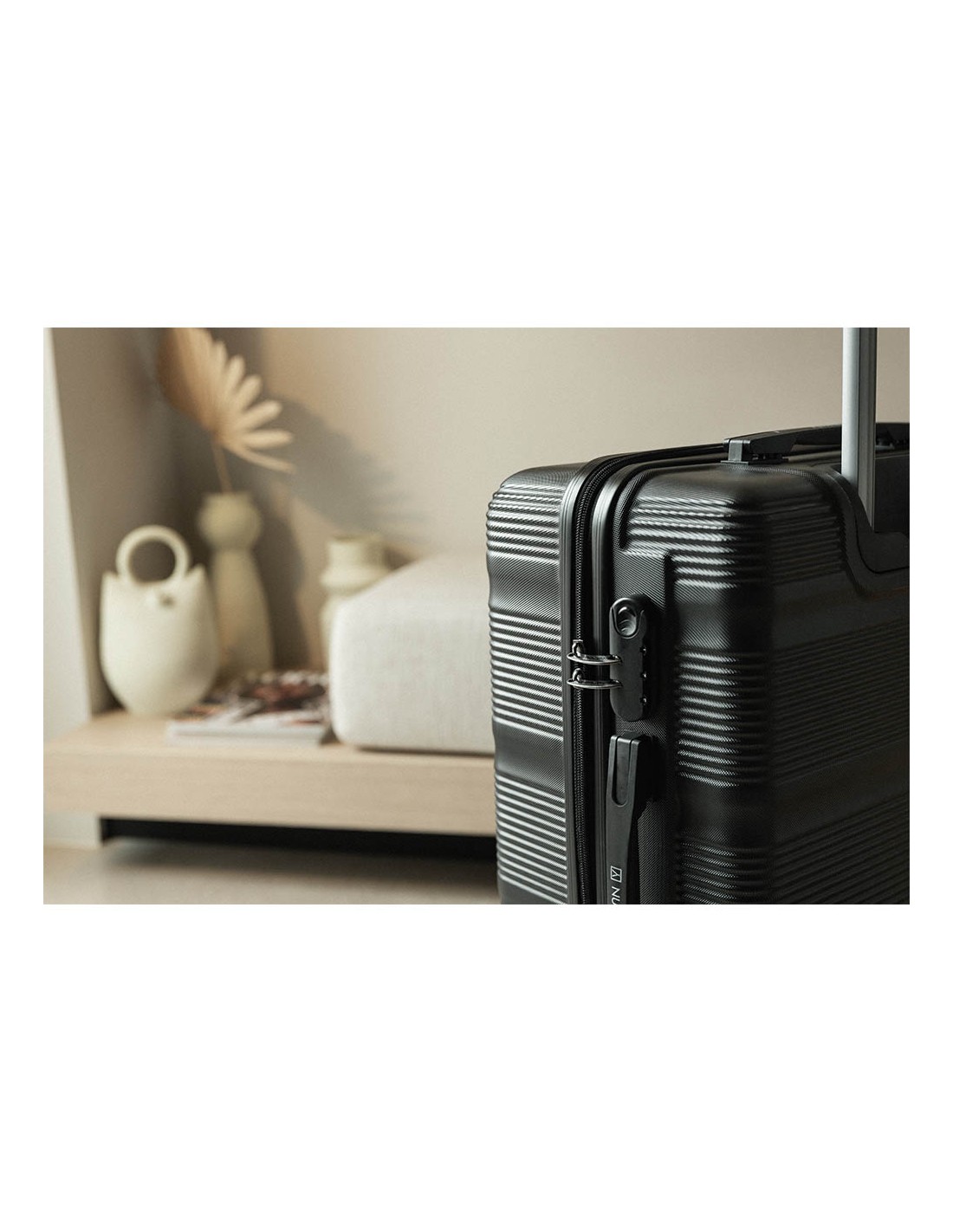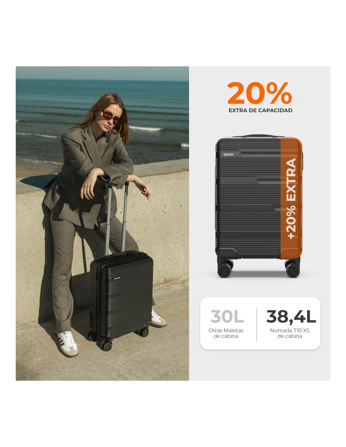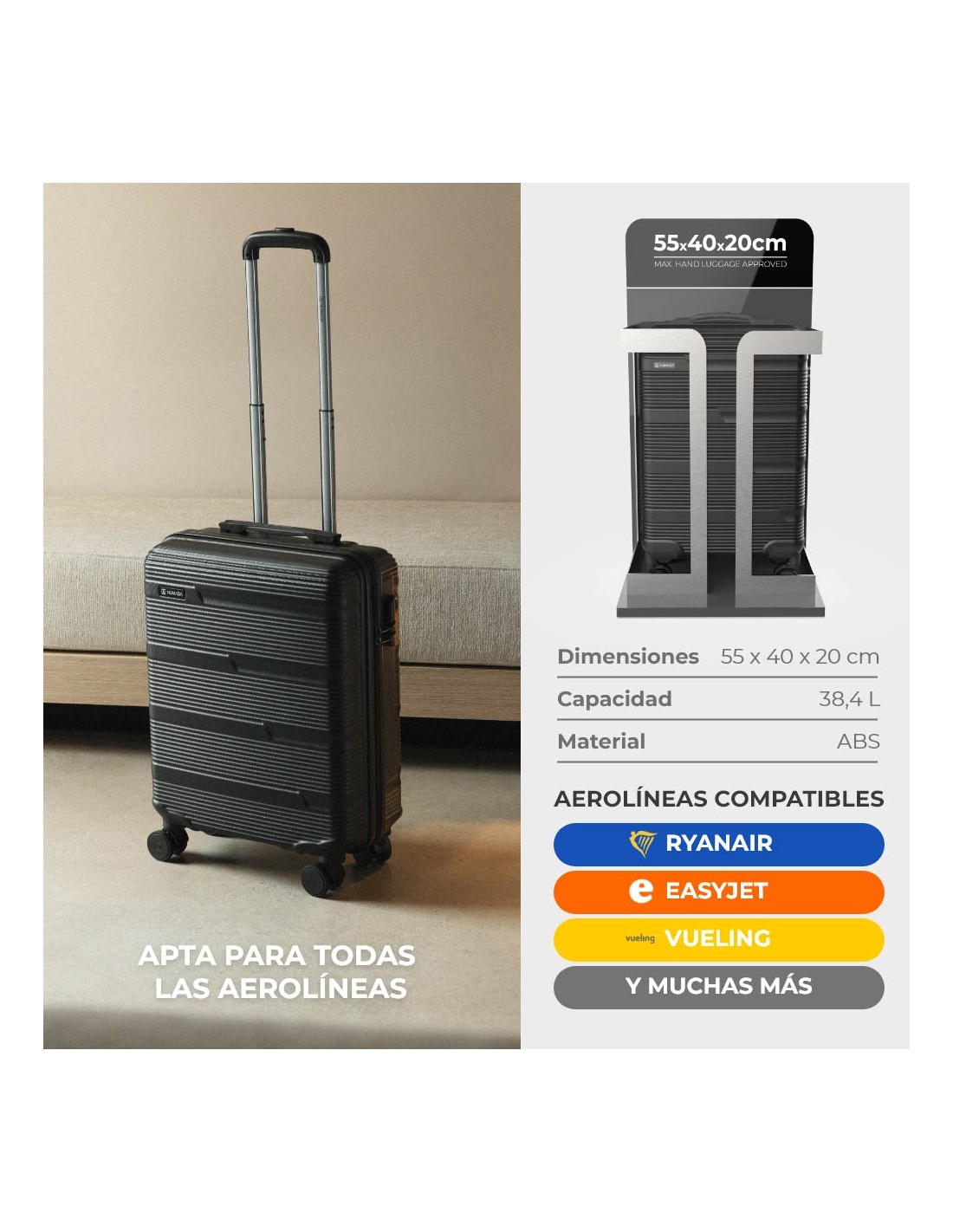 Maleta cabina apta para compañías de bajo coste. material abs texturizado. características: impermeable, con protectores laterales, 4 ruedas dobles 360°, candado comb. lateral y interior compartimentado. medidas: 55 x 20 x 40 cm. capacidad: 38,4 l / 13 kg