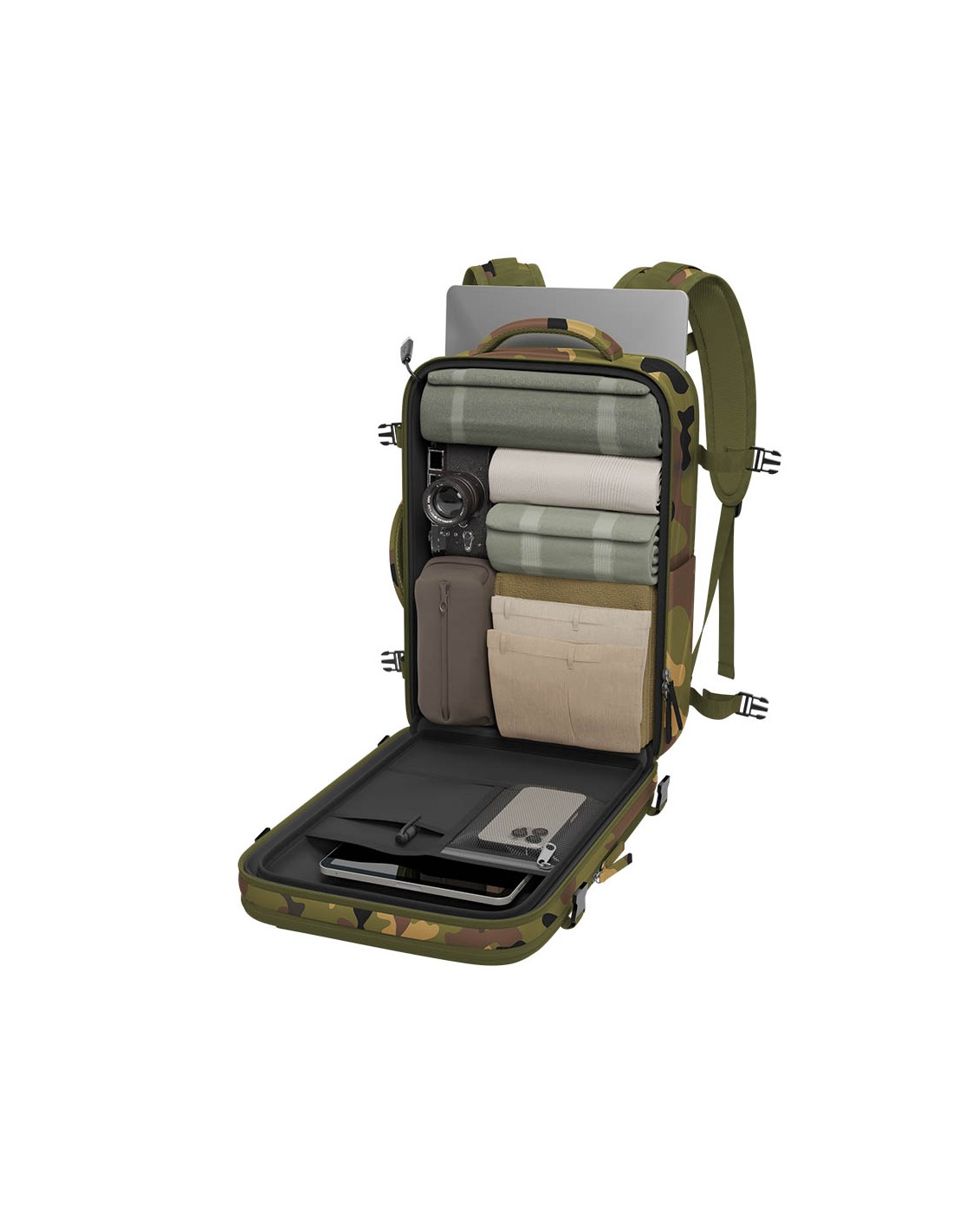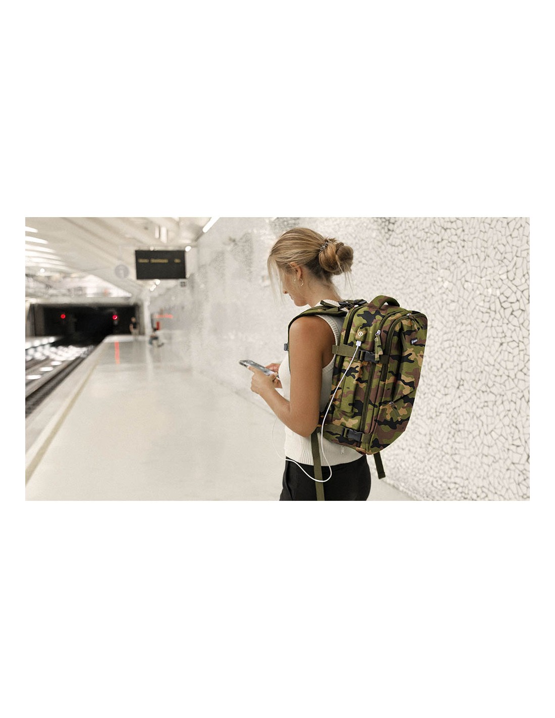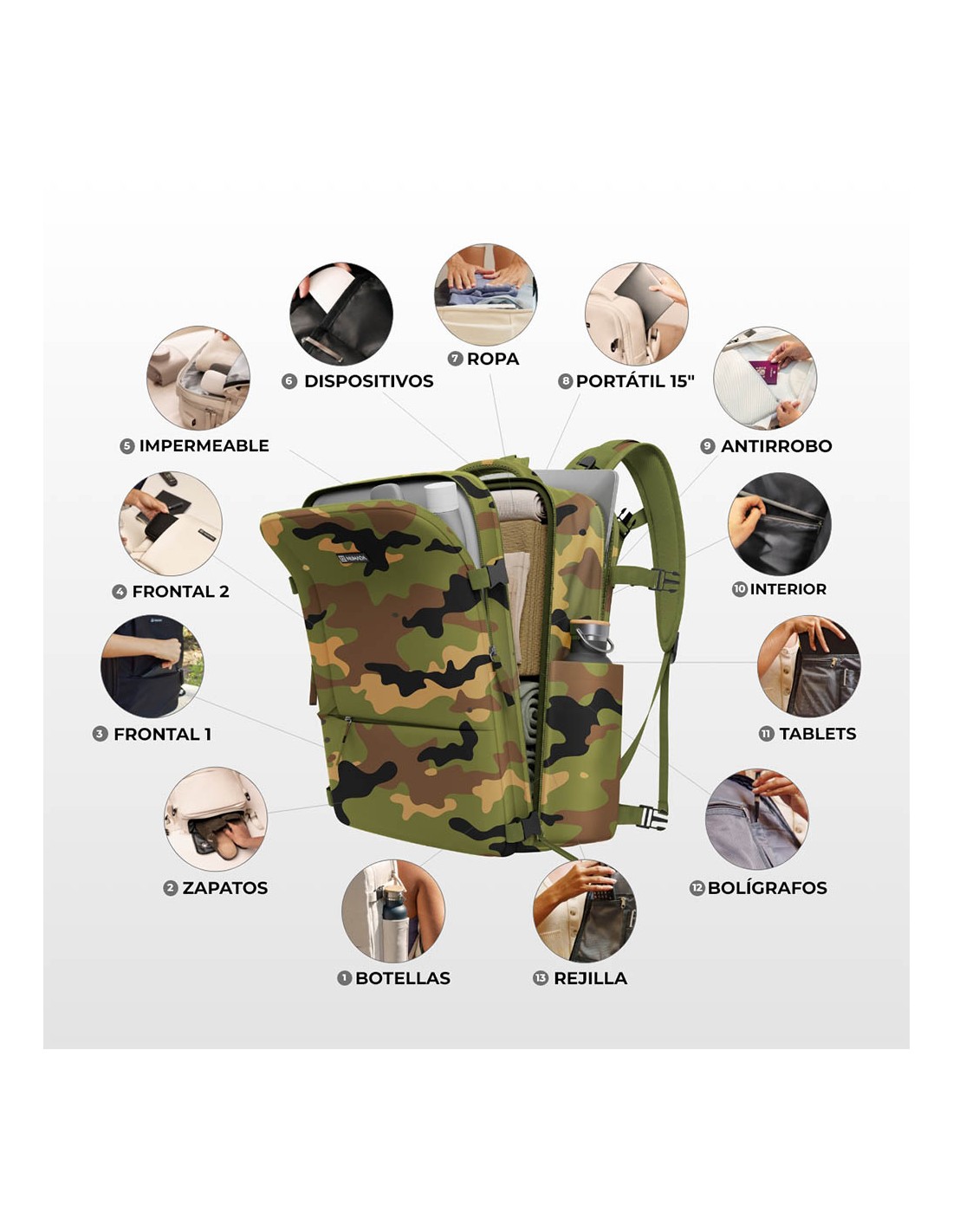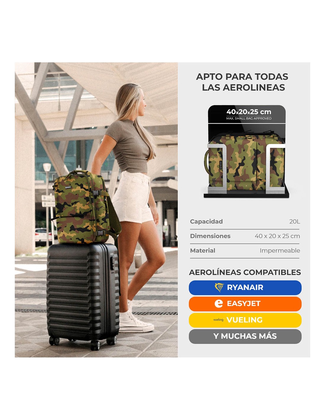 Mochila de avion con capacidad de almacenaje de 20 l. caracteristicas: resistente al agua y rozaduras, multiples bolsillos, puerto de carga exterior usb, doble asa de transporte y bolsillo para portatil de hasta 15".