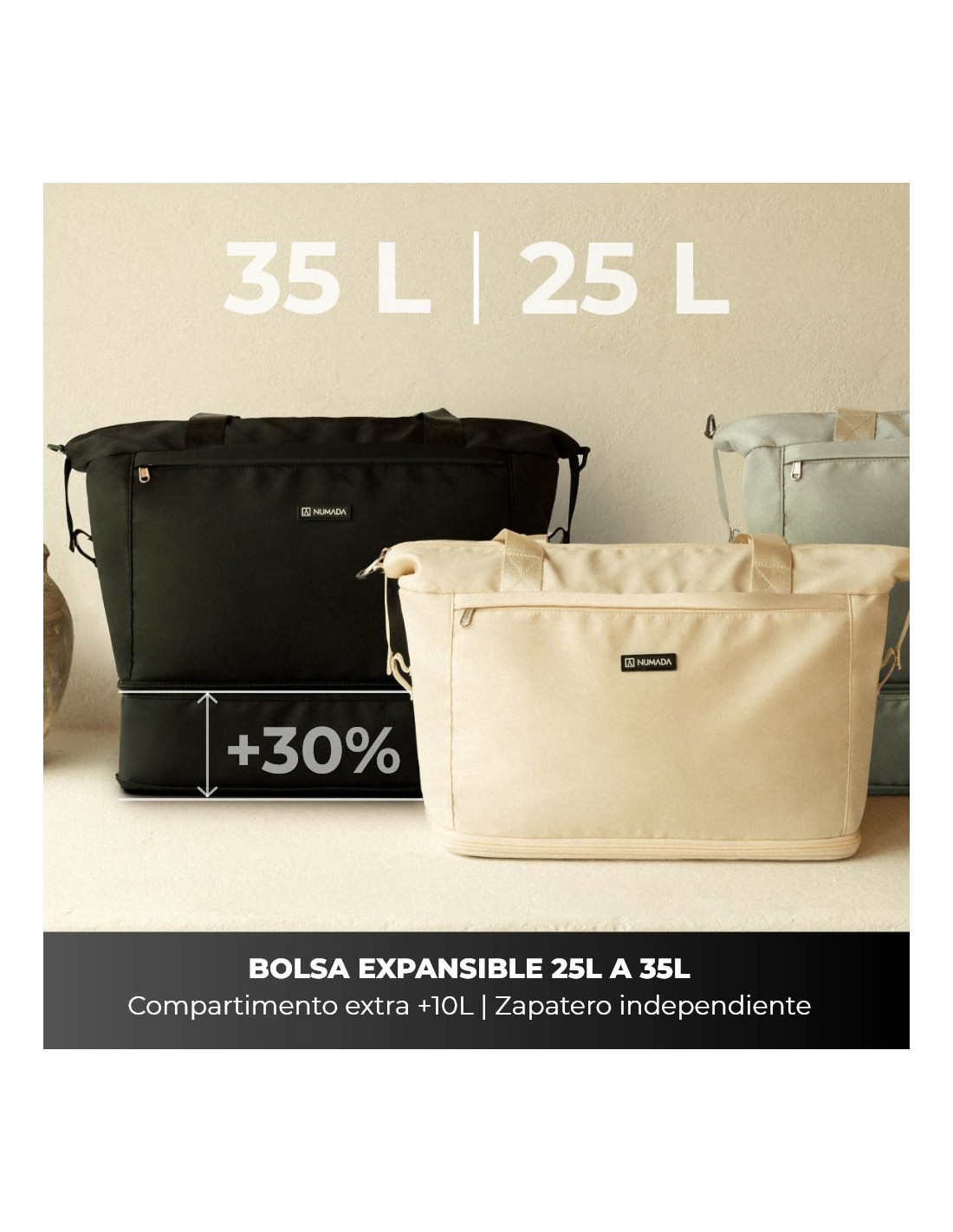 Bolsa de avion con capacidad expandible de 25 – 35 l. apta para aerolineas de bajo coste. caracteristicas: bolsillo para portatil de hasta 15”, resistente al agua y rozaduras, bolsillo zapatero extra con capacidad 10 l, 2 asas, cinta para hombro y cinta para llevar en maleta. color: beige
