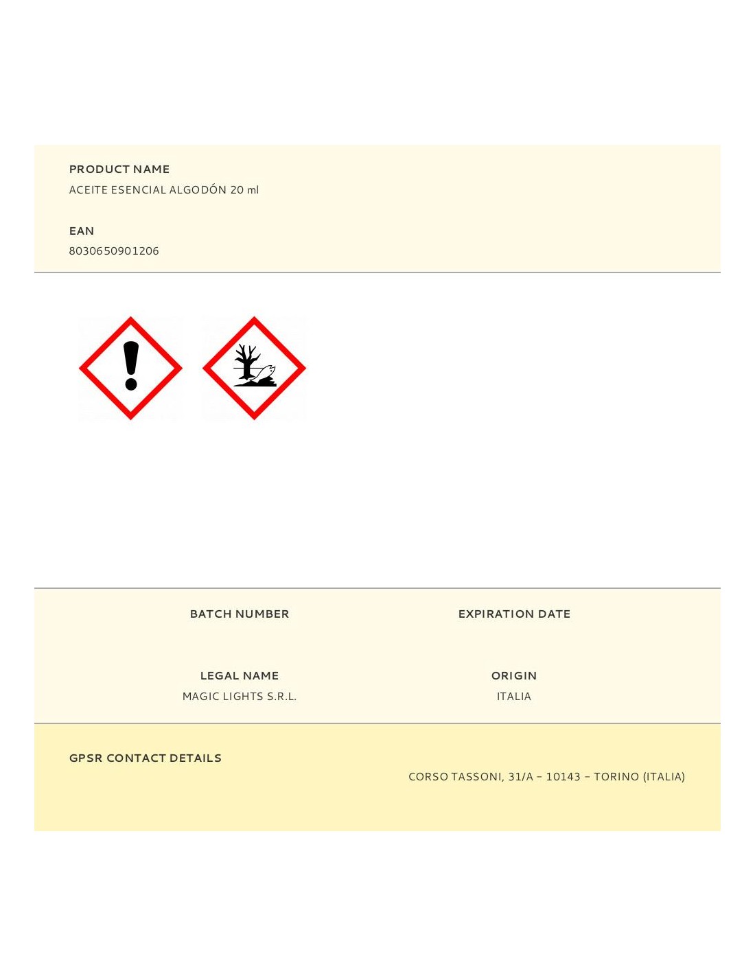 Aceite esencial algodón, se puede utilizar para usos relajante, masajes, ambientador natural, etc. contiene 20 ml