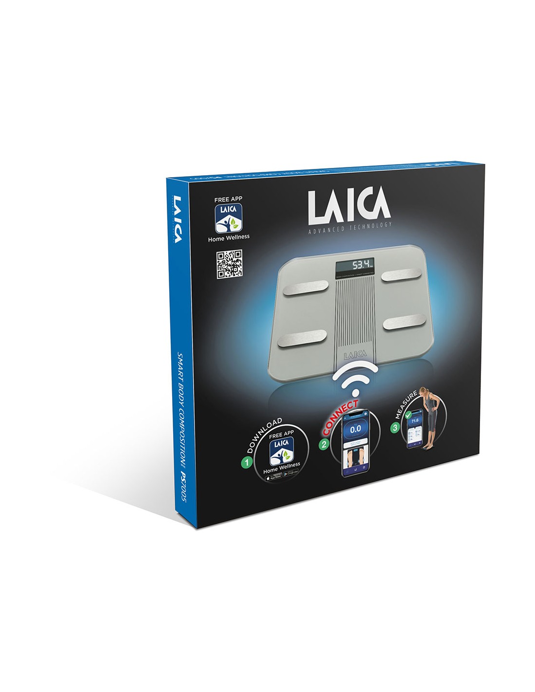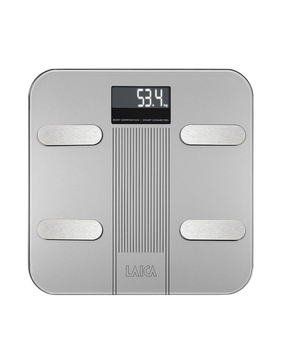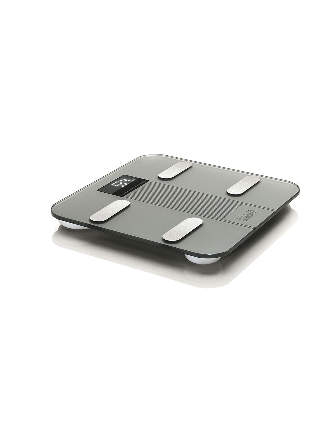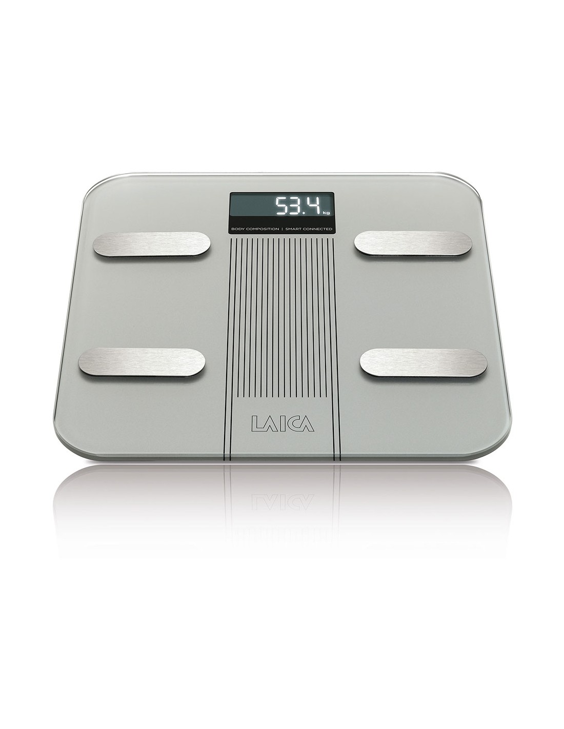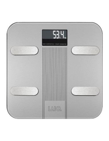 Báscula de baño electrónica bluetooth con cálculo de la composición corporal, de color plateado. batería alcalina 3 x aaa 1,5 v (no incluidas). calcula el % de: masa grasa, de agua, musculatura esquelética, metabolismo basal y el índice de masa corporal (imc). peso máximo 180 kg. envía automáticamente los datos de la composición corporal por bluetooth 4.0 u superior. material vidrio templado 6 mm de grosor. temperatura +10c + 40c. humedad 85%. 28 x 28 x 2,8 cm
