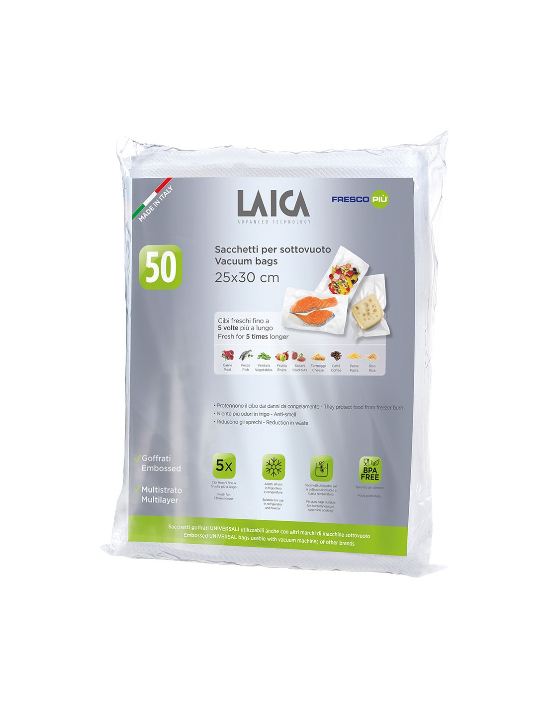 Bolsas para envasar al vacío 25 x 30 cm. para conservar tanto en la nevera como en el congelador. para cocción al vacío a baja temperatura ( 70 c máximo 6 h / 100 c máximo 15 min). protegen los alimentos de deterioros por congelación. para reutilizar la bolsa, cortar por debajo del sellado. compatible con otras marcas de sellado. 50 uds