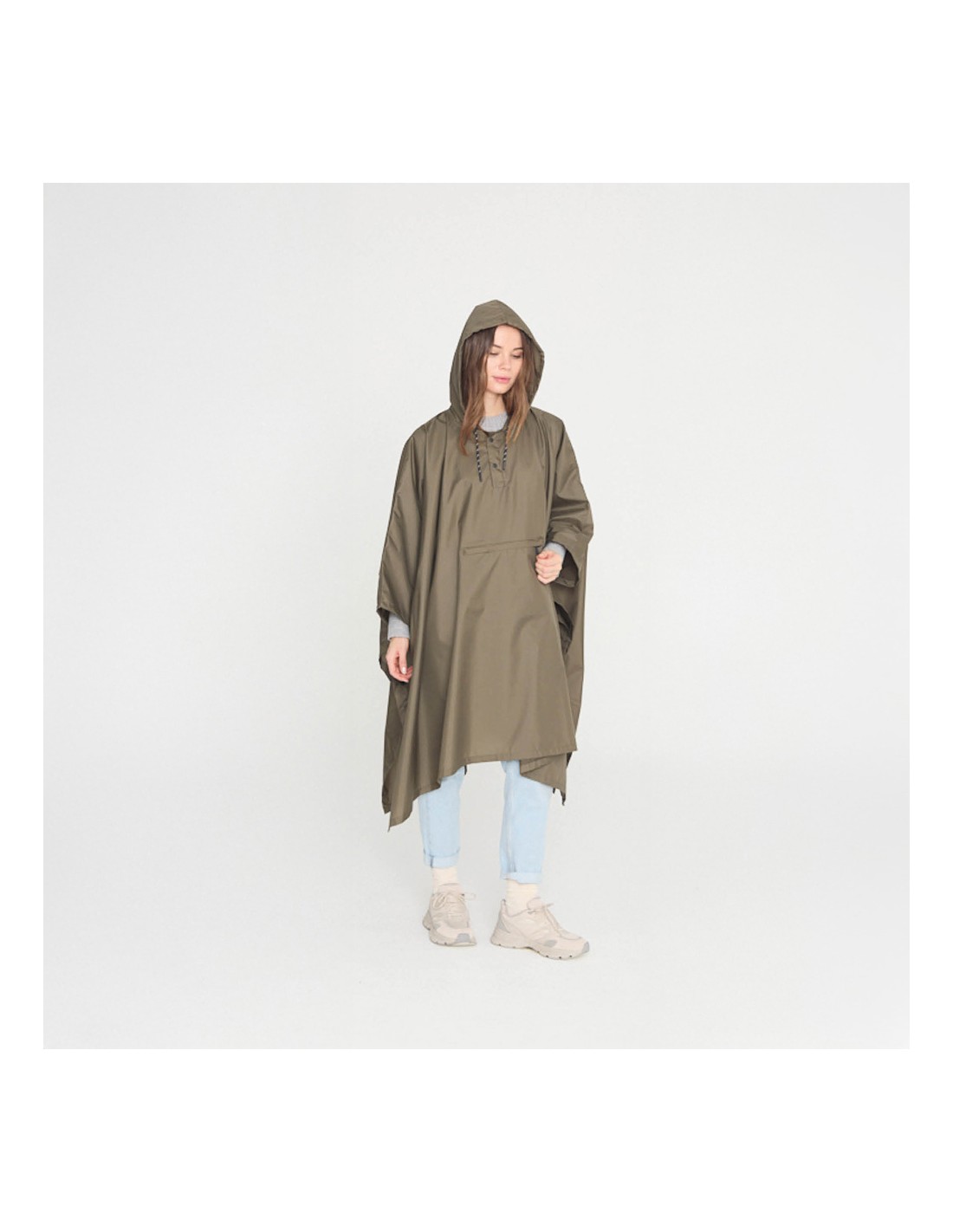 Poncho chubasquero plegable verde kaki. material: poliester reciclado. talla única. medidas: 146 x 95 cm