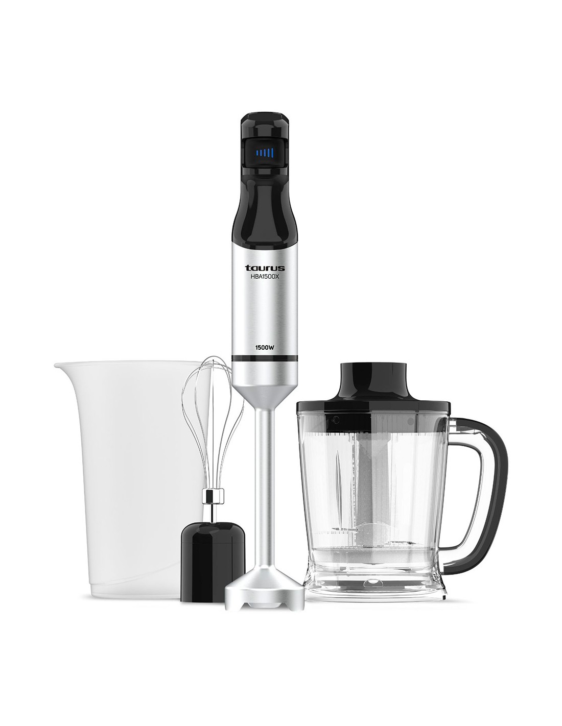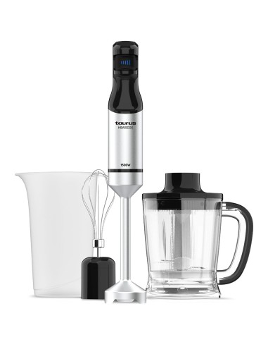 Batidora de mano 1500 w con tecnología stepless para ajustar la velocidad desde el pulsador. cuchillas y varilla de acero inoxidable de alto rendimiento. diseño ergonómico con agarre soft-touch. campana antisalpicaduras. libre de bpa, accesorios aptos para lavavajillas. incluye vaso medidor 700 ml, accesorio picador y emulsionador