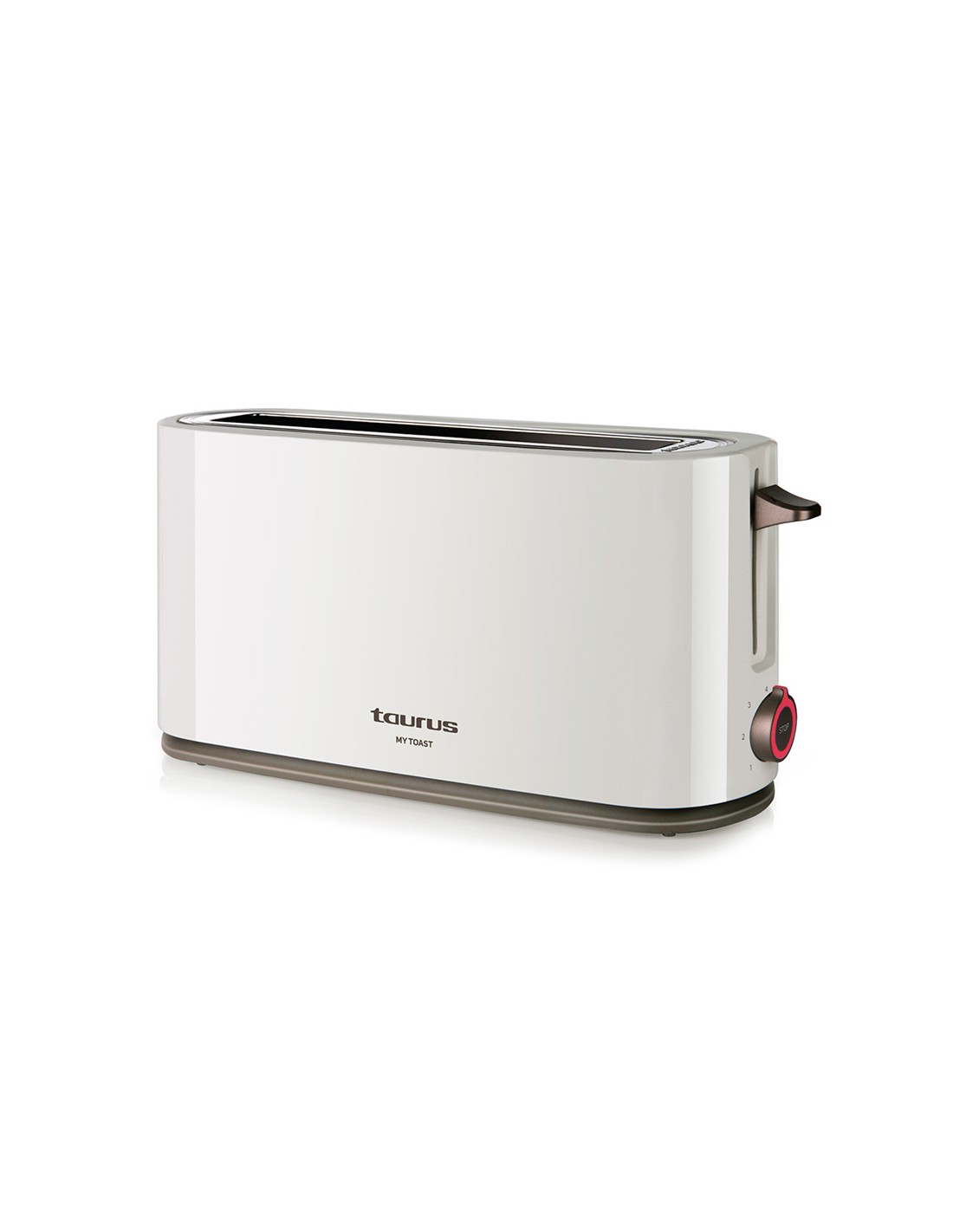 Tostador mytoast 1000 w, ranura larga de 38 x 260 mm. 7 niveles de tostado ajustables, sistema de auto centrado, elevación extra y stop. incluye bandeja recogemigas extraíble y pies antideslizantes. con alojamiento para el cable