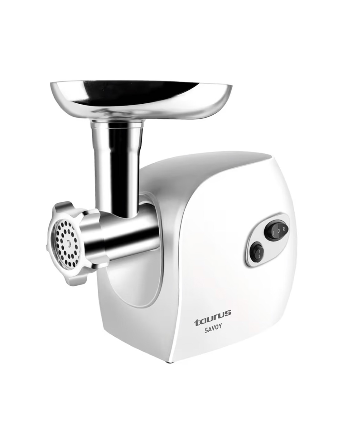 Picadora savoy 450 w con 3 cuchillas para 3 tamaños de picado. con potencia máxima bloqueada de 1200 w. función reverse. bandeja y tubo alimentador de metal. incluye accesorio kebbe y accesorio embutidor