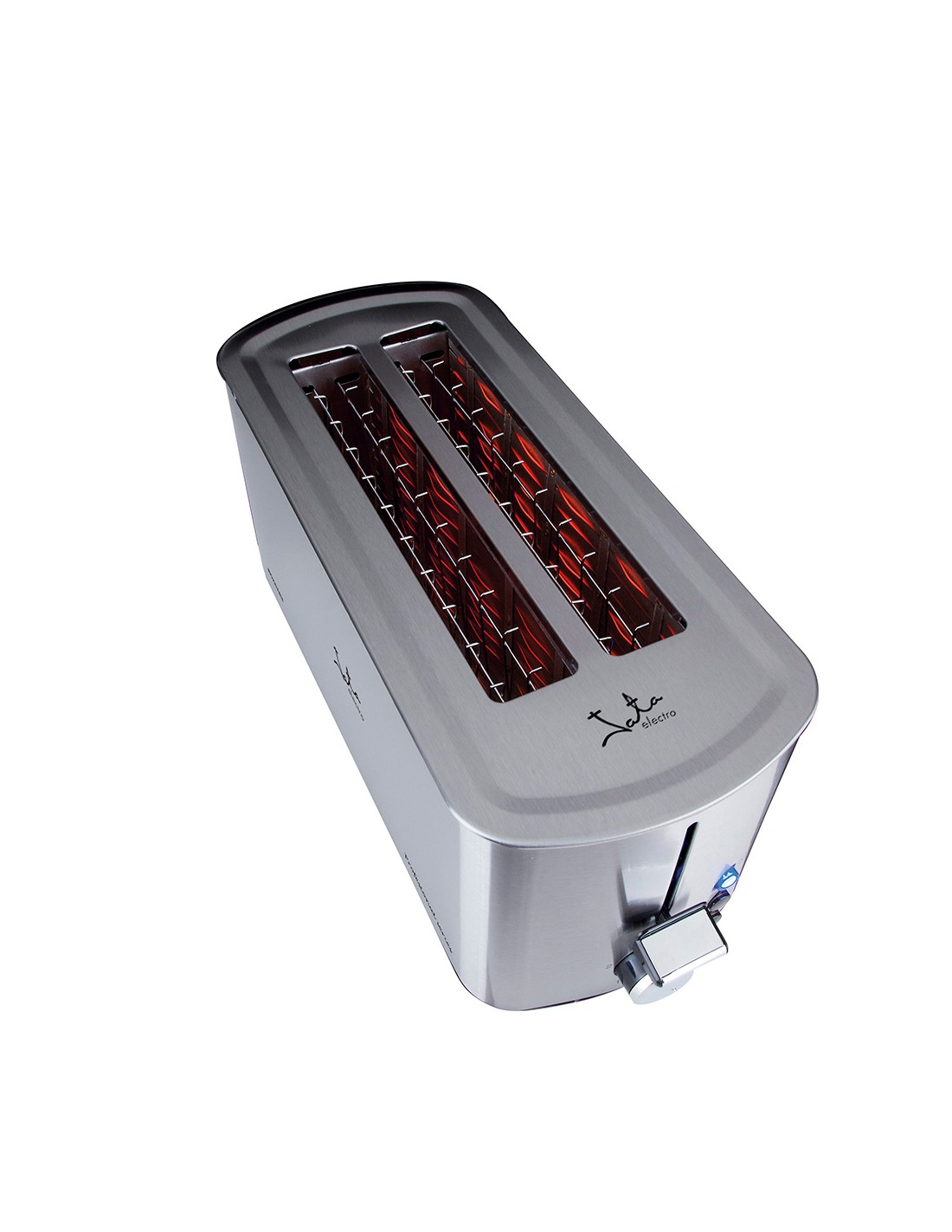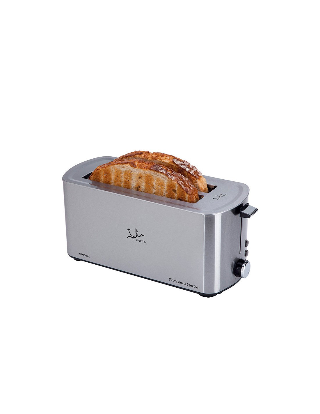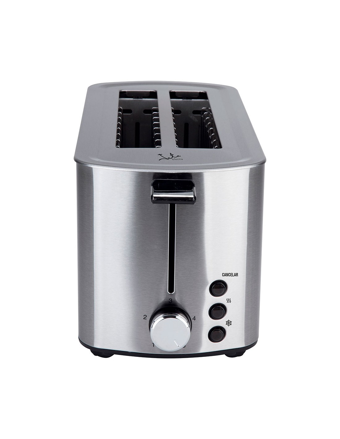 Tostador con cuerpo en acero inoxidable. dos ranuras de 40 x 255 mm. centrado automático del pan. selector electrónico de tostado. 5 posiciones. 2 funciones: descongelación y mantenimiento de calor. pulsador de parada voluntaria. bandeja recogemigas. indicadores luminosos y recogecable. voltaje 230 v. potencia max. 1.400 w