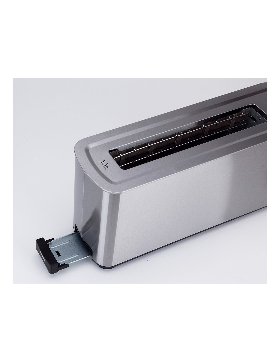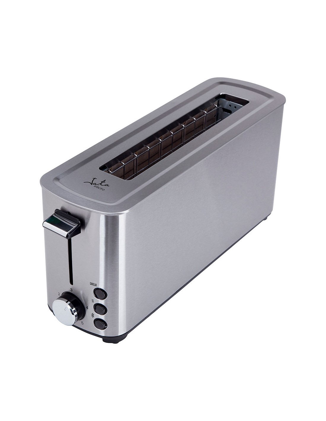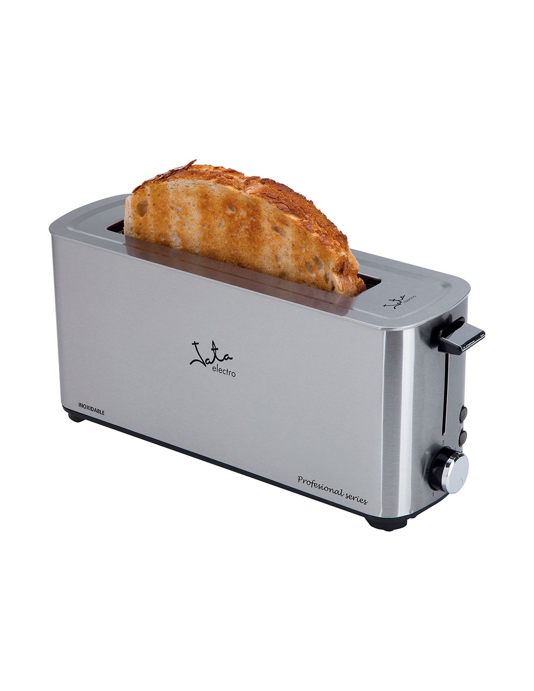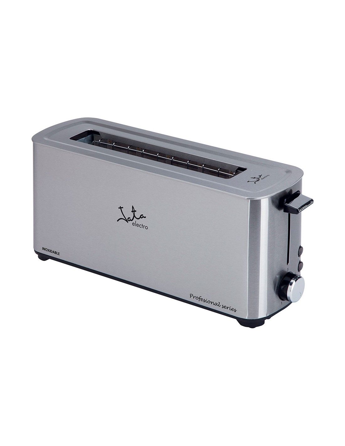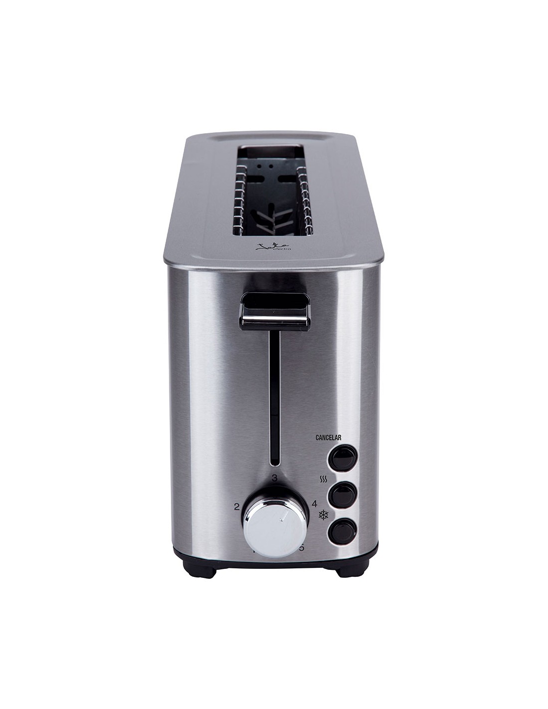 Tostador con cuerpo en acero inoxidable. ranura ancha de 40 mm para todo tipo de pan, centrado automático del pan. selector electrónico de tostado. 5 posiciones. 2 funciones: descongelación y mantenimiento de calor. pulsador de parada voluntaria. bandeja recogemigas. indicadores luminosos y recogecable. voltaje 230 v. potencia máx. 1.000 w