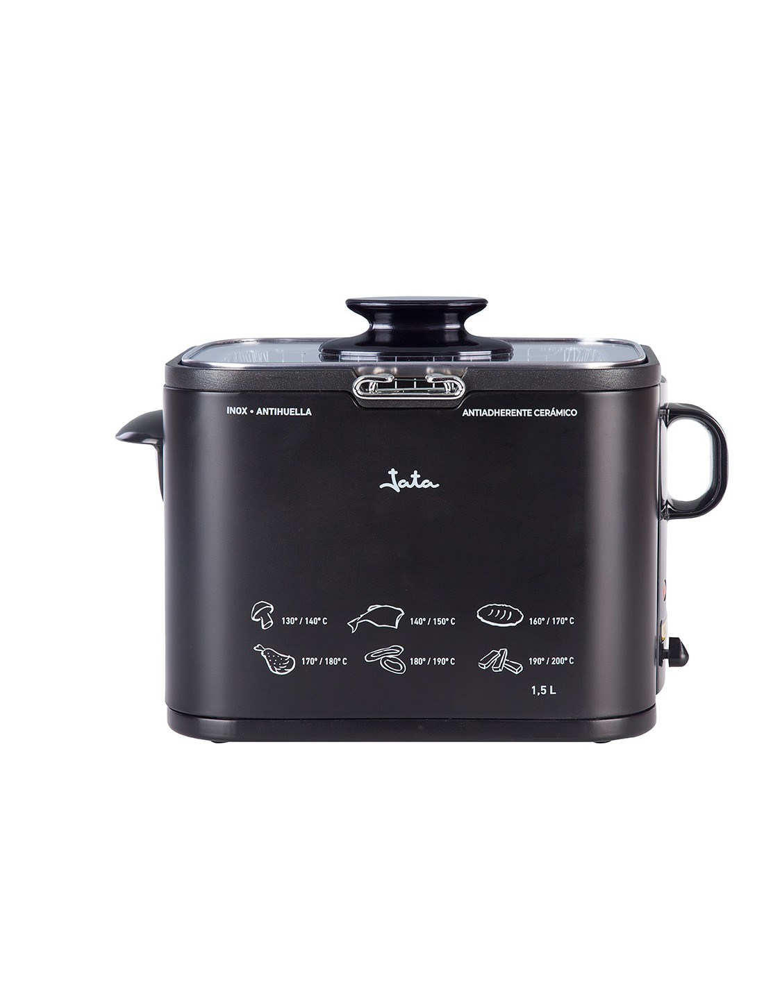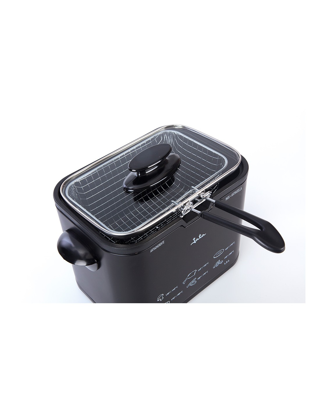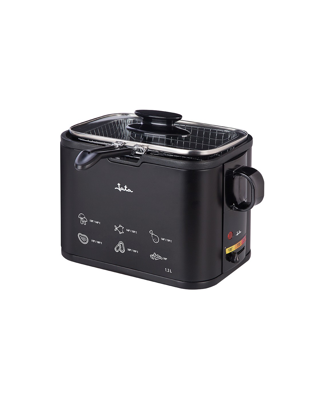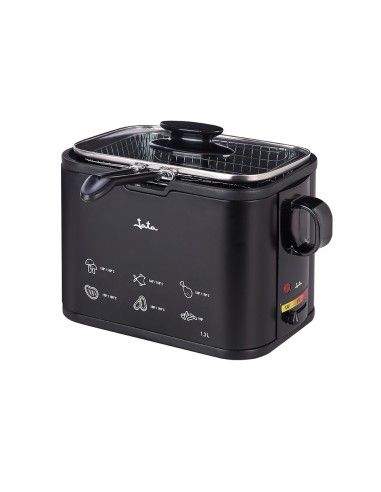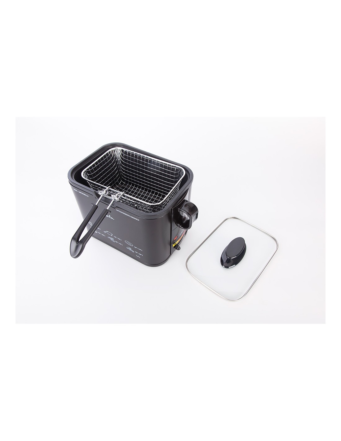 Freidora 1,3 l 1000 w. cuba con antiadherente libre de pfoa. recubrimiento exterior de silicona. exterior de alta resistencia. estructura metálica 100%. cuerpo antihuella. termostato regulable de temperatura. tapa de cristal con asa. resistencia inyectada. cestillo con asa. asas laterales. indicador luminoso. fácil limpieza. voltaje 230 v
