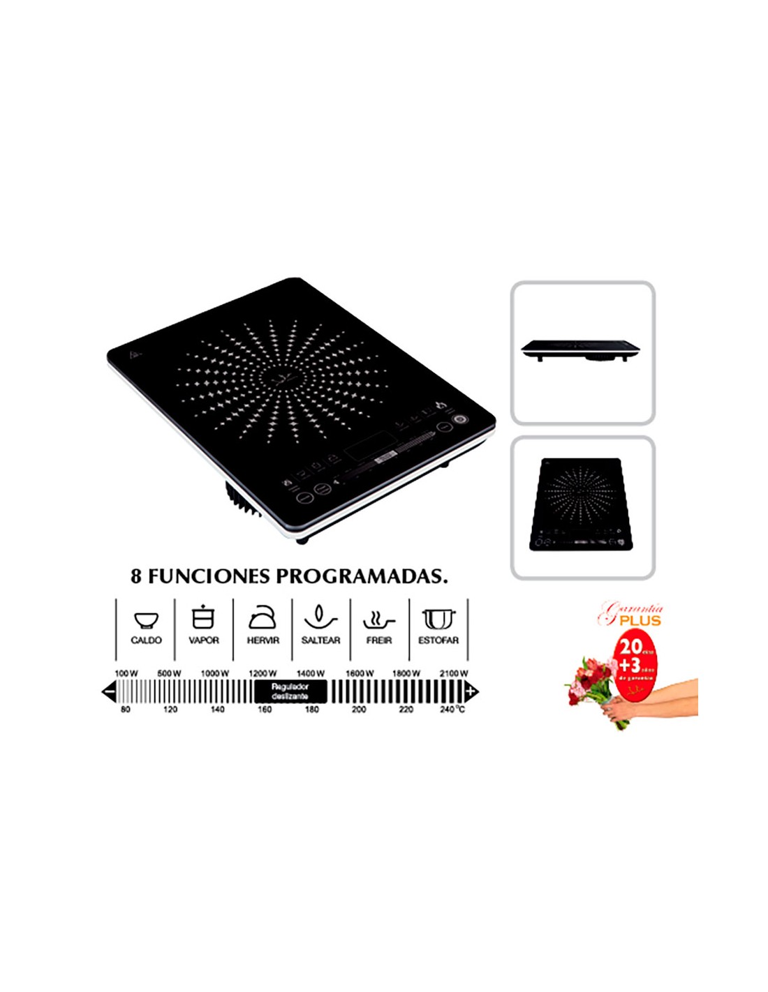 Cocina eléctrica de 1 placa calorífica de inducción. superficie de cristal de 4 mm. 8 funciones programadas. pulsadores táctiles: encendido / apagado y selector de funciones. ajuste del tiempo programado. pausa. regulador deslizante de potencia y temperatura. diámetros de funcionamiento: 120 - 260 mm. display led. indicadores luminosos. protección contra sobrecalentamiento. voltaje 230 v. potencia 2100 w